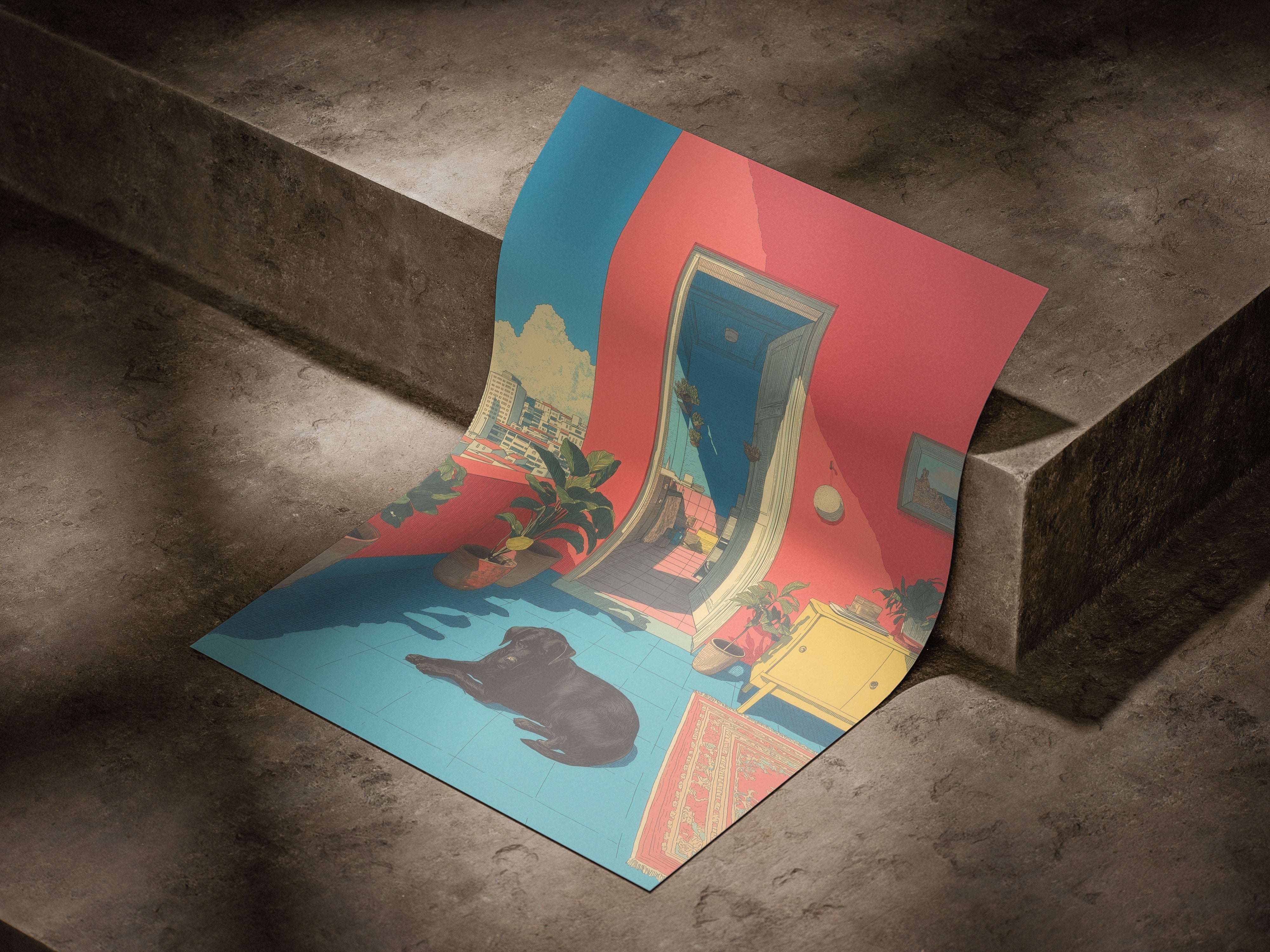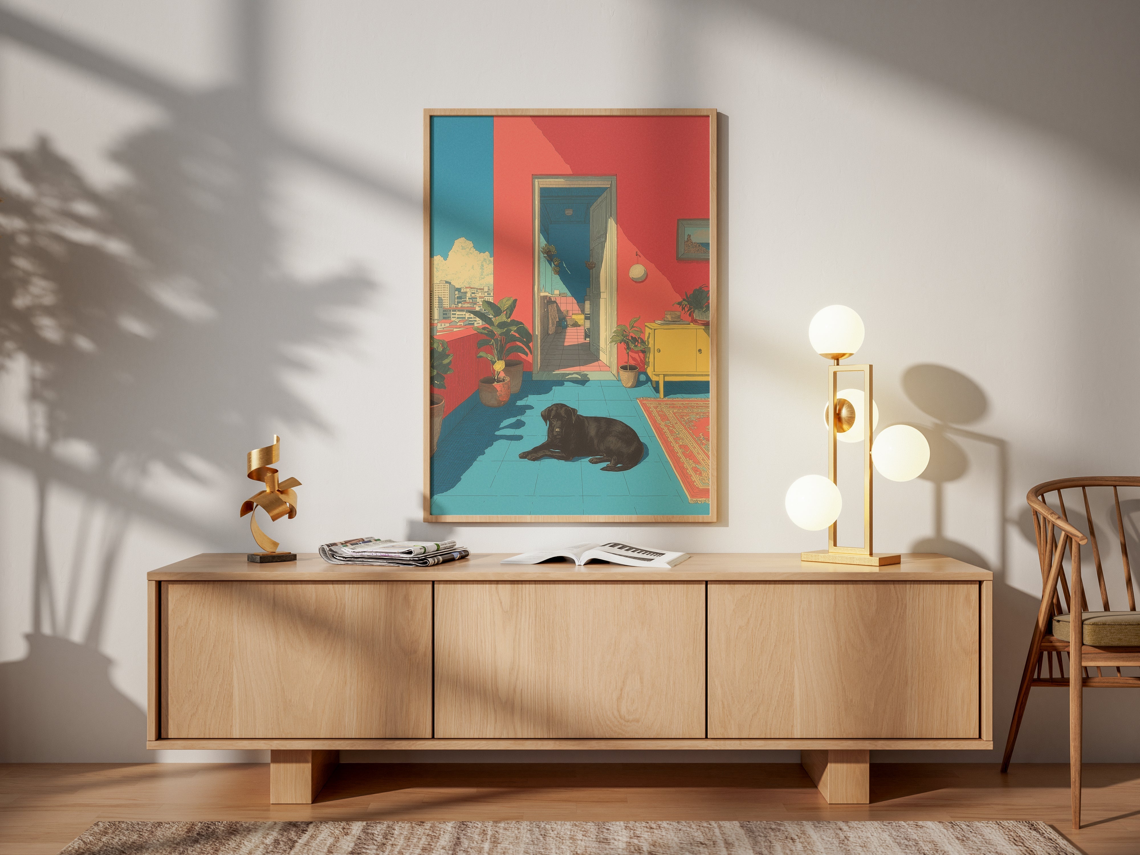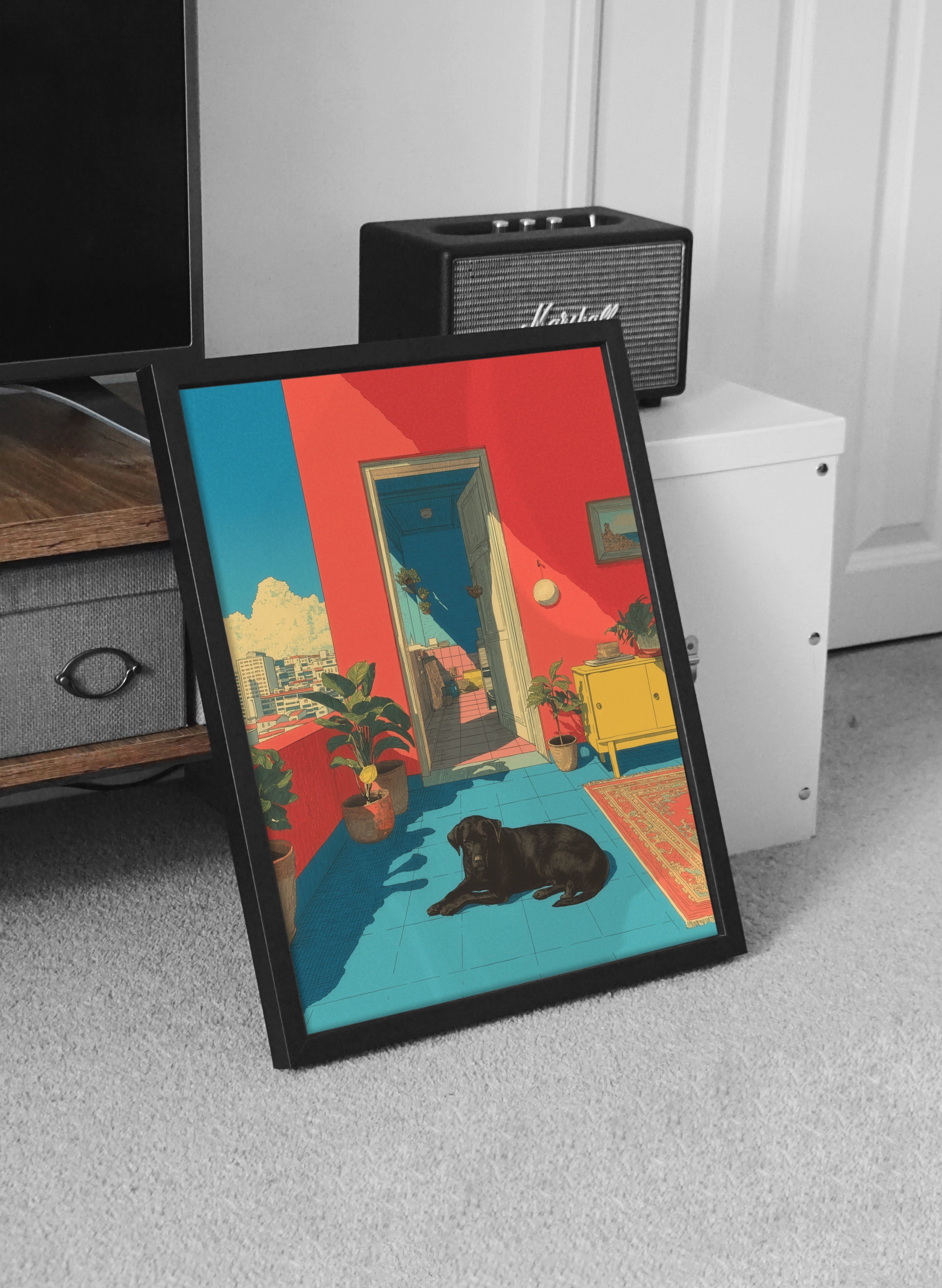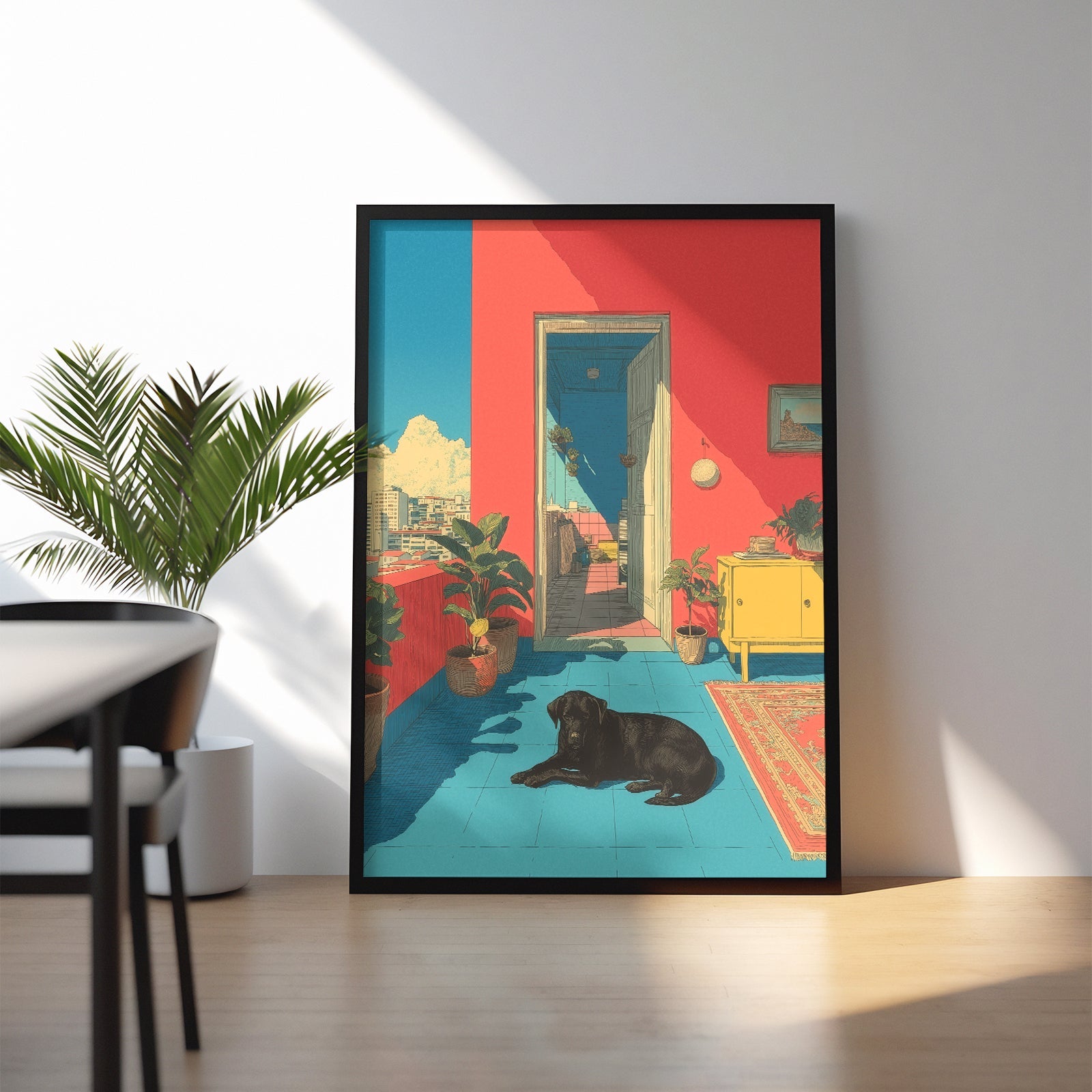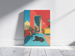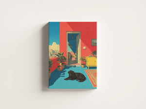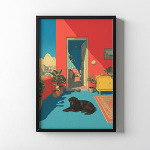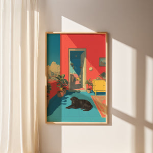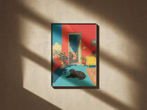 Afternoon on the Balcony captures a quiet domestic moment suspended in warm light. Bold red walls meet cool blue tiles as sunlight stretches across the floor, where a black dog rests in calm stillness. Framed by open doors, potted plants, and distant city views, the scene evokes comfort, routine, and the beauty of unremarkable moments. A balanced composition of color and geometry, this artwork brings warmth, familiarity, and gentle nostalgia into any space.
