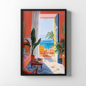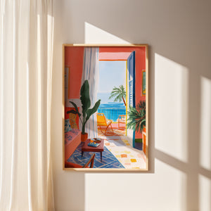 This painting captures the quiet luxury of a moment suspended between inside and outside. Warm coral walls and patterned floors cradle the calm of an interior, while the open doorway invites the vast blue of the sea and sky to step closer. Sunlight spills gently across the room, touching plants, fabric, and objects as if time itself has slowed to breathe.
