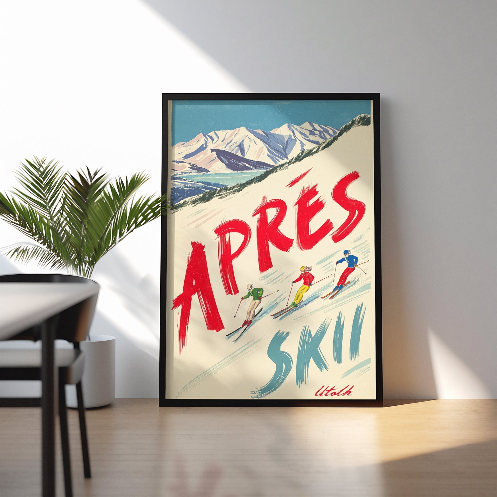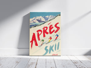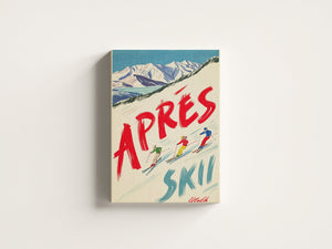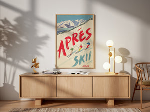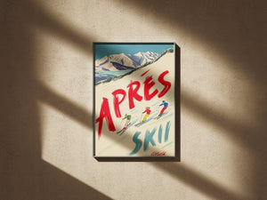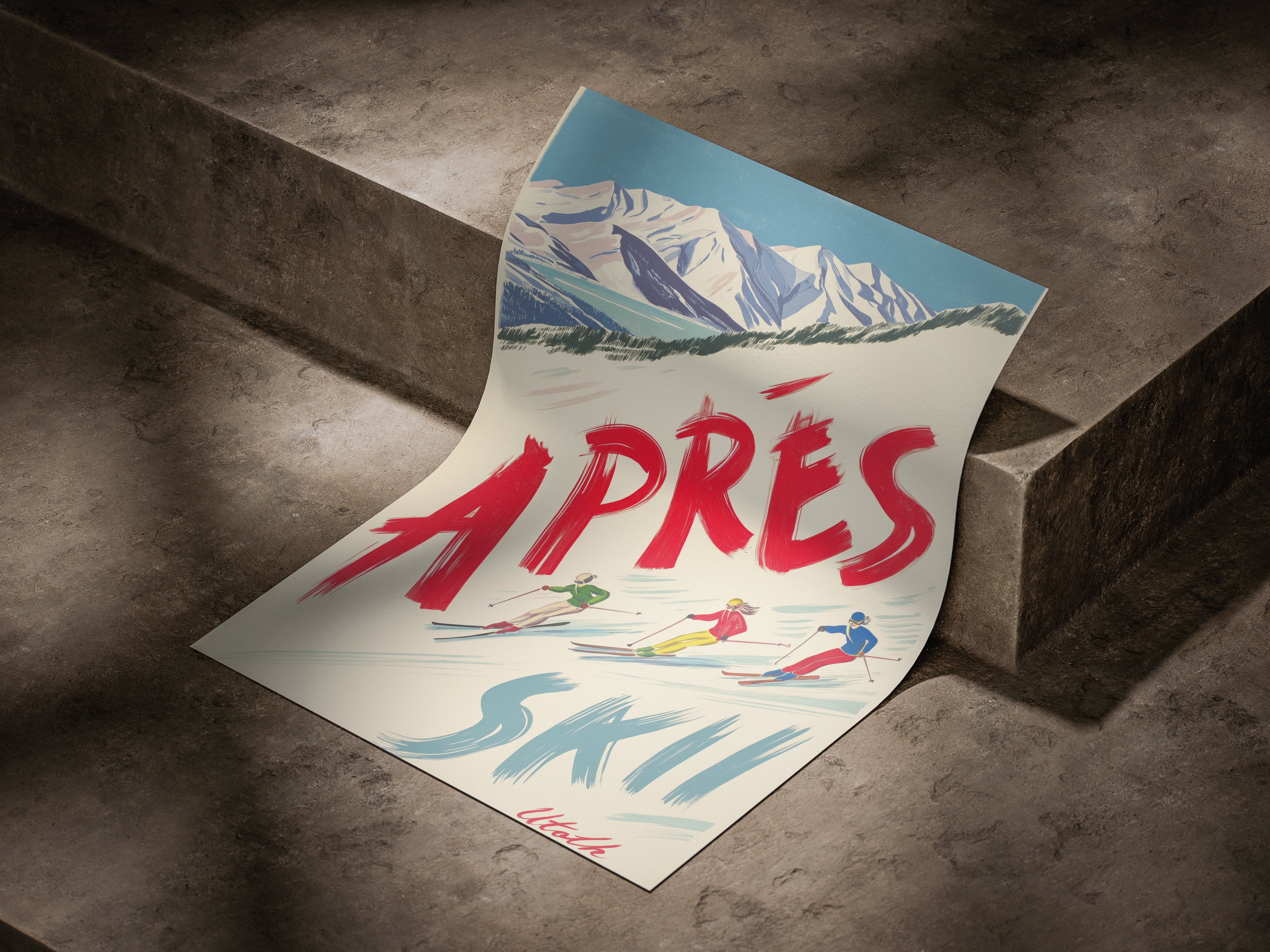 Bold brushstrokes cut through the snow as skiers descend in rhythm, framed by distant mountains and open winter air. Color leads the motion red, blue, yellow each figure moving freely, effortlessly, alive in the slope’s momentum. Après Ski captures the spirit of classic alpine posters: not the cold of winter, but its joy; not precision, but feeling. A celebration of movement, leisure, and the timeless romance of the mountains.