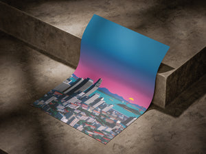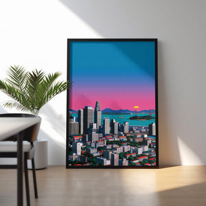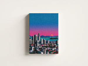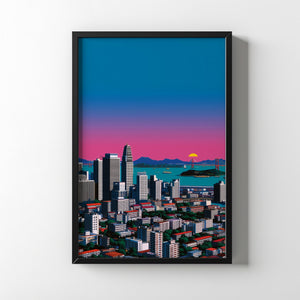Under a vast evening sky, the city settles into silence as distant mountains watch from afar. The fading light paints the skyline in soft blues and pinks, blurring the line between nature and concrete. In this quiet moment, the city feels small yet grounded resting peacefully beneath an endless sky, carrying the calm of a day gently coming to an end.