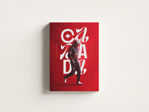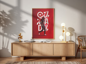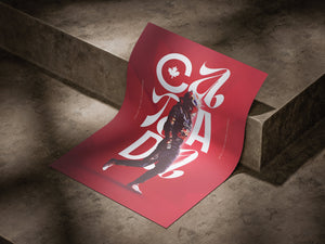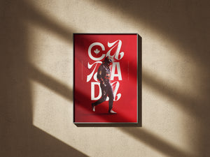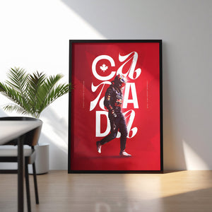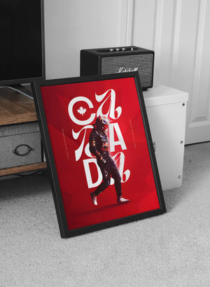Celebrate the thrill of Formula 1 with this striking Canada Grand Prix poster. Designed in bold red tones inspired by the Canadian flag, it features a race driver mid-stride, layered with elegant typography spelling “CANADA” and a maple leaf emblem.
