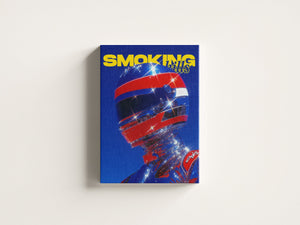 The piece captures the tension between anonymity and power transforming the racer into a symbol of pure momentum.