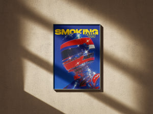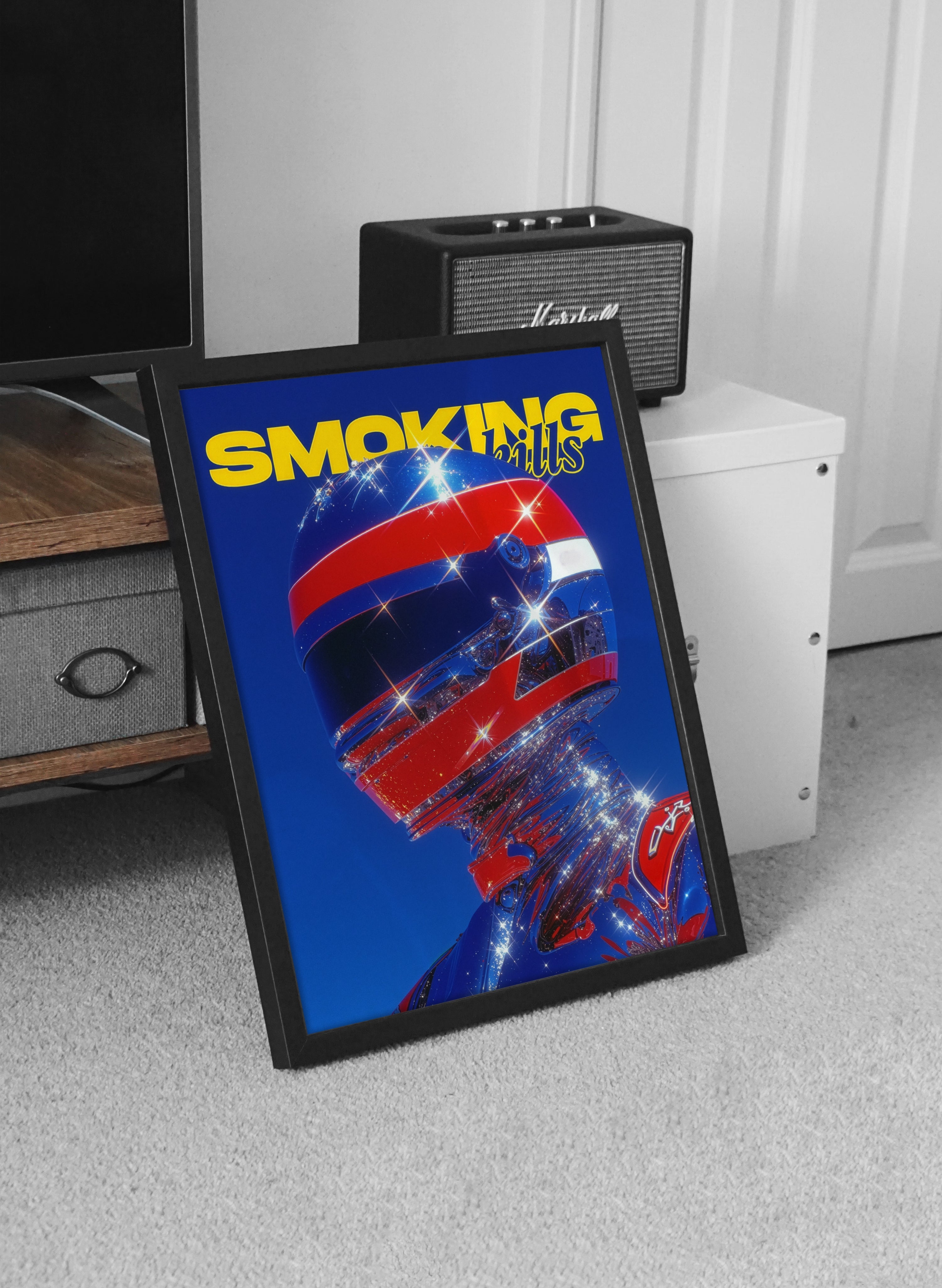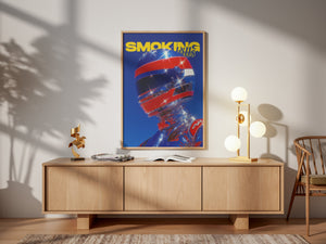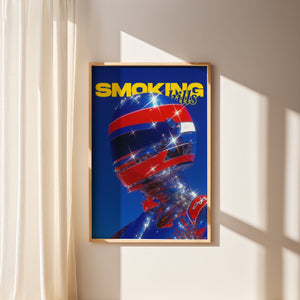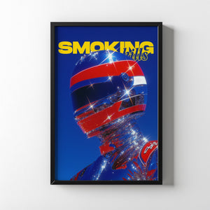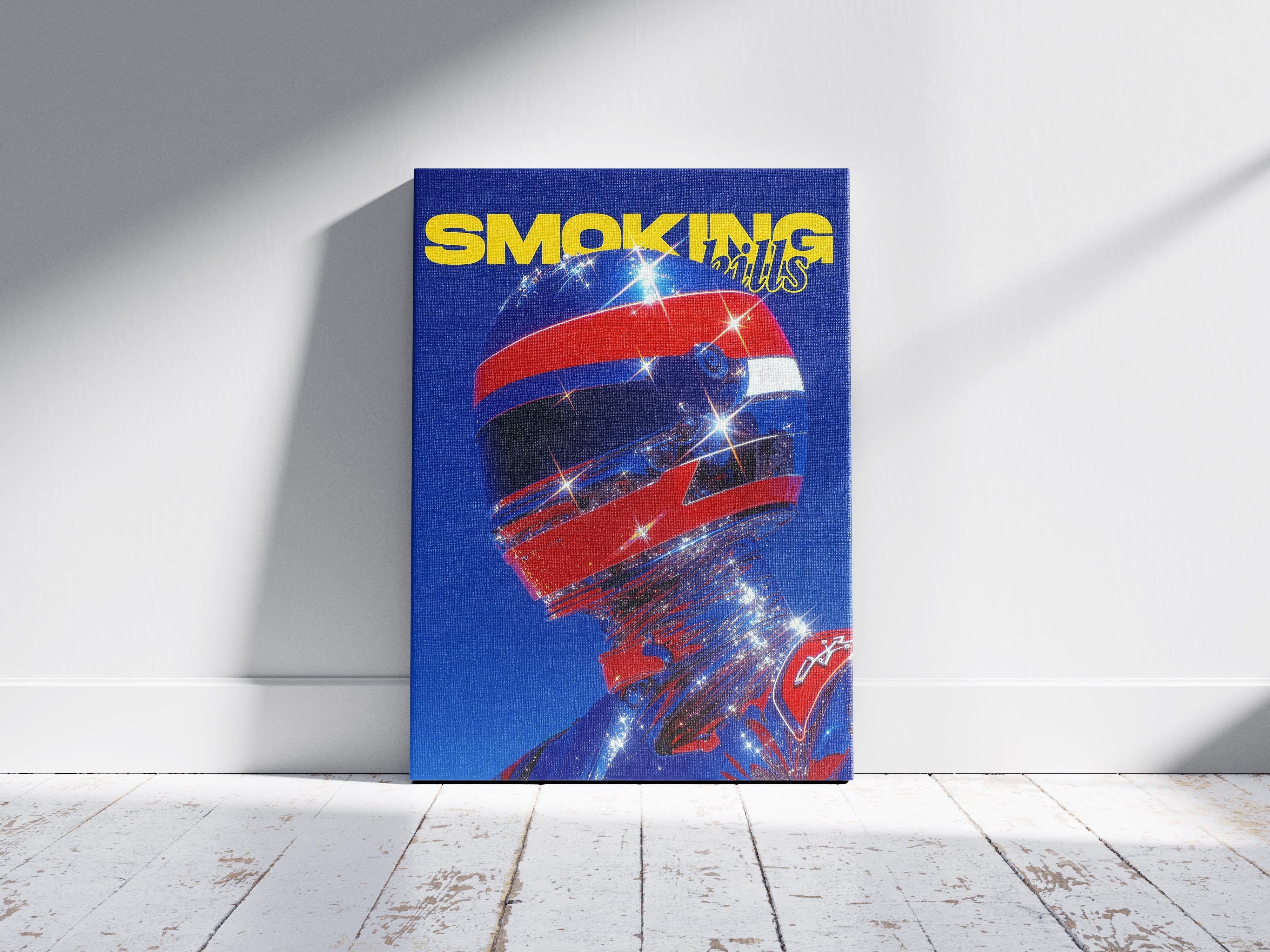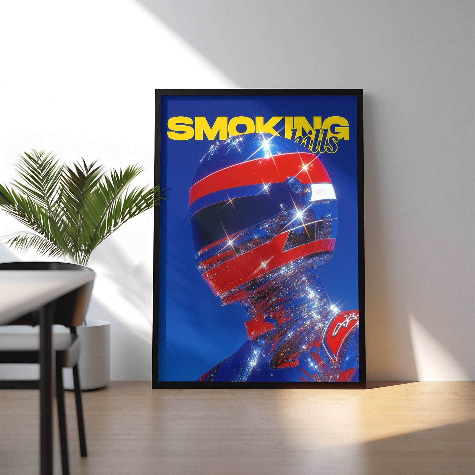“Chrome Velocity” explores the merging of human identity with high-speed futurism. The reflective helmet and chrome-coated suit refract light into sparkling fragments, turning the figure into a sculptural icon of motion and spectacle. Bold primary colors intensify the energy of the composition and evoke the glossy visual language of retro racing magazines and sci-fi pop culture.