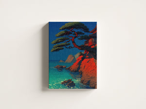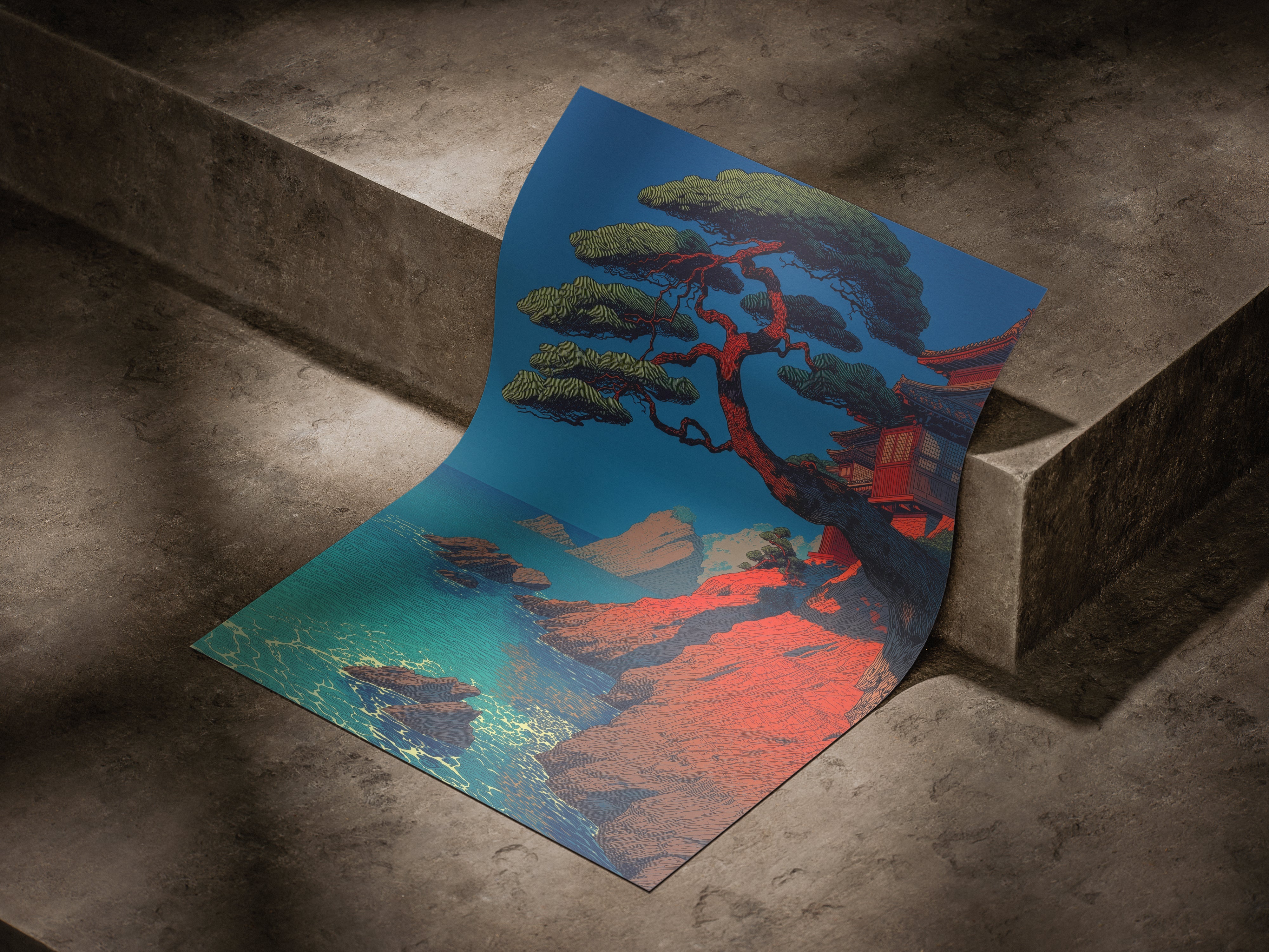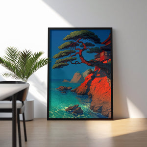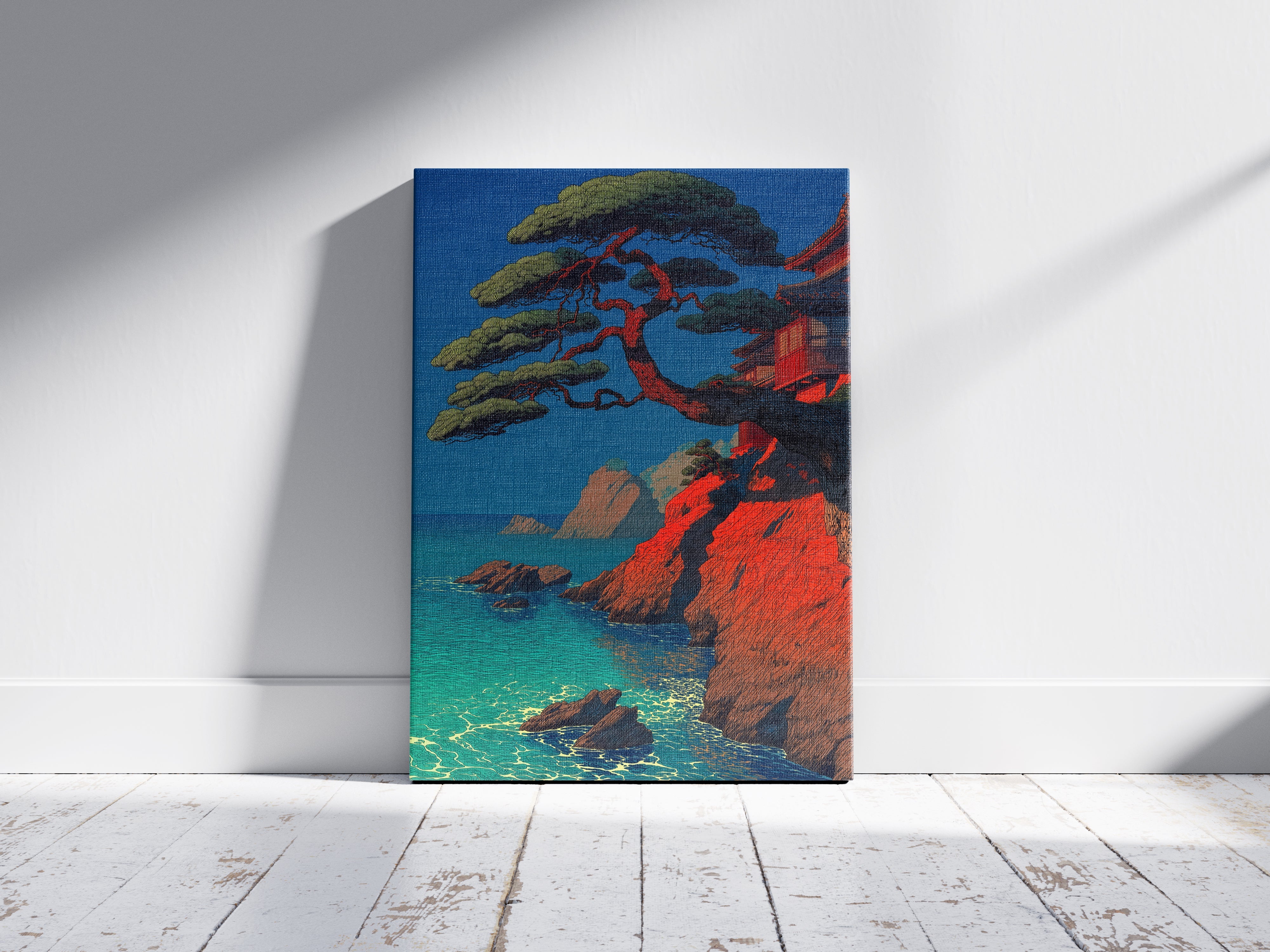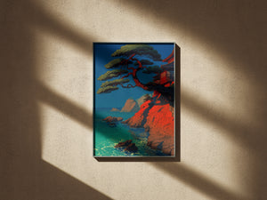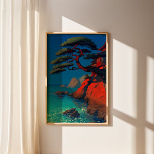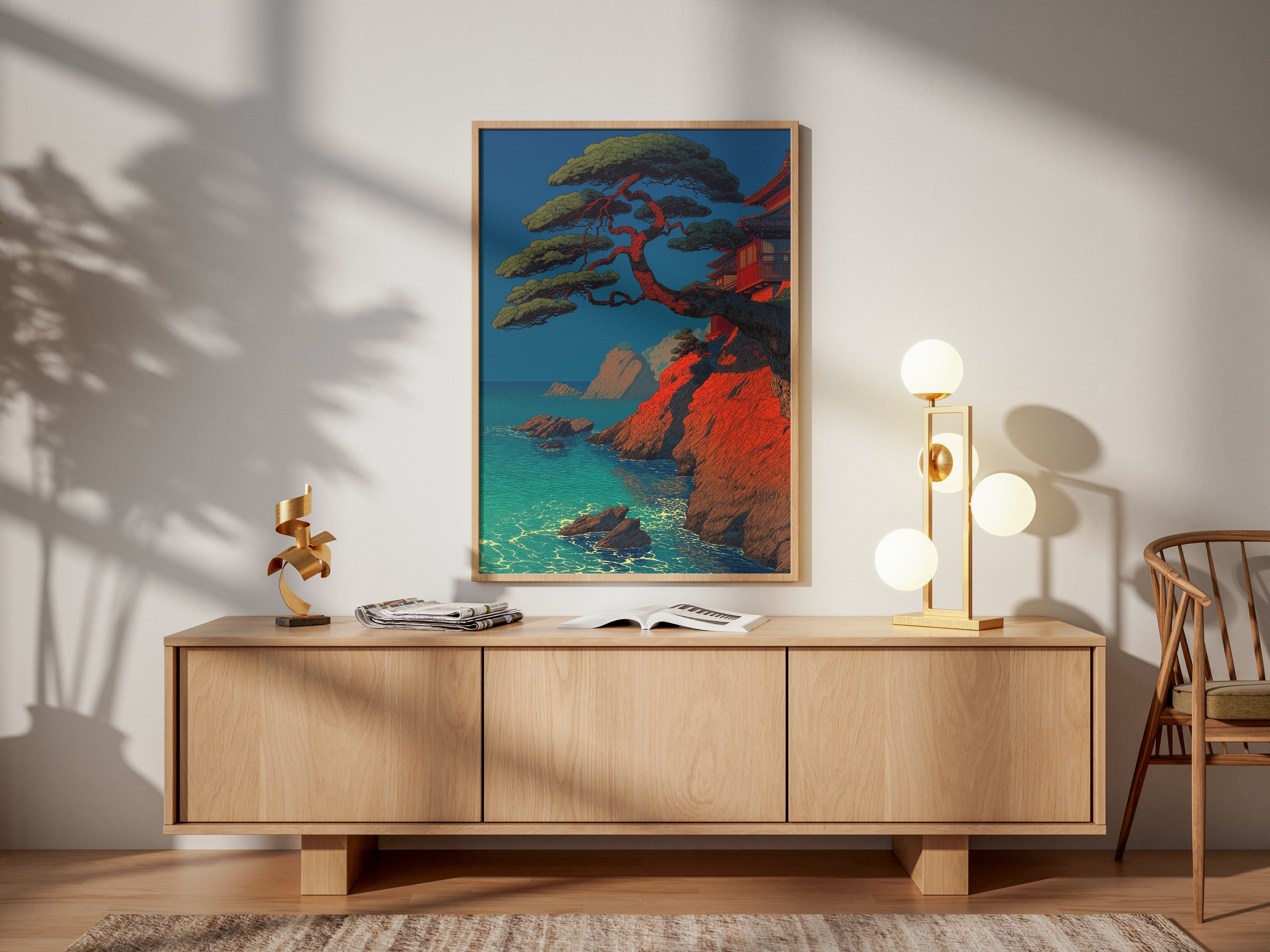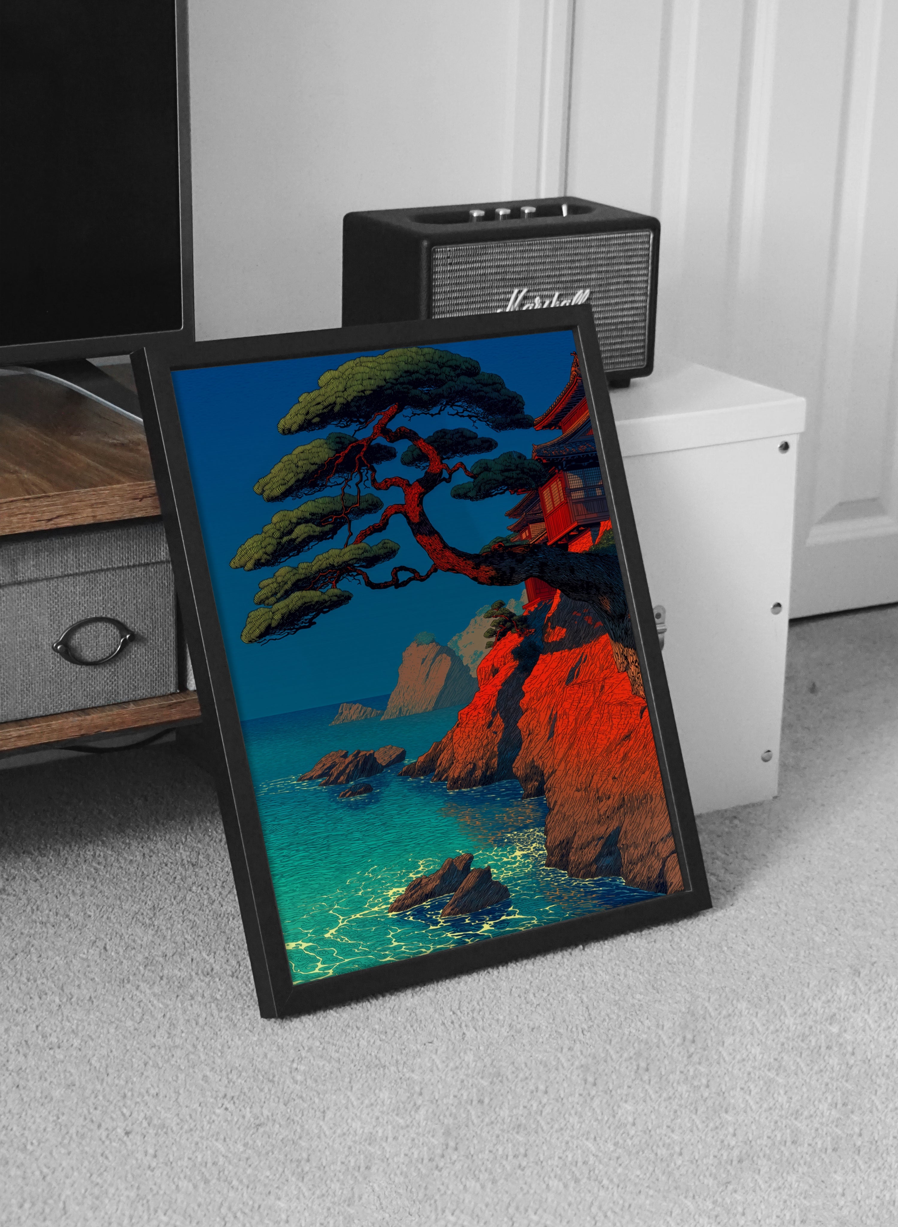 Cliffside Stillness captures a solitary tree stretching over rugged coastal cliffs, suspended between land and sea. Inspired by traditional Japanese woodblock aesthetics, the composition balances movement and calm the restless water below contrasted with the quiet endurance above. Rich blues, deep reds, and precise linework evoke contemplation, resilience, and the timeless dialogue between nature’s forces. A bold yet meditative piece designed to anchor a space with depth and presence.