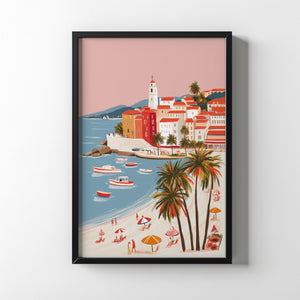 Sun-washed buildings rise above a gentle curve of sea, where small boats drift lazily and palm trees frame the shore. Below, quiet beach scenes unfold under striped umbrellas, capturing the effortless rhythm of Mediterranean afternoons. A celebration of warmth, color, and the simple luxury of time moving slowly.