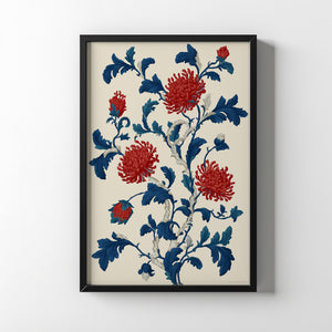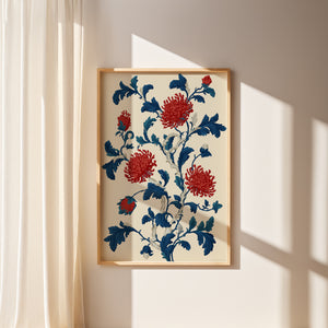 Rich red florals rise against deep blue foliage, creating a striking contrast that speaks of passion, resilience, and refined beauty.