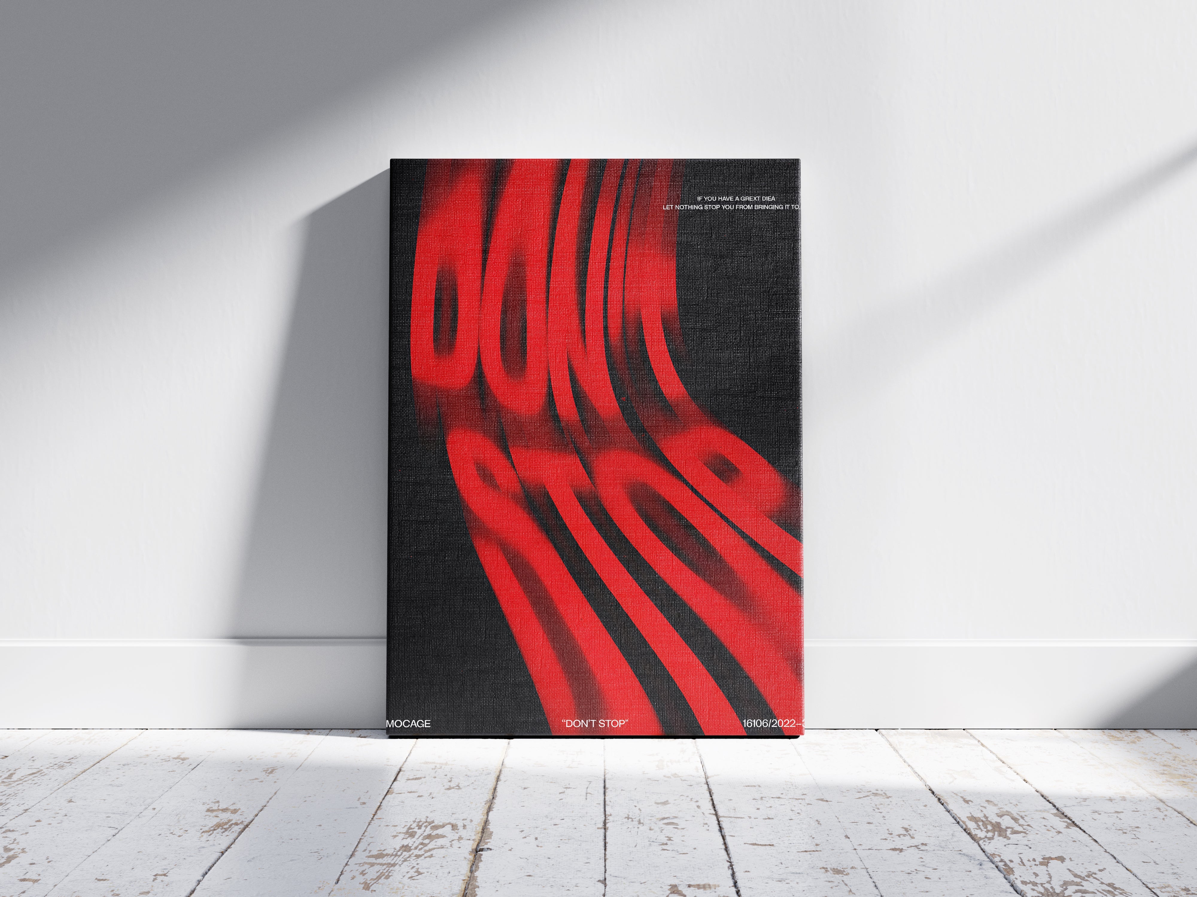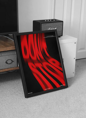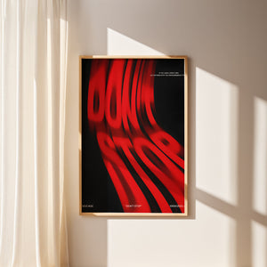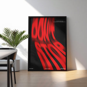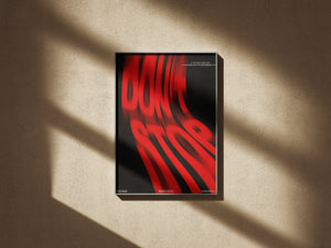 Unleash the energy of determination with this striking “DON’T STOP” poster a bold statement piece inspired by kinetic motion design and raw visual power. The deep black background and vivid red warped typography create a dynamic illusion of speed and persistence, symbolizing movement, ambition, and drive.