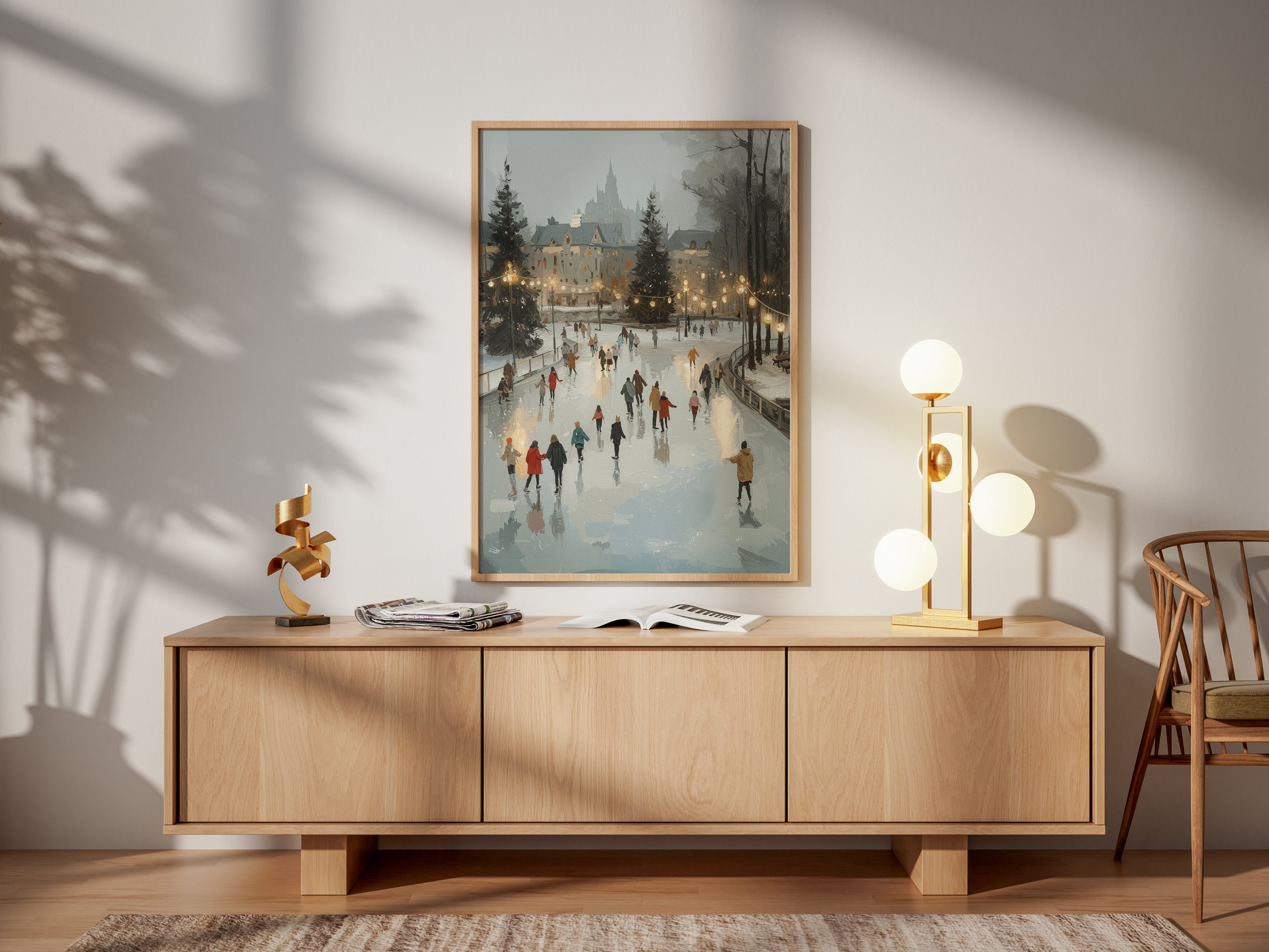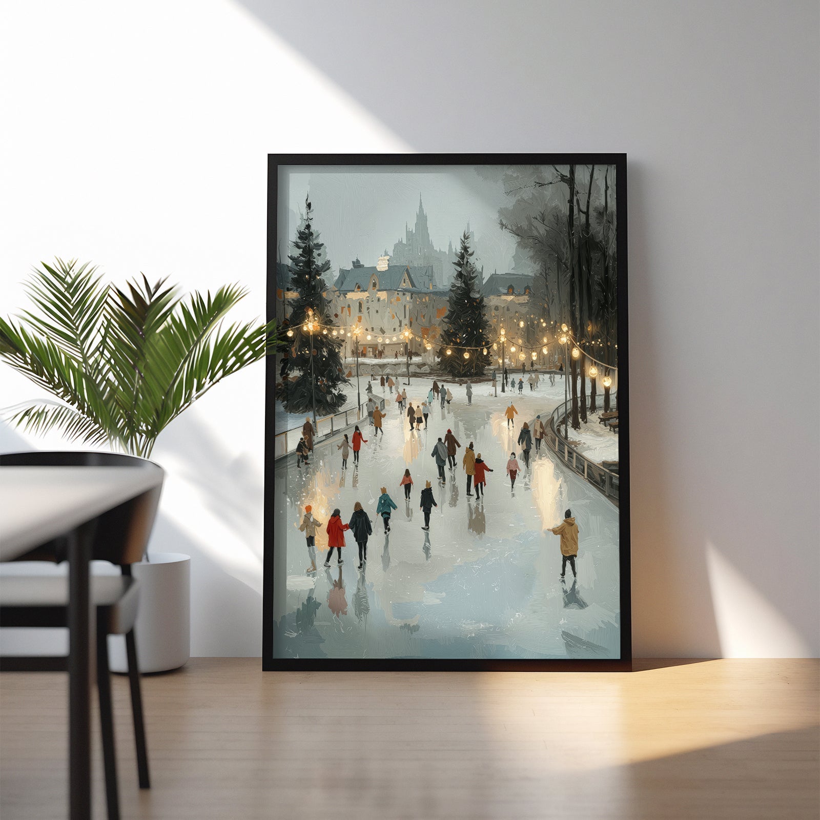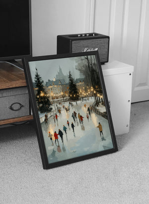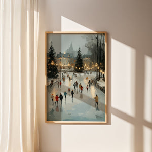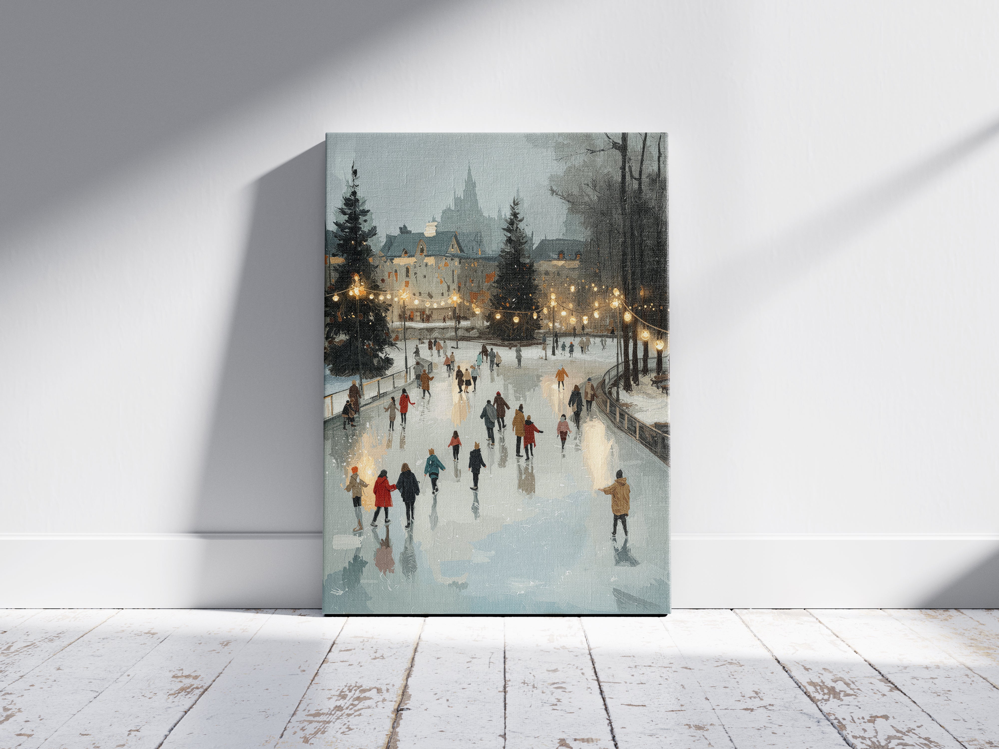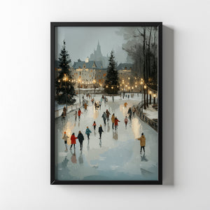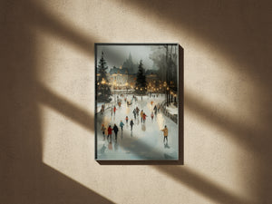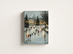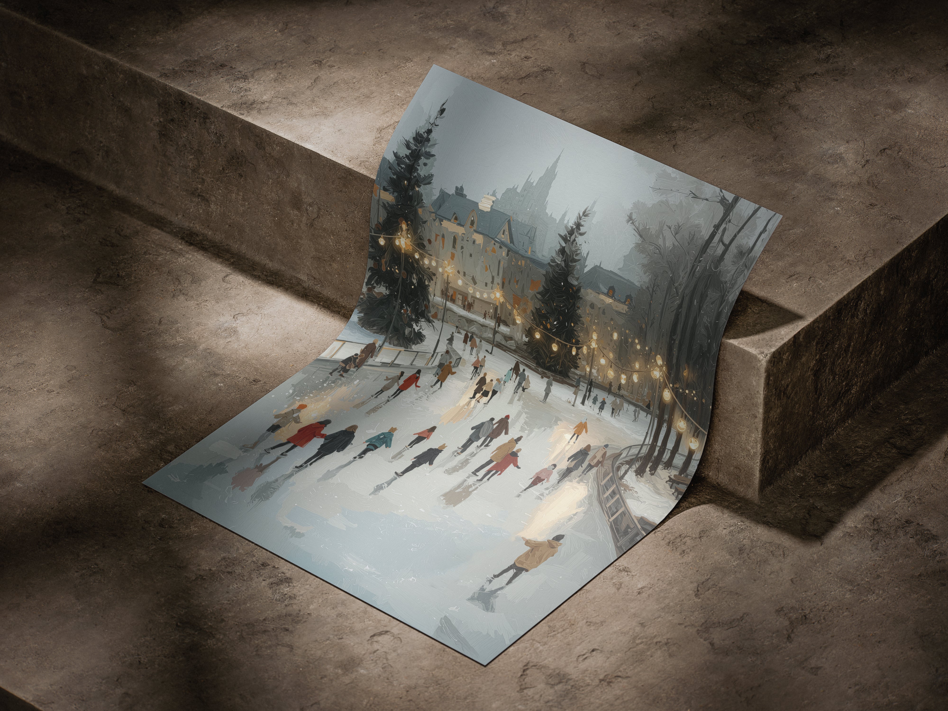 “Evening on Ice” captures a lively winter skating scene filled with soft lights, crisp air and the warm energy of people gliding across a frozen park rink. Tall evergreens frame the view while the distant historic buildings create a charming backdrop. The reflections on the ice and the subtle glow of string lights add a cozy sense of movement and seasonal magic.