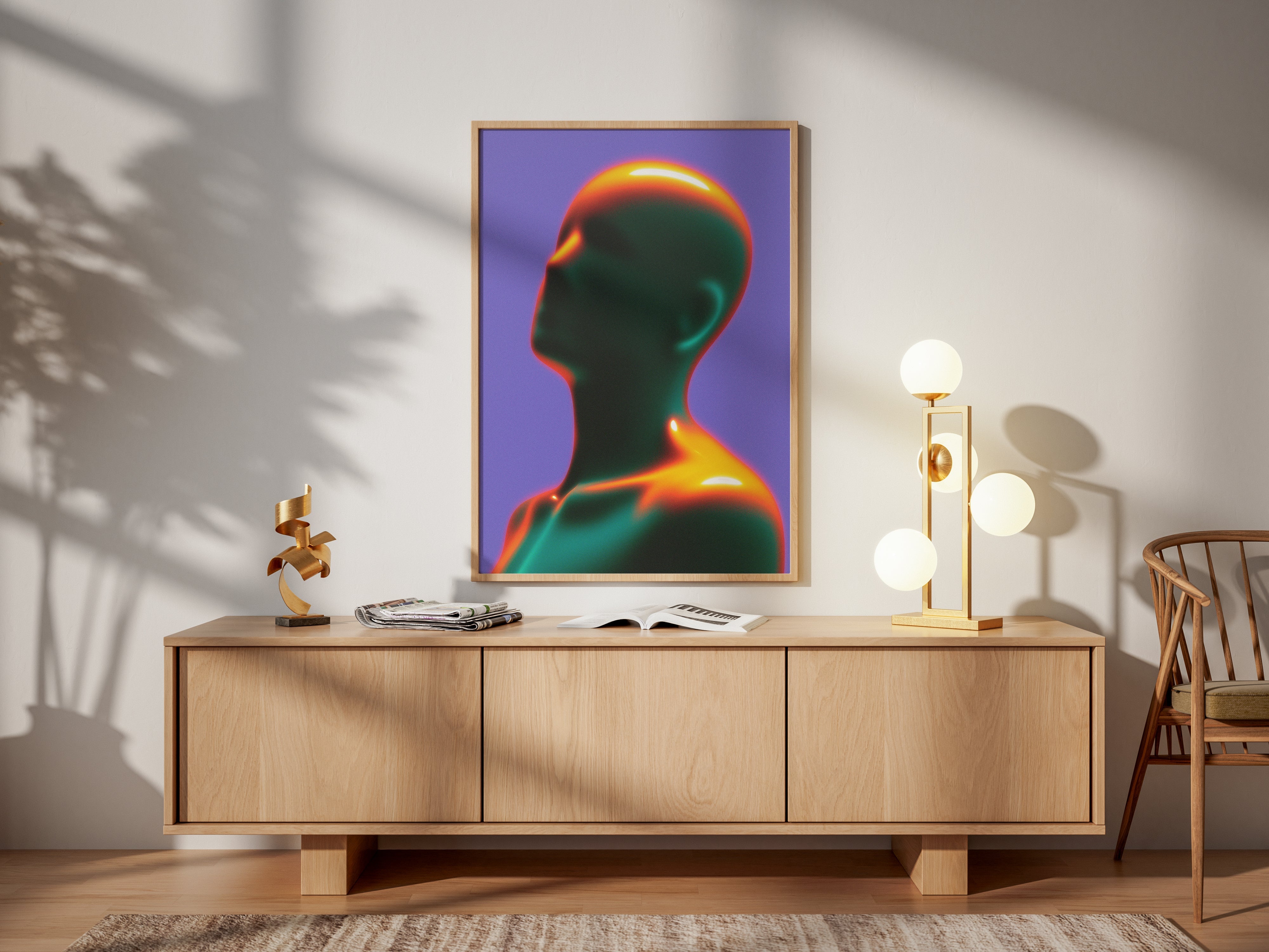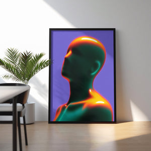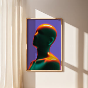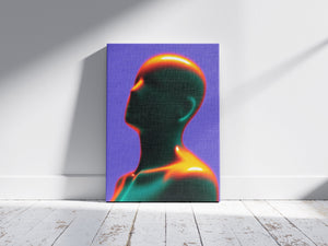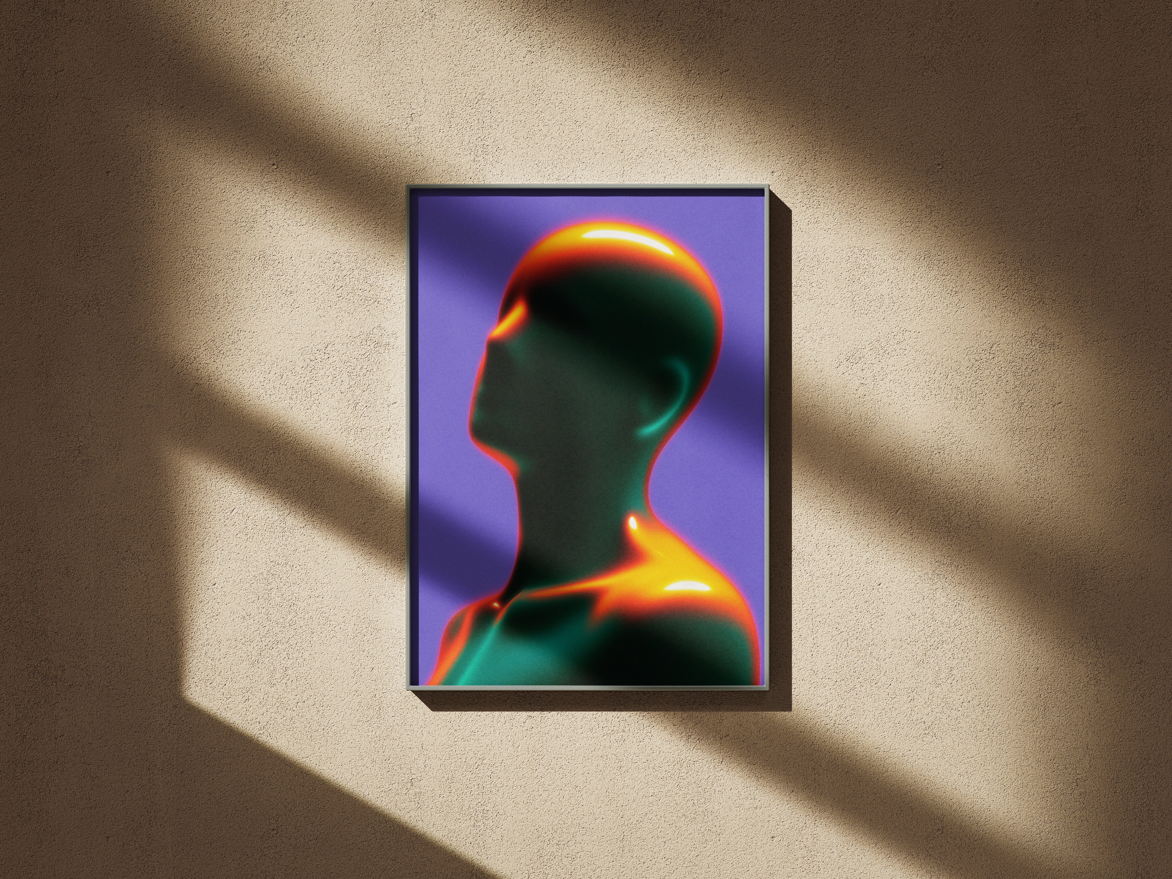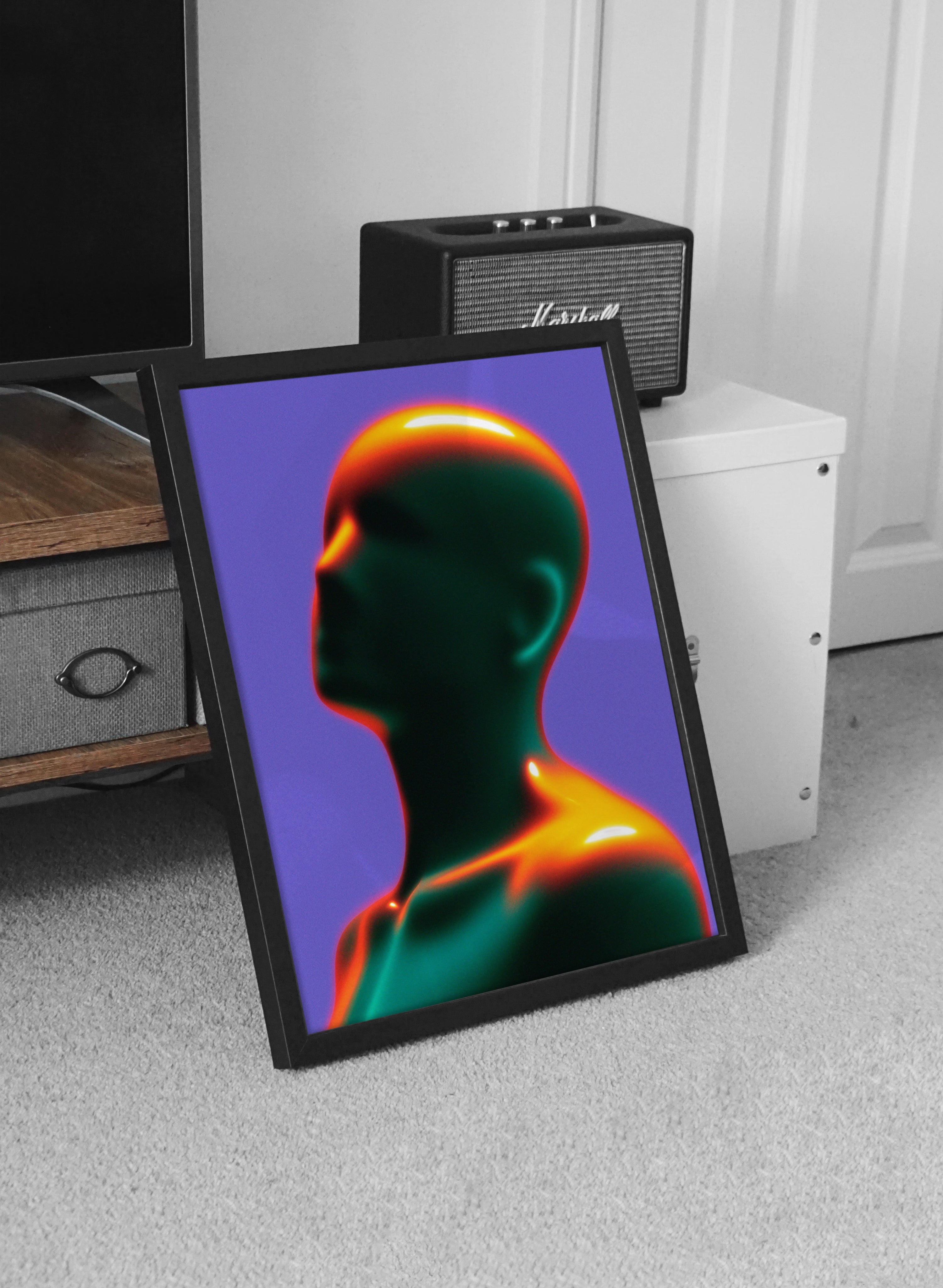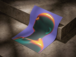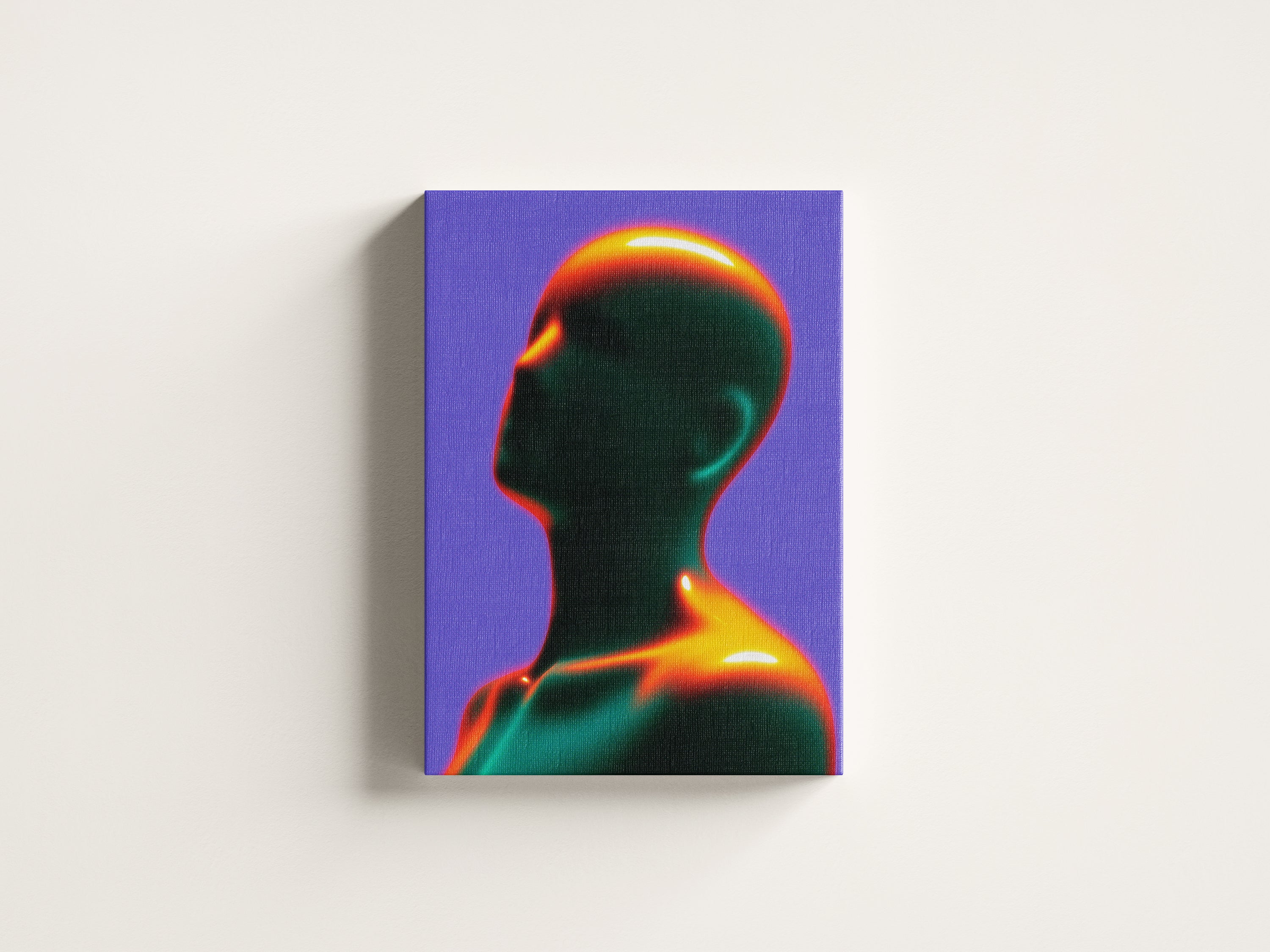 A human silhouette emerges from shadow, shaped not by detail but by temperature and light. Warm gradients trace the contours of the head and shoulders, suggesting emotion, awareness, and inner movement rather than physical form. The face turns upward, as if listening to something unseen. Heat of Thought explores the space between body and mind where feeling becomes visible, and identity is defined by energy rather than outline.