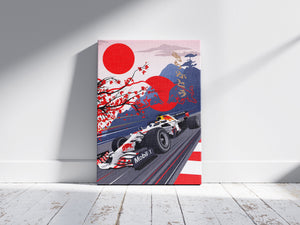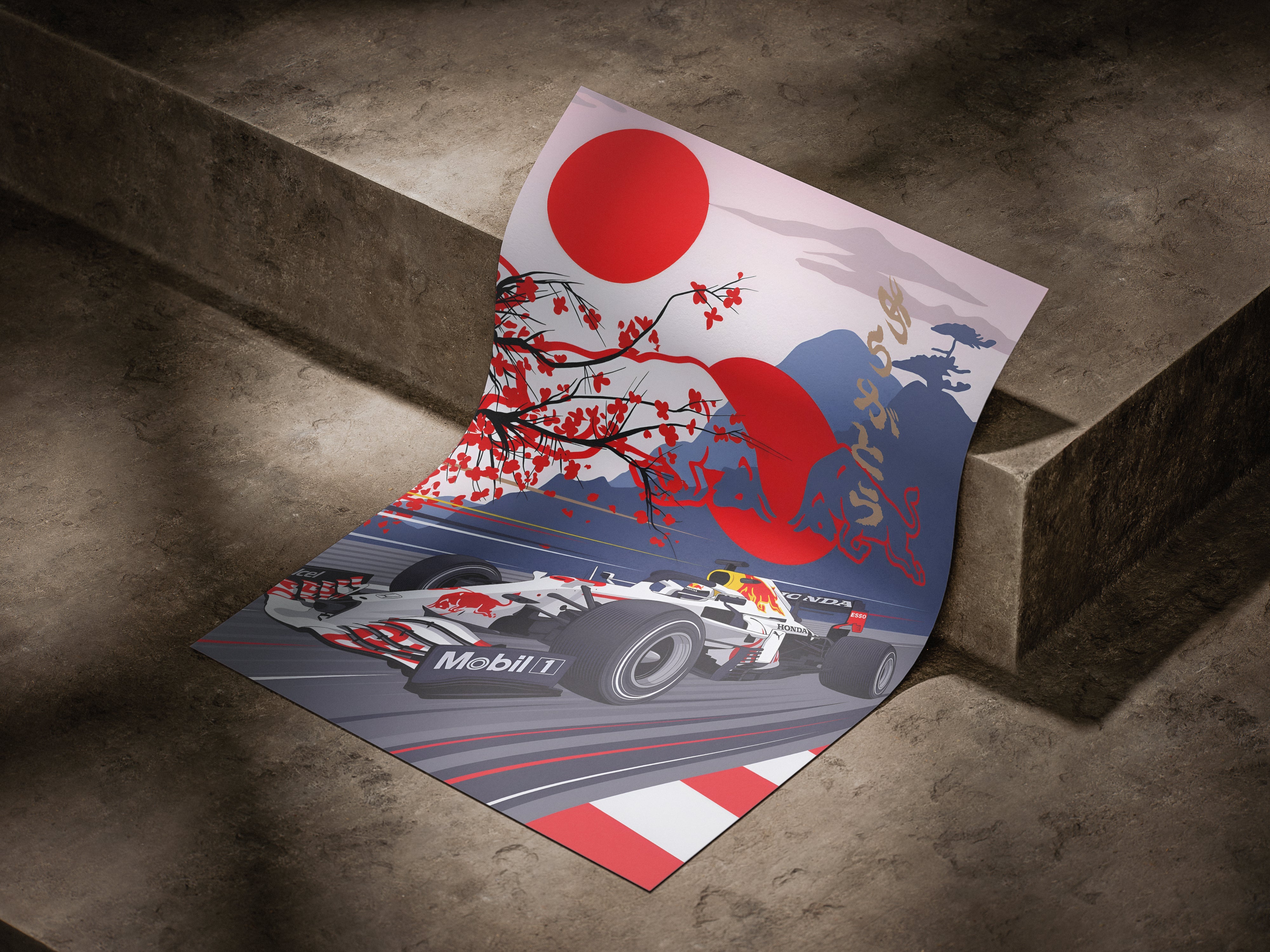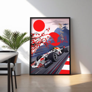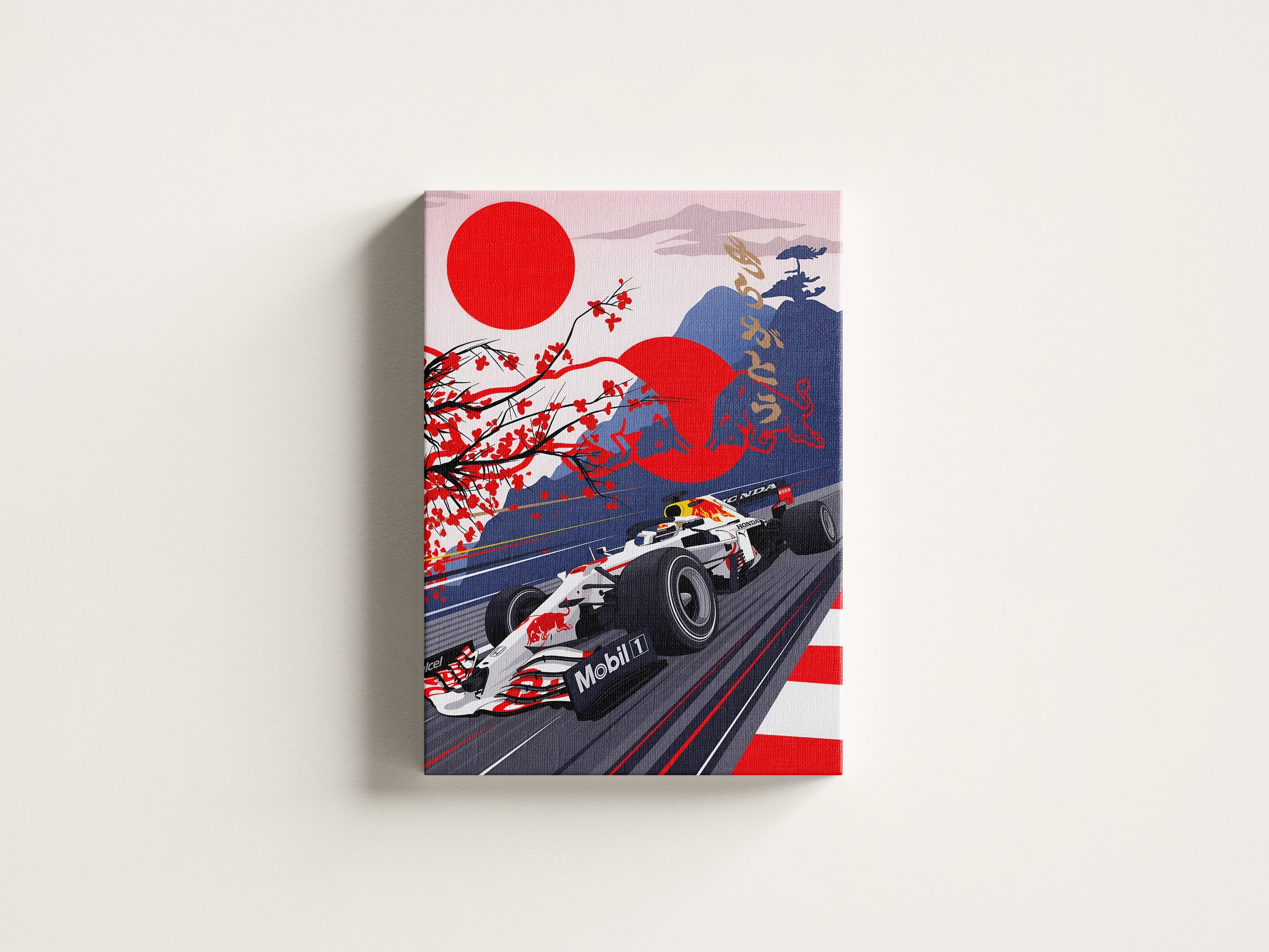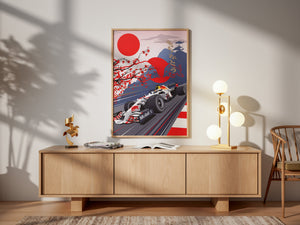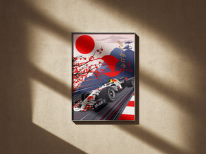 Celebrate the spirit of the Japan Grand Prix with this vibrant Formula 1 artwork. Blending traditional Japanese art elements with modern racing energy, this poster features a Red Bull F1 car speeding through a stylized landscape of cherry blossoms, red suns, and Mount Fuji silhouettes.