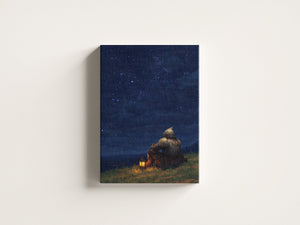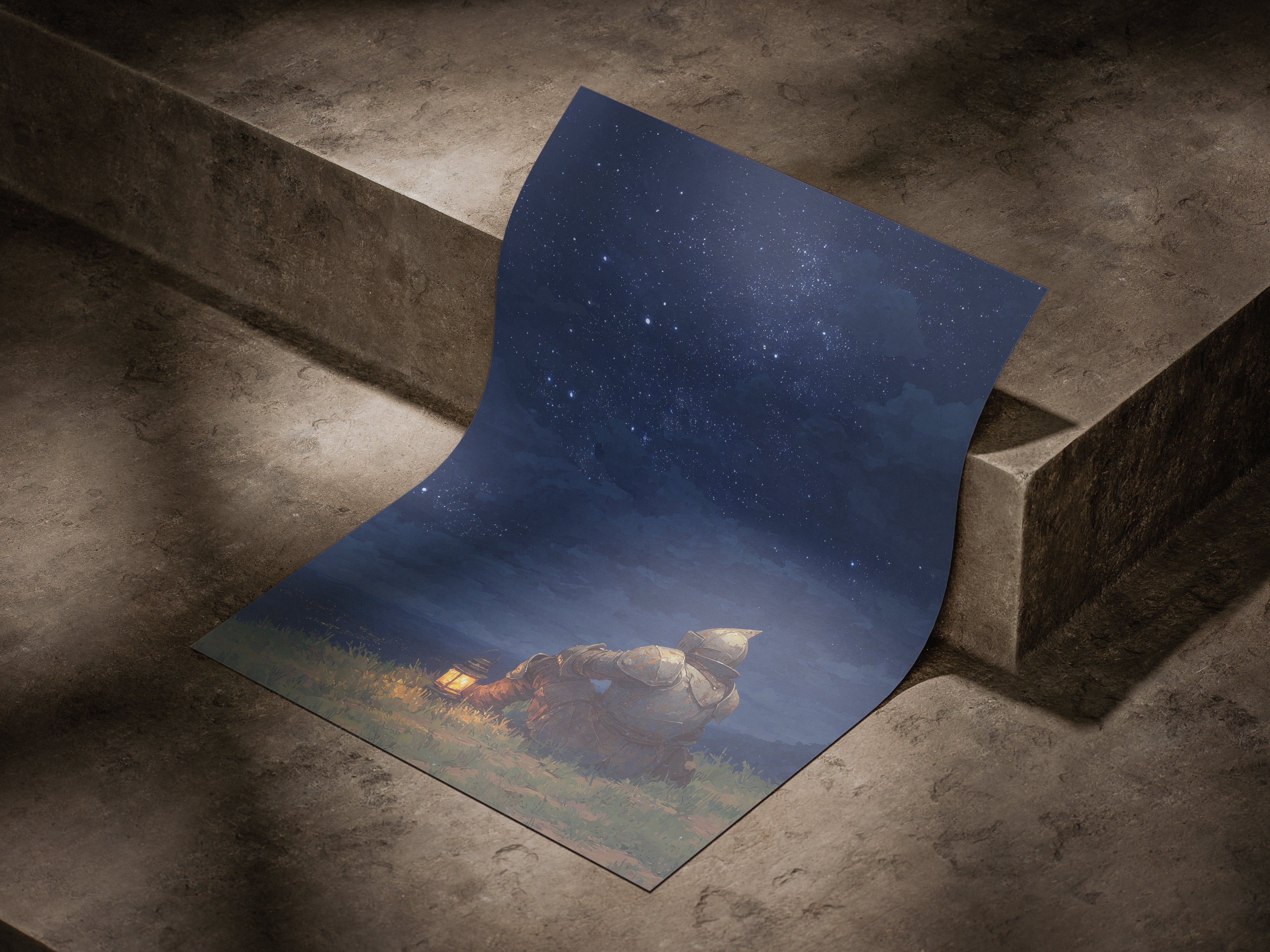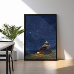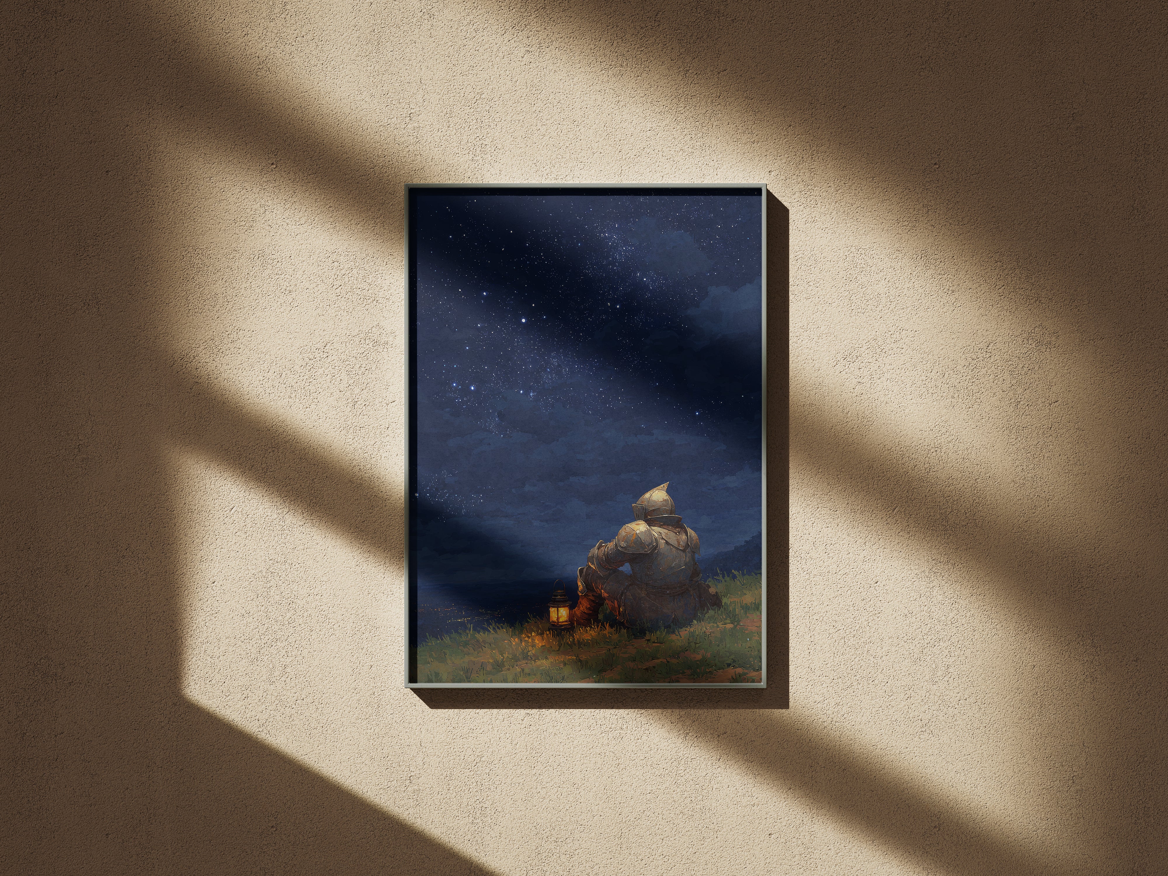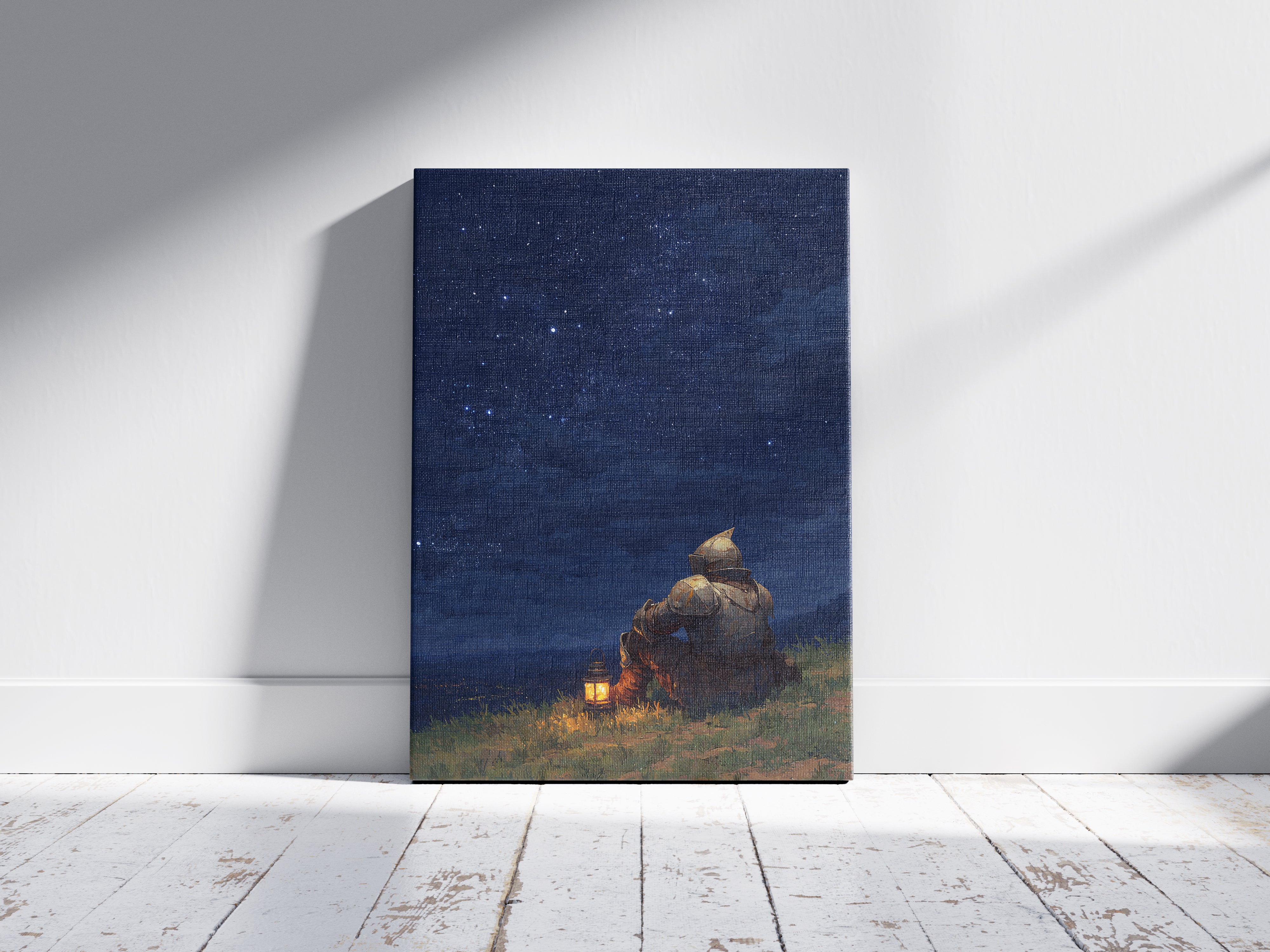 “Knight Under the Stars” portrays a lone armored warrior resting on a quiet hillside beneath a vast, shimmering night sky. The warm glow of a lantern contrasts beautifully with the deep blues of the starlit heavens, creating a moment of peace, reflection, and quiet strength. This artwork blends fantasy storytelling with cinematic atmosphere, inviting viewers to imagine the journey behind and ahead of the silent knight.