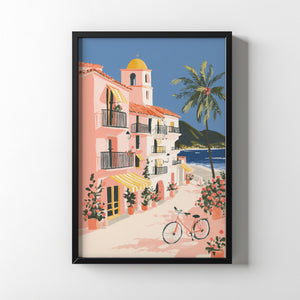 Blush-toned buildings rise along a sunlit promenade, framed by palm trees and blooming flowers. With the sea close enough to hear and the day unfolding without haste, the scene reflects the simple luxury of Mediterranean living where beauty lies in stillness and everyday moments.
