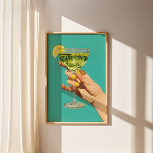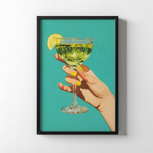 A quiet moment captured mid-gesture a hand lifted, a glass poised, and a slice of lemon catching the light. Set against a calm turquoise backdrop, this piece celebrates effortless elegance and small indulgences. The textured brushstrokes and vivid colors evoke a sense of summer leisure, where time slows and a simple drink becomes a ritual of joy and confidence.