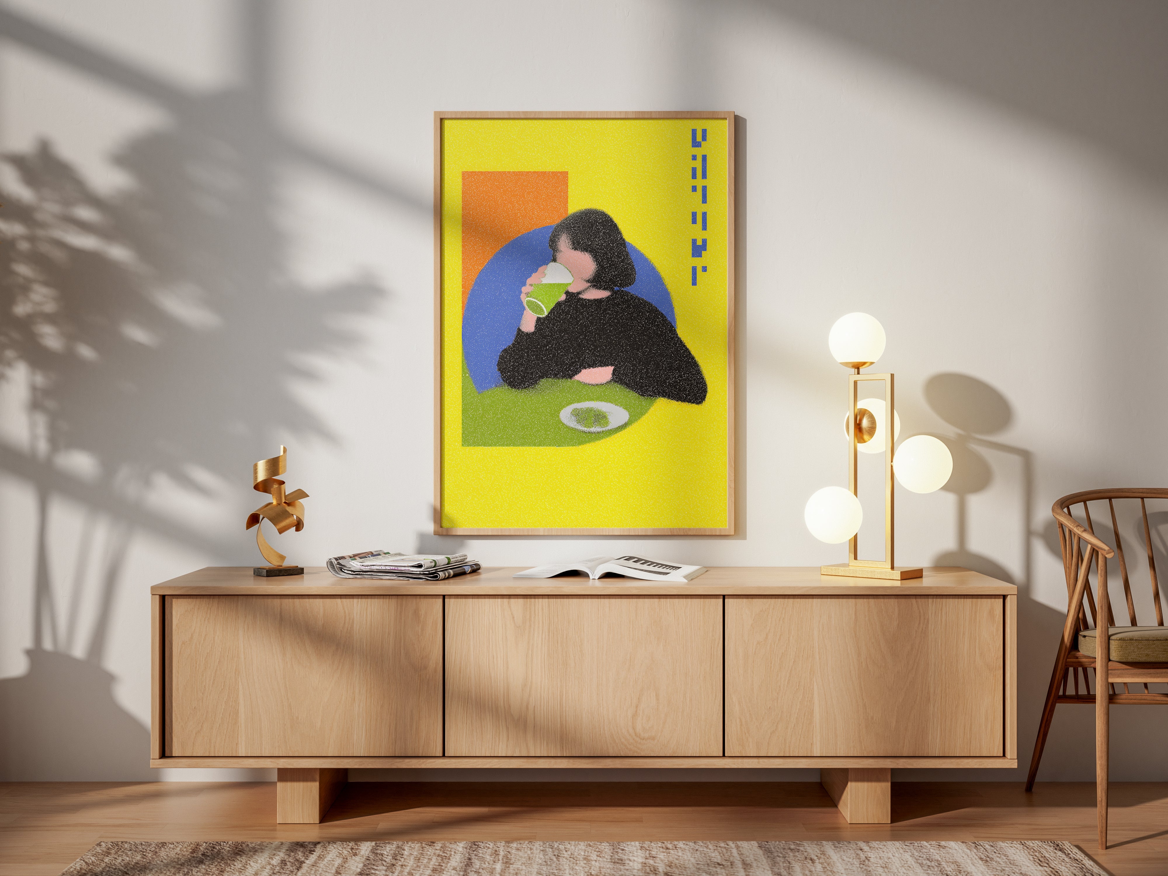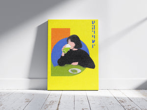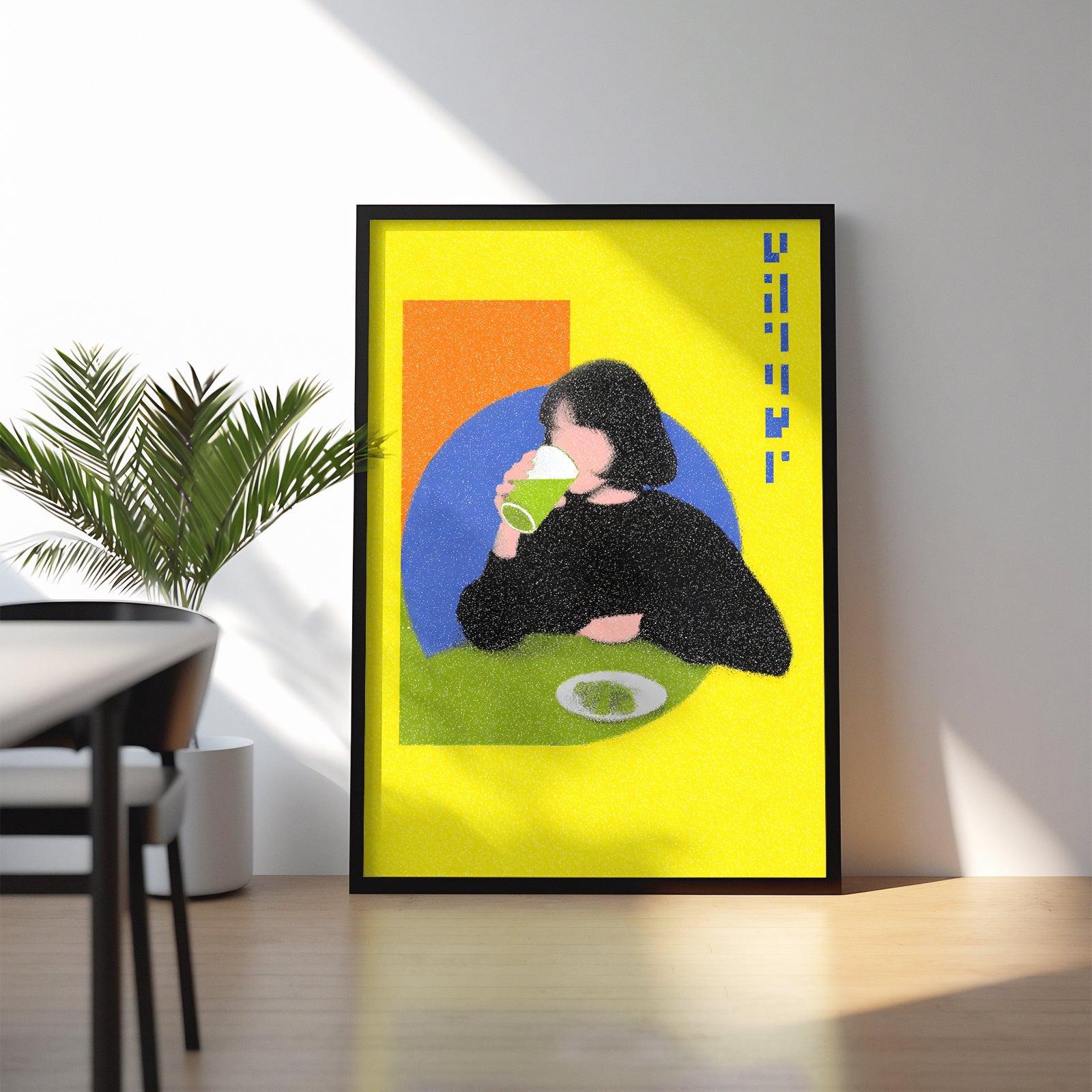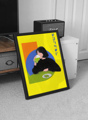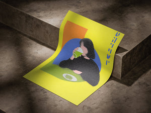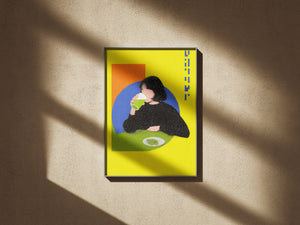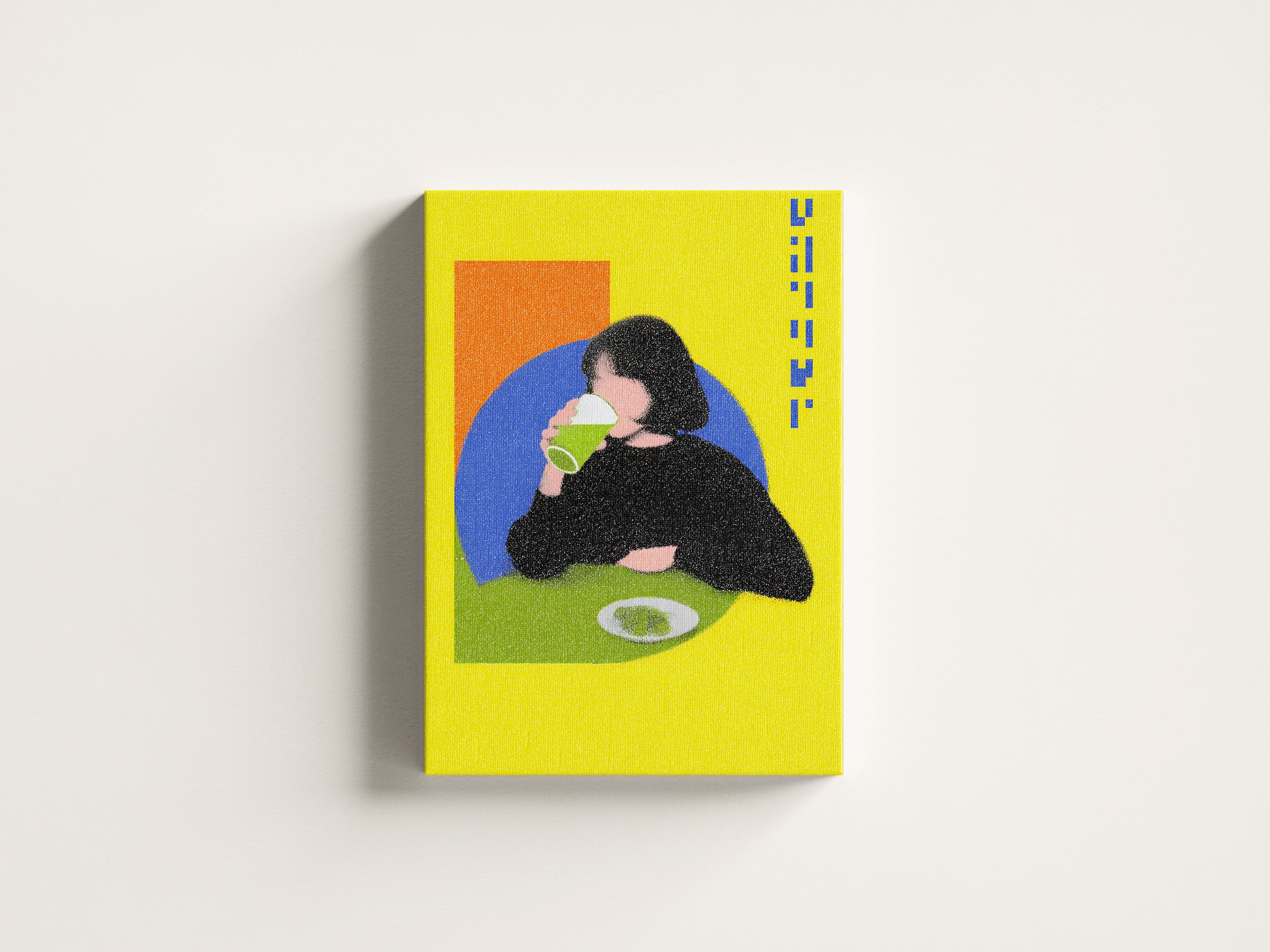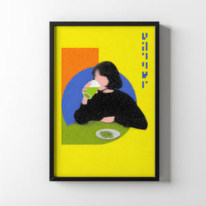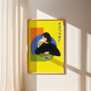“Lime Break” captures a quiet moment suspended inside a vibrant pop-colored world. The figure sits against geometric fields of orange and blue while the bright yellow background amplifies the playful tension between stillness and energy. The grainy texture softens the scene and turns an ordinary act of drinking into a graphic study of shape, rhythm and everyday ritual.