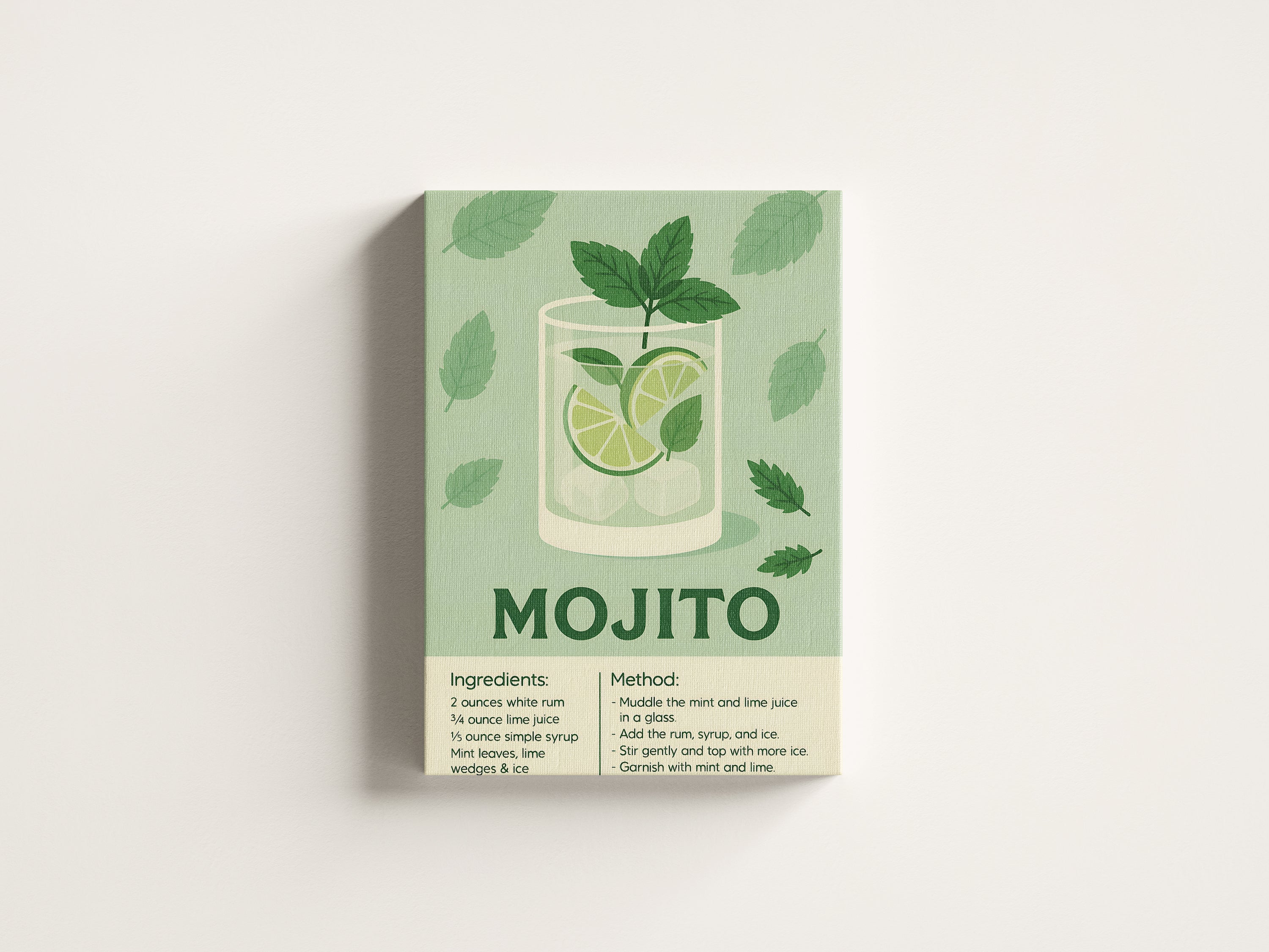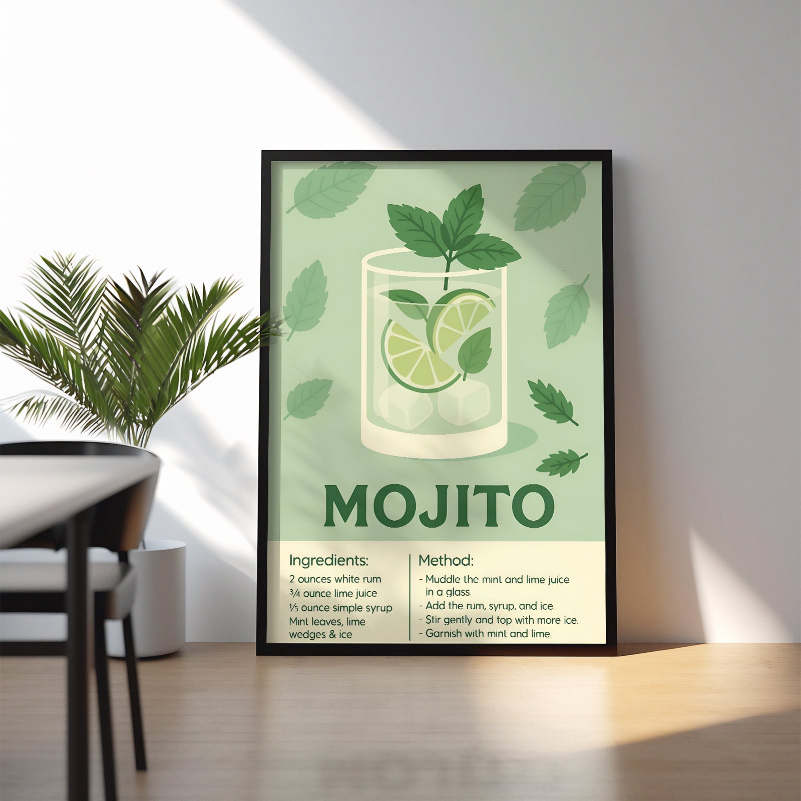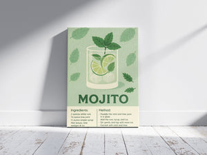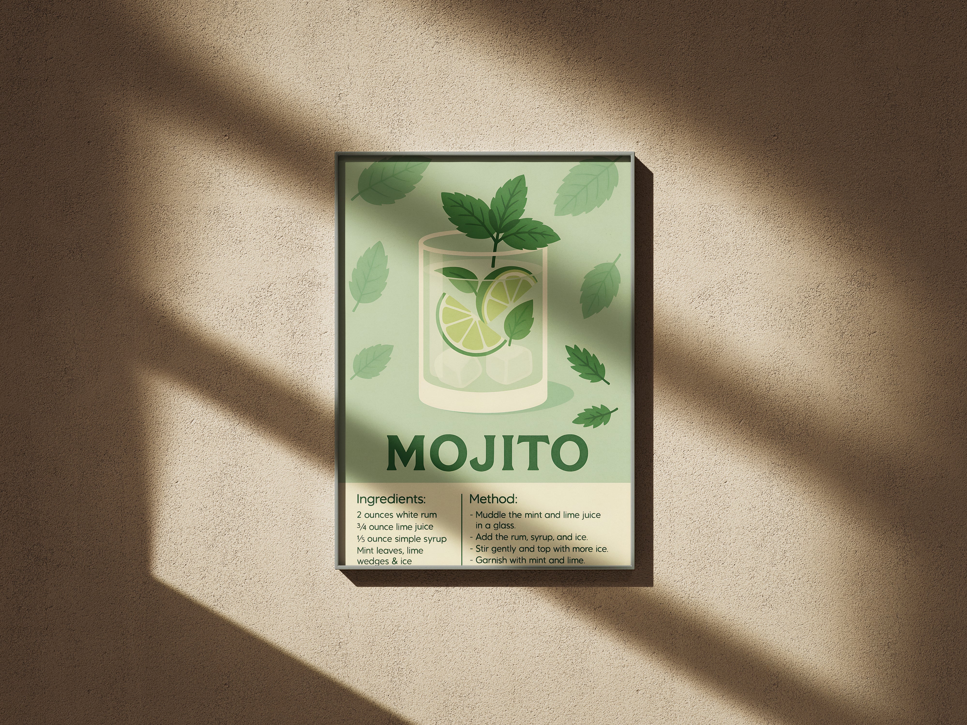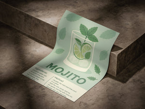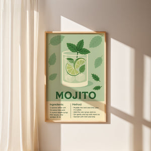 Add a splash of summer to your walls with this refreshing Mojito Cocktail Art Print. Featuring a clean, vintage-style illustration of lime, mint, and ice in soothing green tones, this artwork captures the essence of the classic Cuban cocktail fresh, light, and timeless.