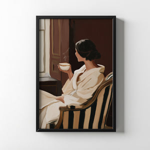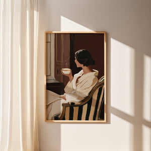 A warm cup in hand and light filtering through the window create a moment of gentle reflection.