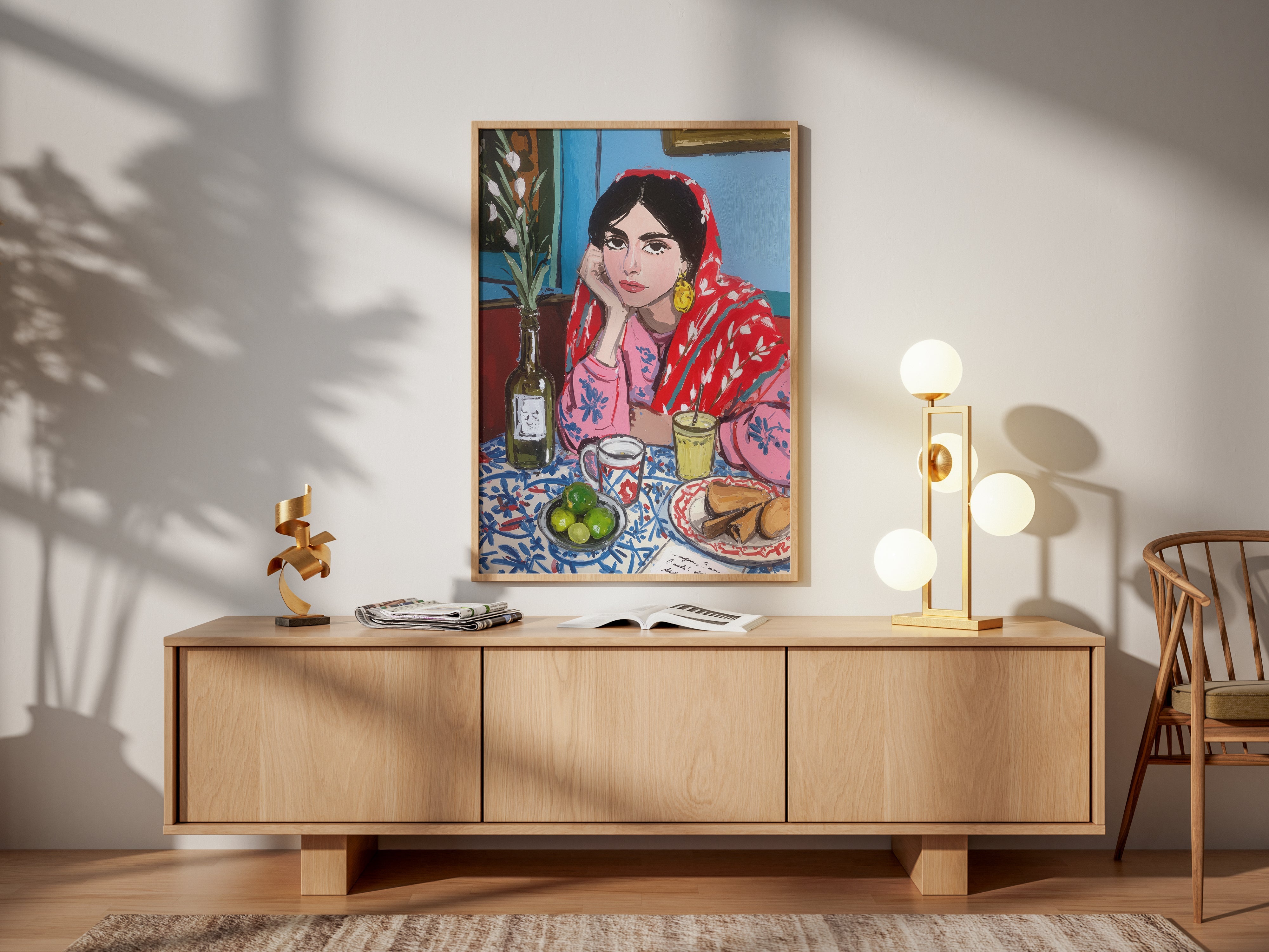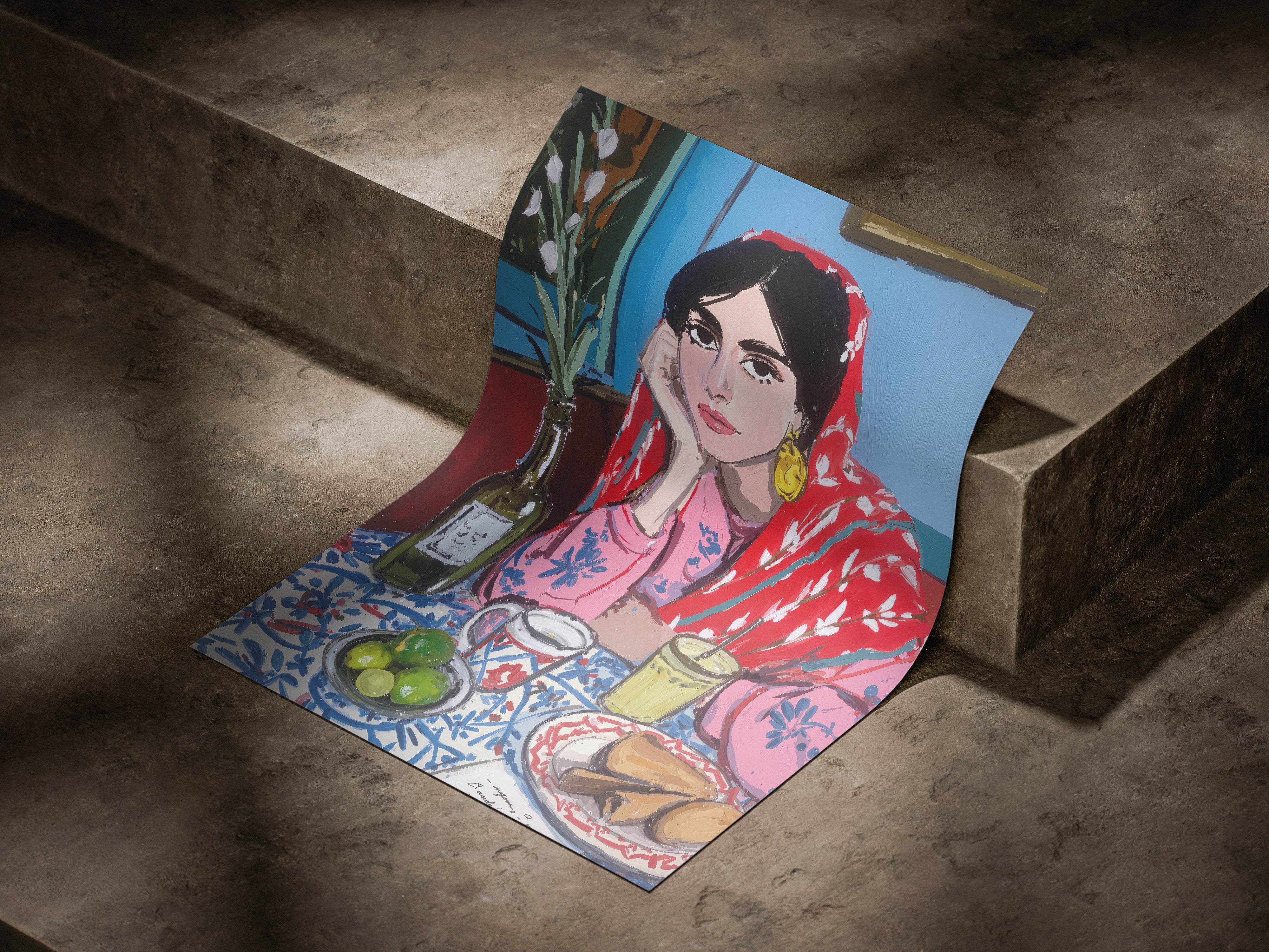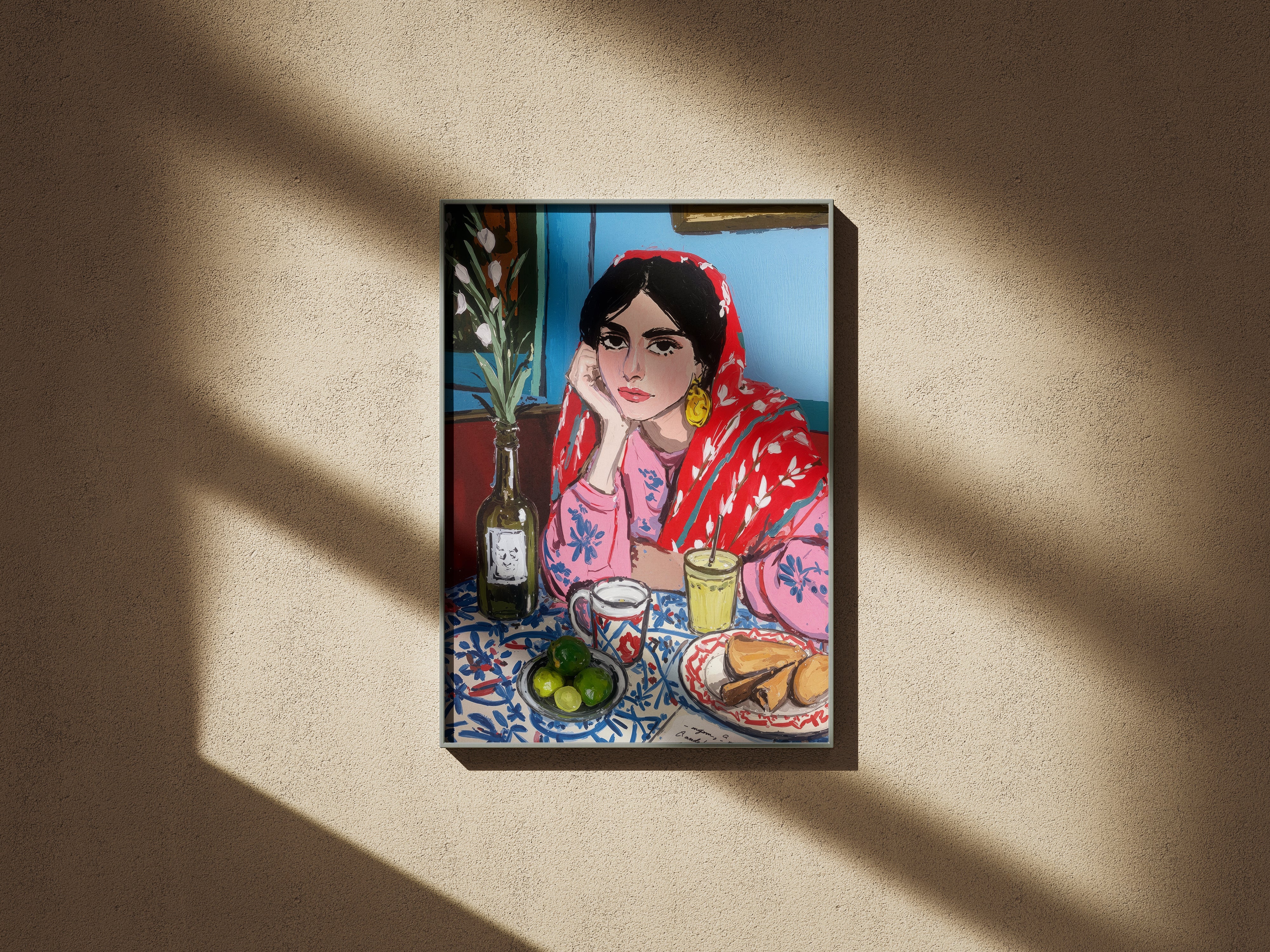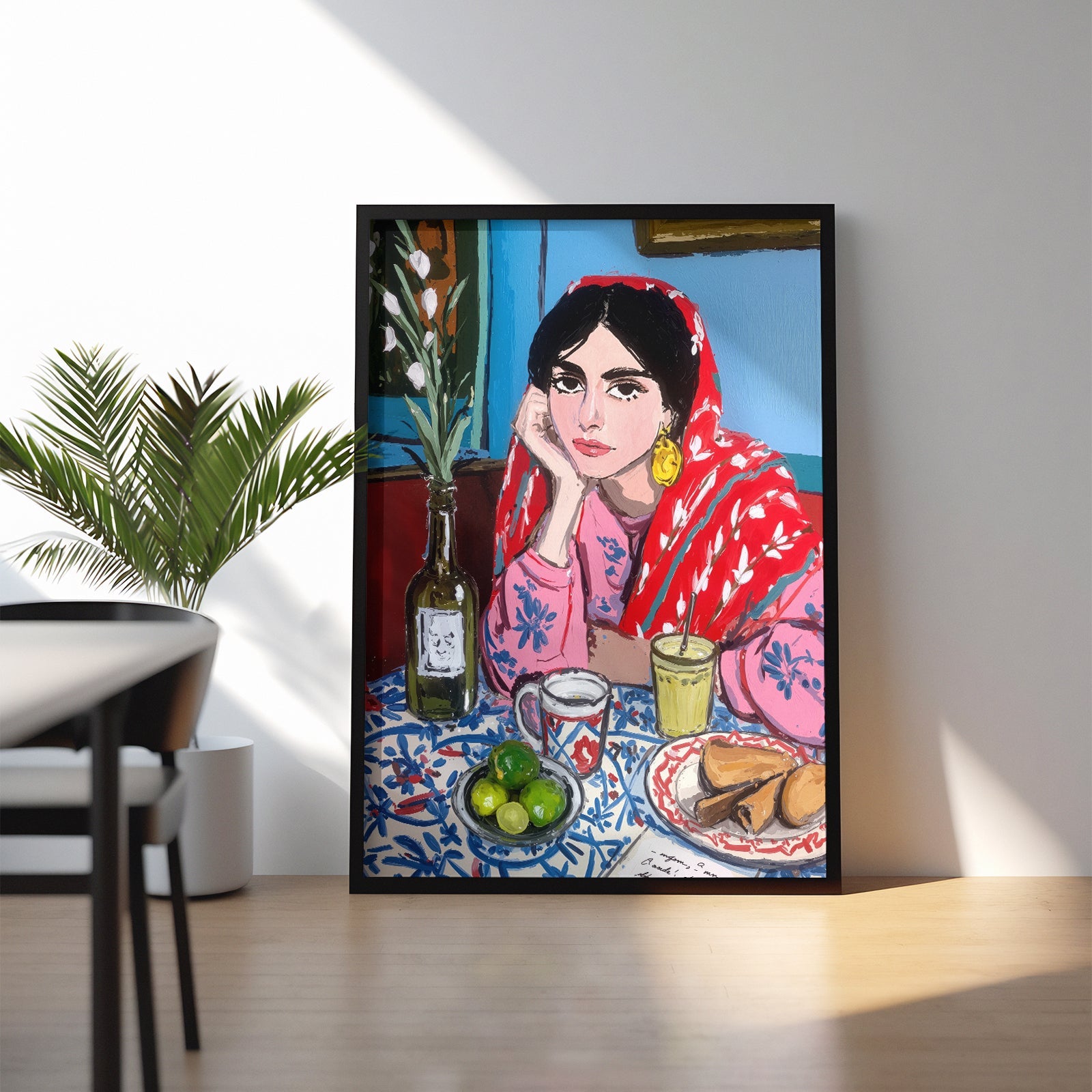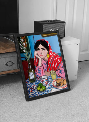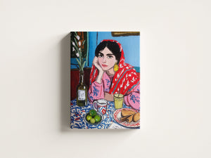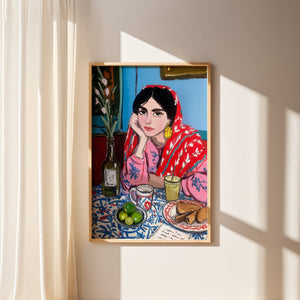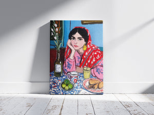 A vibrant and expressive portrait of a woman lost in her morning reflections. Wrapped in a bold red patterned shawl and surrounded by a colorful breakfast table, she brings warmth and quiet emotion to the scene. The painterly strokes, rich textures, and harmonious colors blend cultural charm with contemporary artistry. This piece captures a moment of stillness, contemplation, and everyday beauty, perfect for interiors seeking character, storytelling, and soulful color.