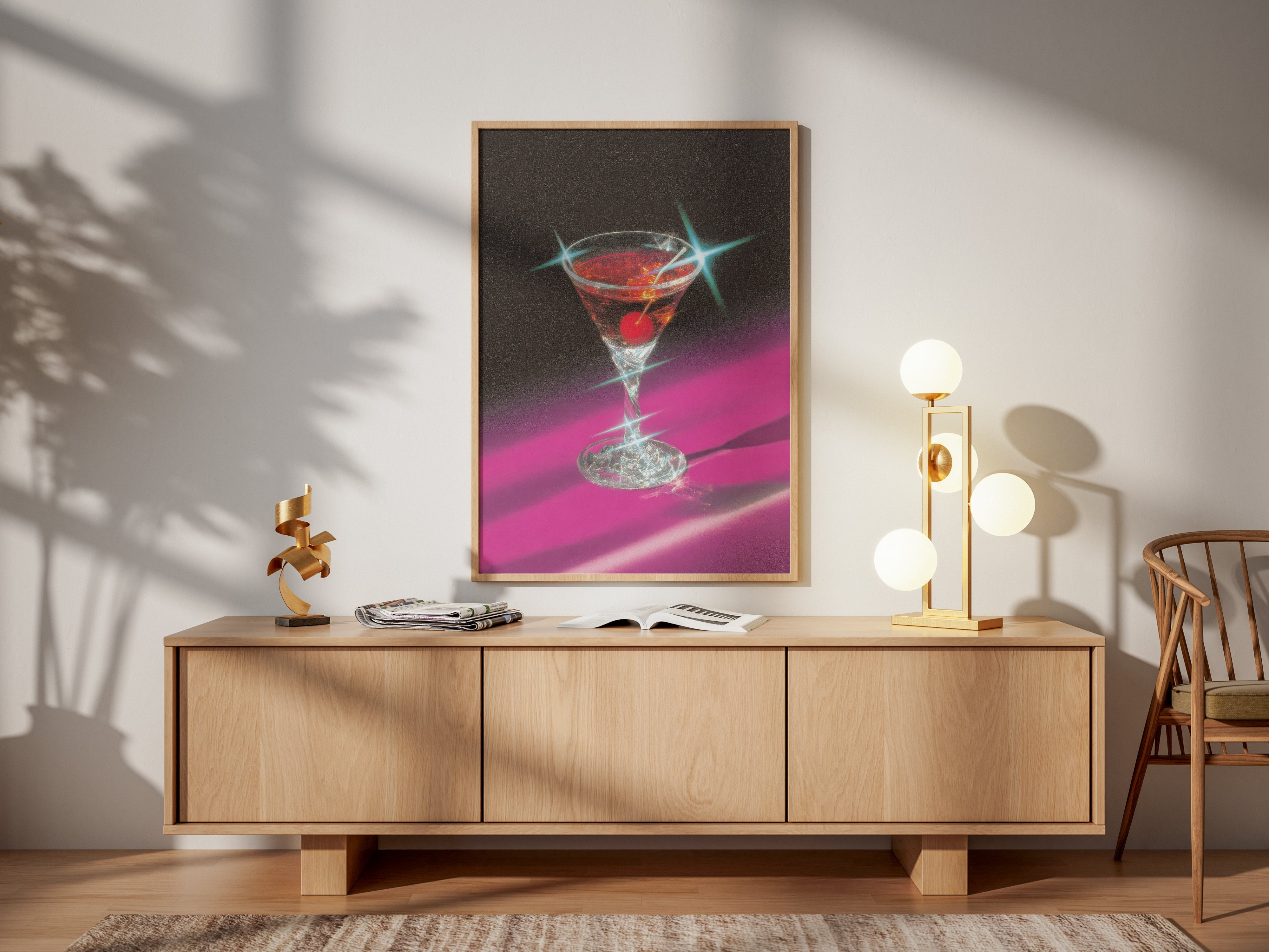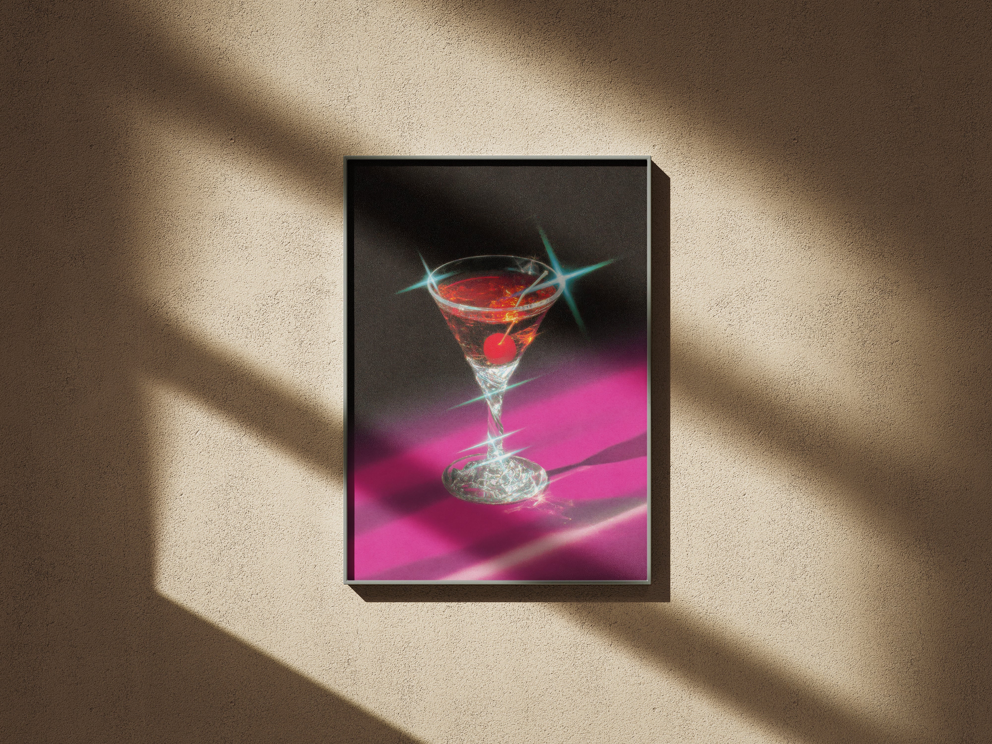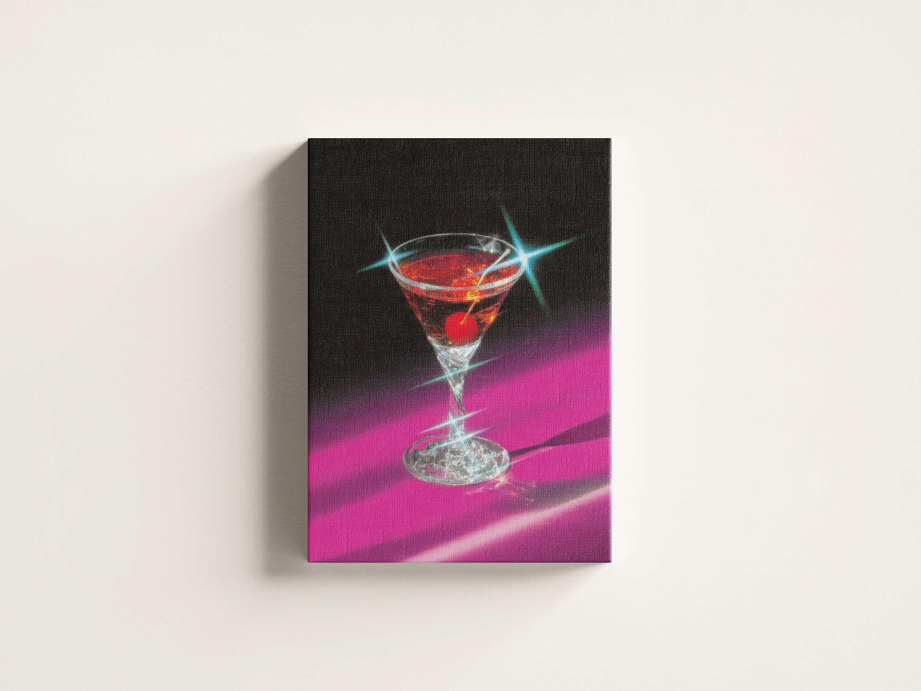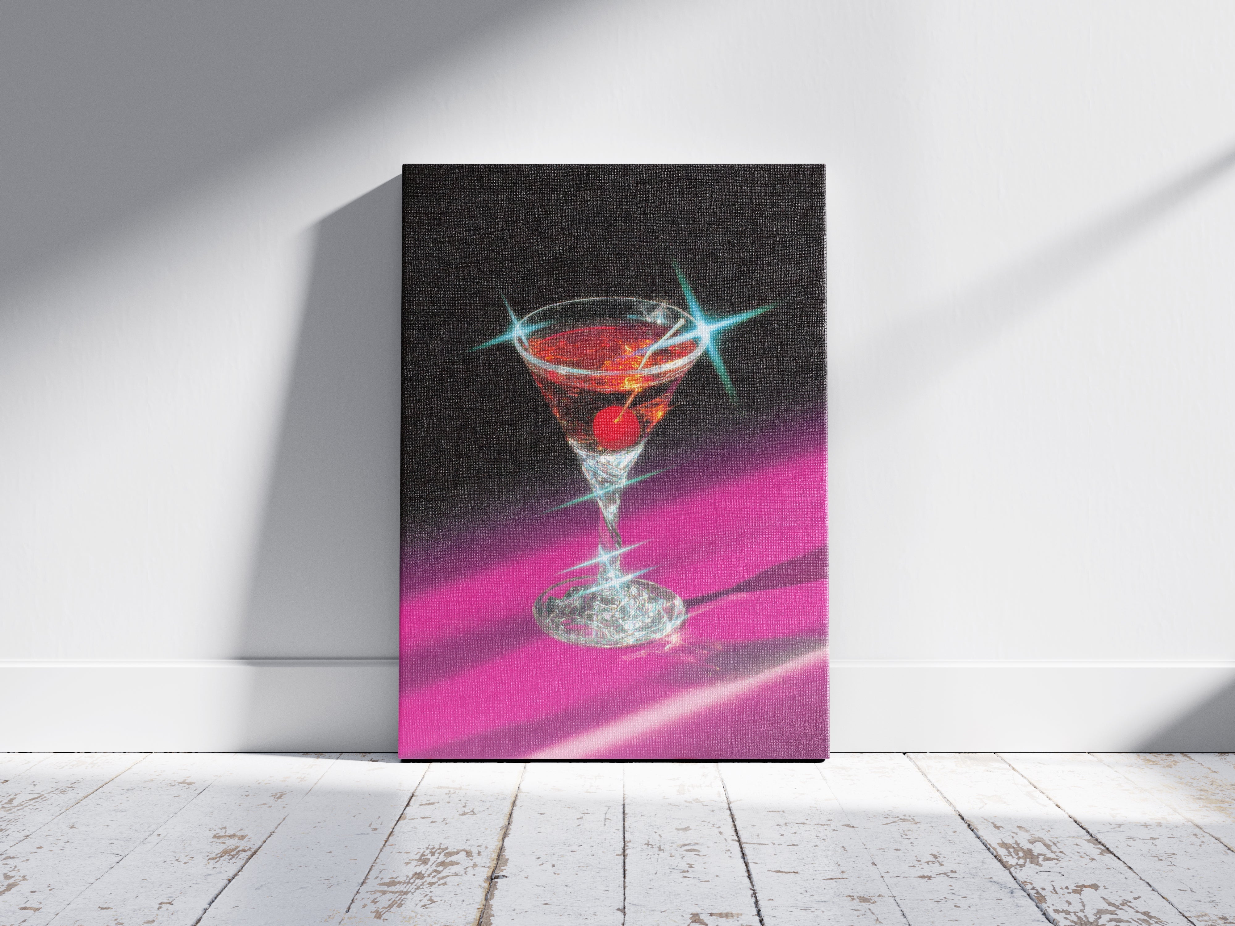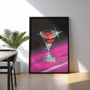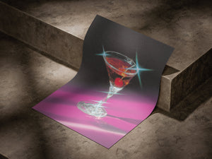 “Neon Martini” captures the glamorous essence of nightlife with a dazzling blend of retro neon tones and cinematic lighting. The crystal-clear glass, jeweled highlights, and deep magenta shadows create an atmosphere that feels both nostalgic and modern. This artwork evokes the mood of late-night lounges, velvet bar counters, and timeless cocktails.