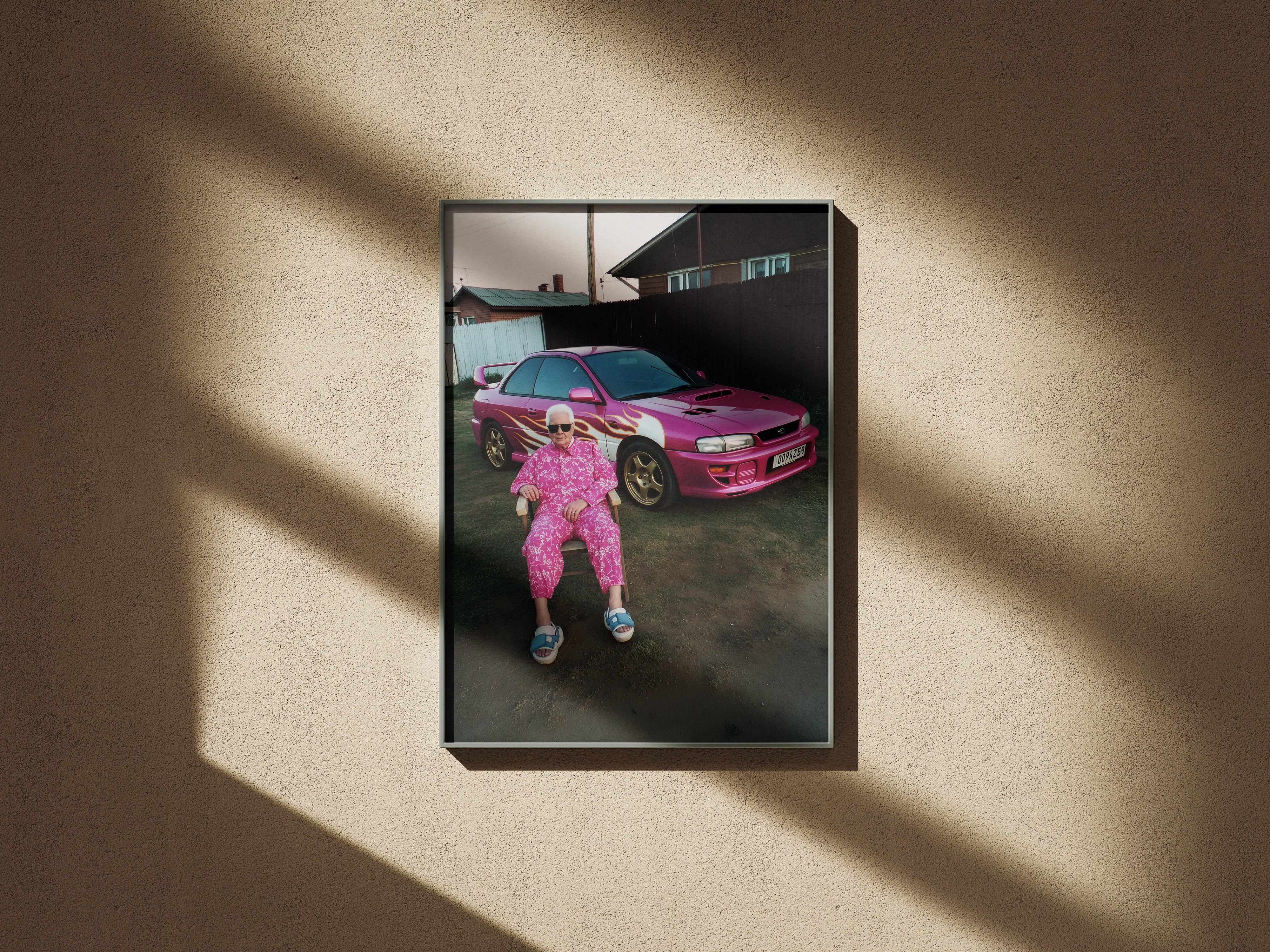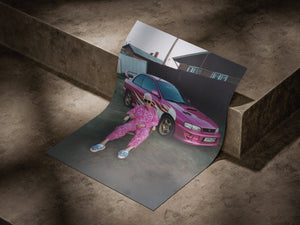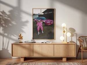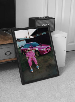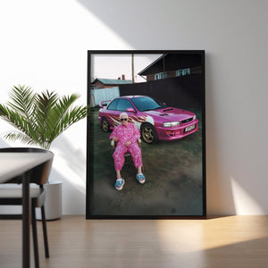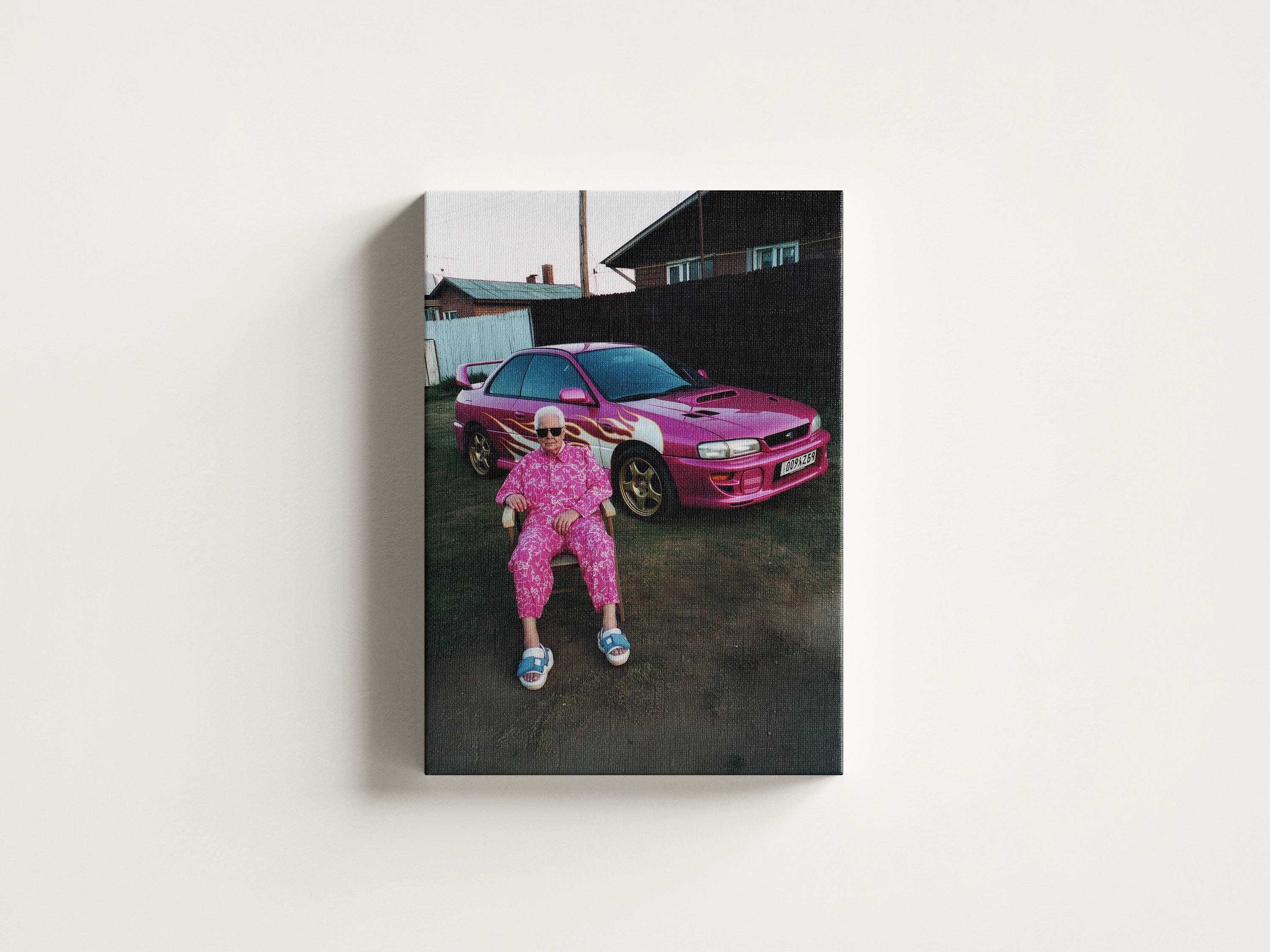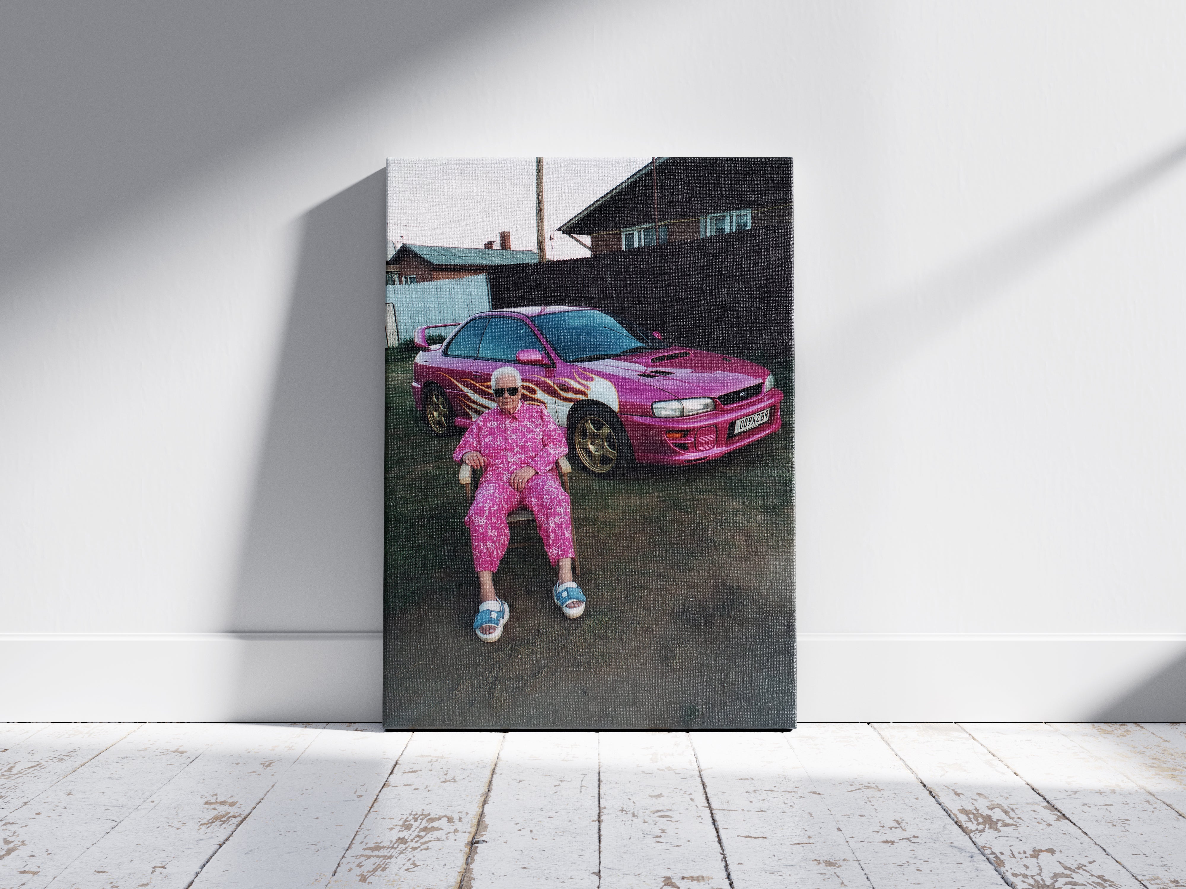 “Pink Turbo Grandma” blends humor, attitude, and unexpected style in a single frame. A bold elderly woman sits confidently in front of a hot-pink, flame-detailed Subaru creating a surreal mix of nostalgia, rebellion, and street-culture aesthetics. This piece celebrates the spirit of those who age but never slow down, making it a perfect statement artwork for modern, playful, and personality-driven interiors.