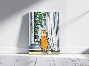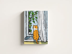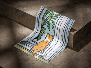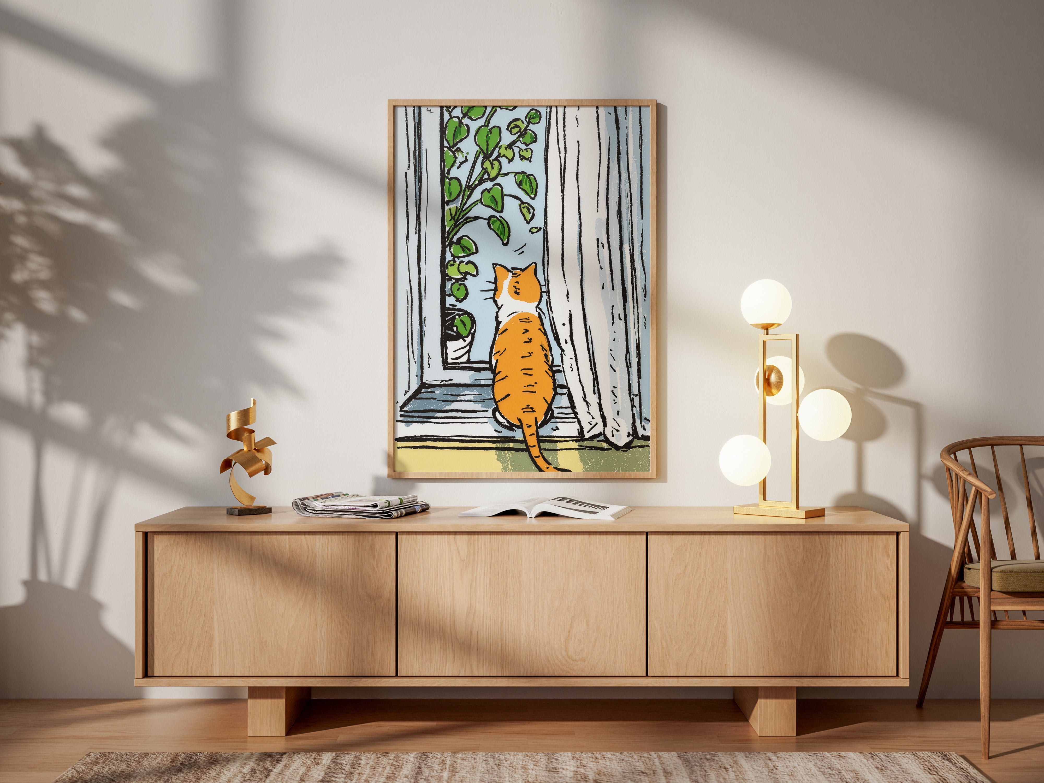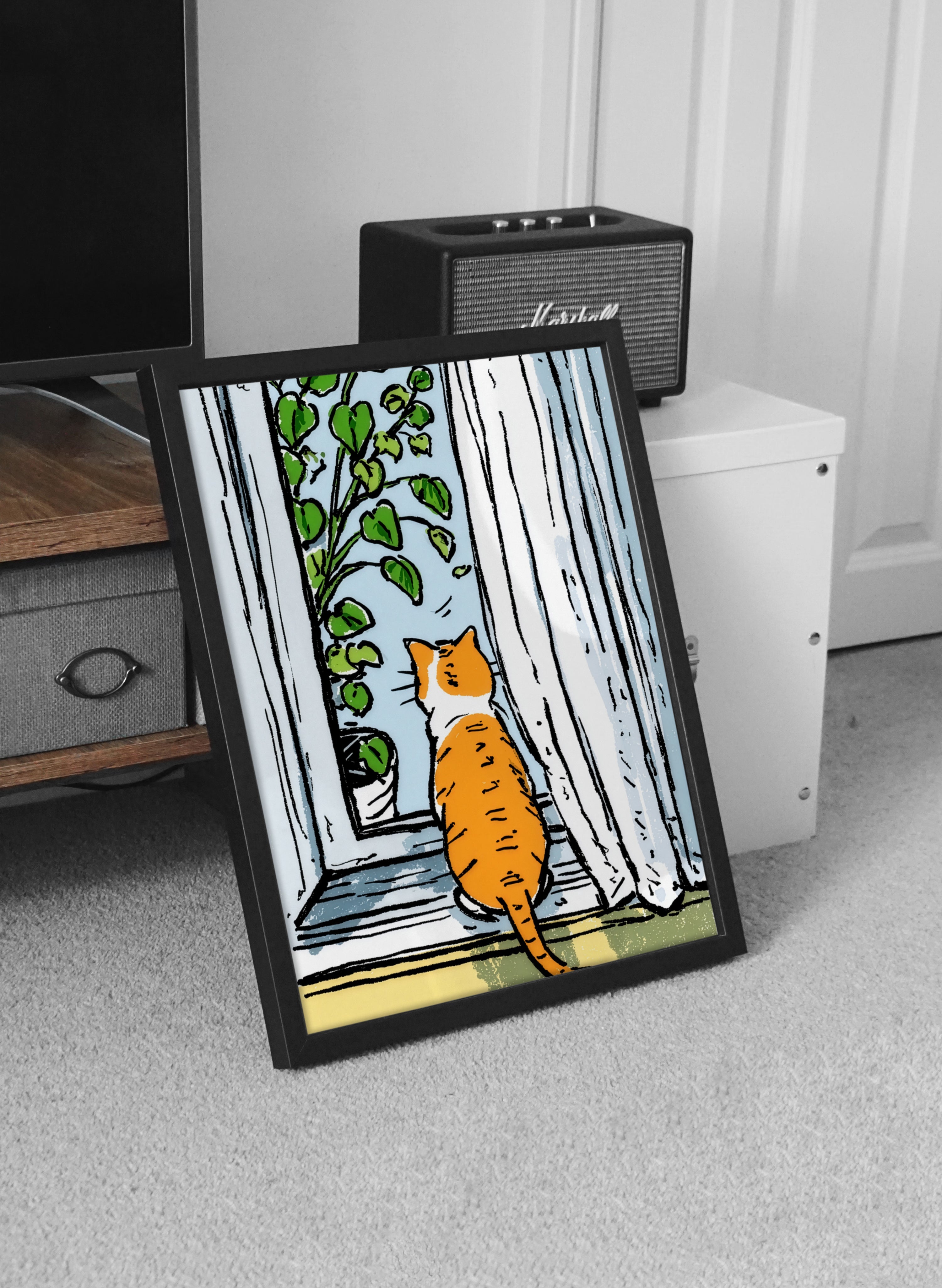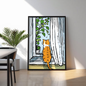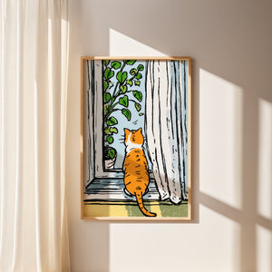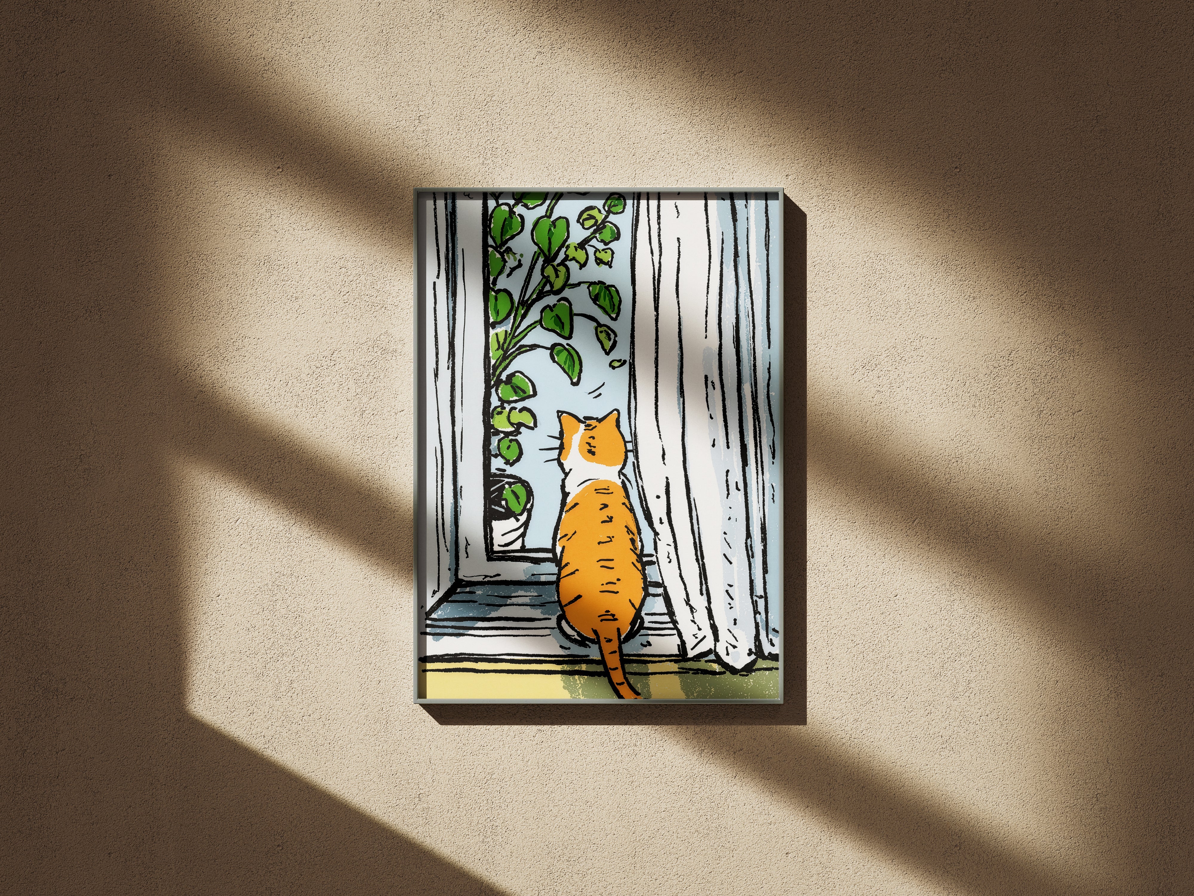 Bathed in soft daylight, an orange cat sits patiently by the window, watching leaves sway in the gentle afternoon air. The scene captures a fleeting moment of calm where time slows, thoughts soften, and the world feels safe and still. With its hand-drawn lines and warm, muted tones, this artwork celebrates solitude, curiosity, and the quiet comfort of simply observing life as it passes by.
