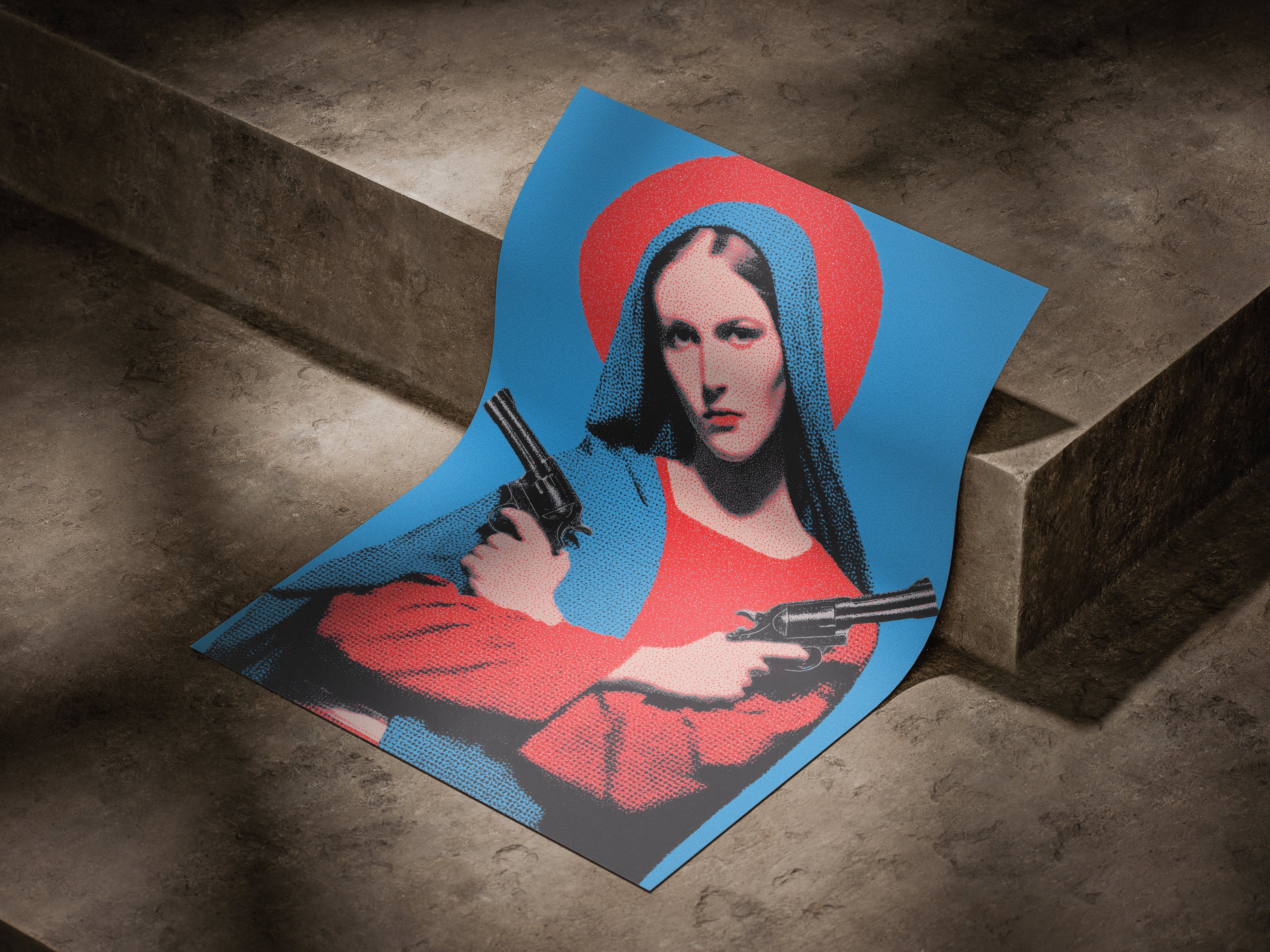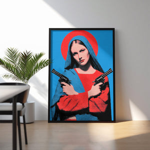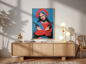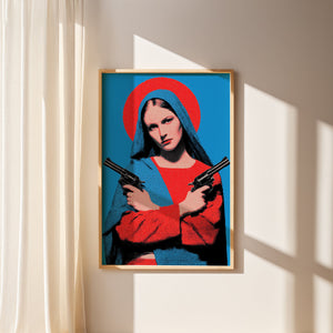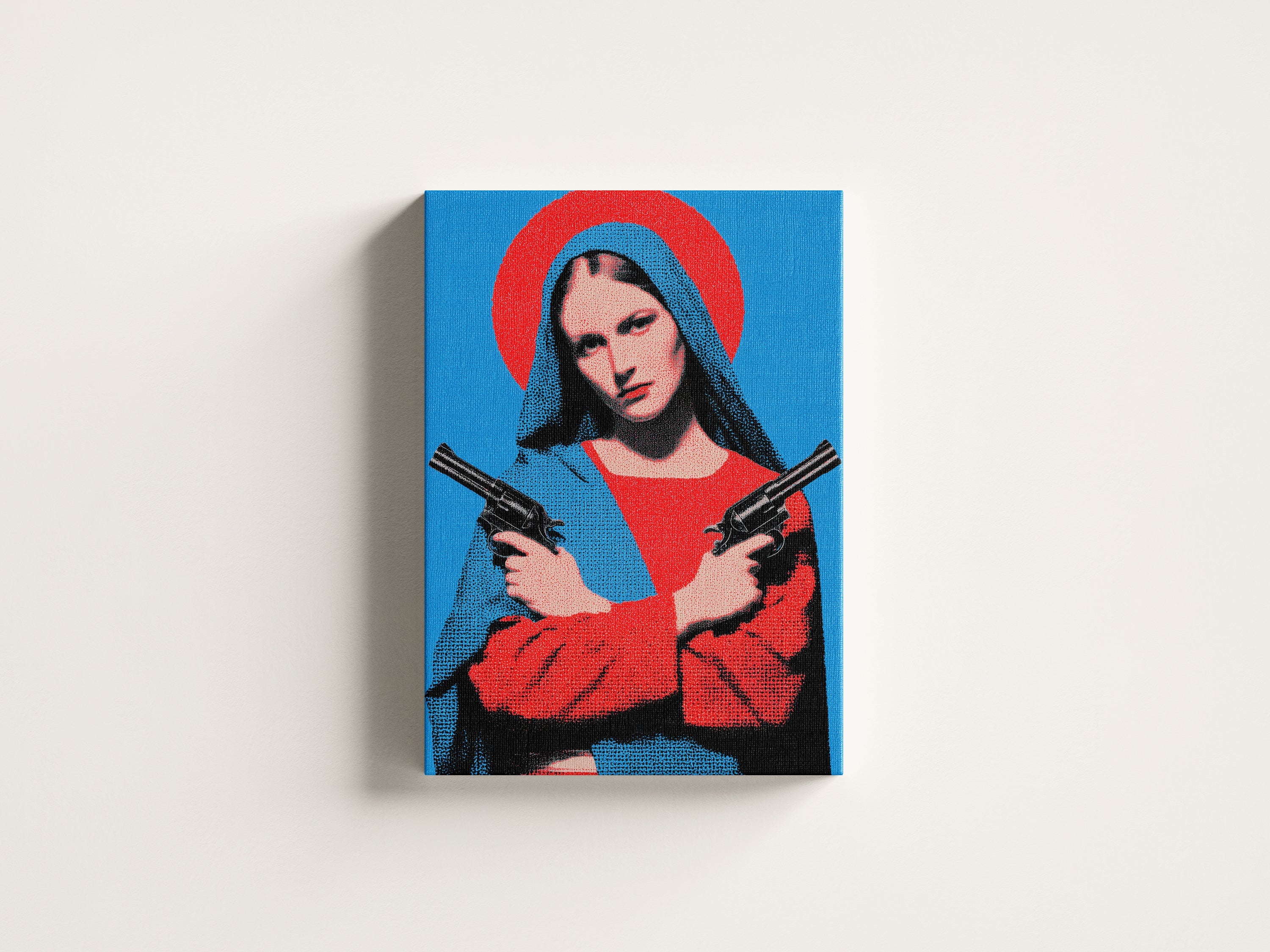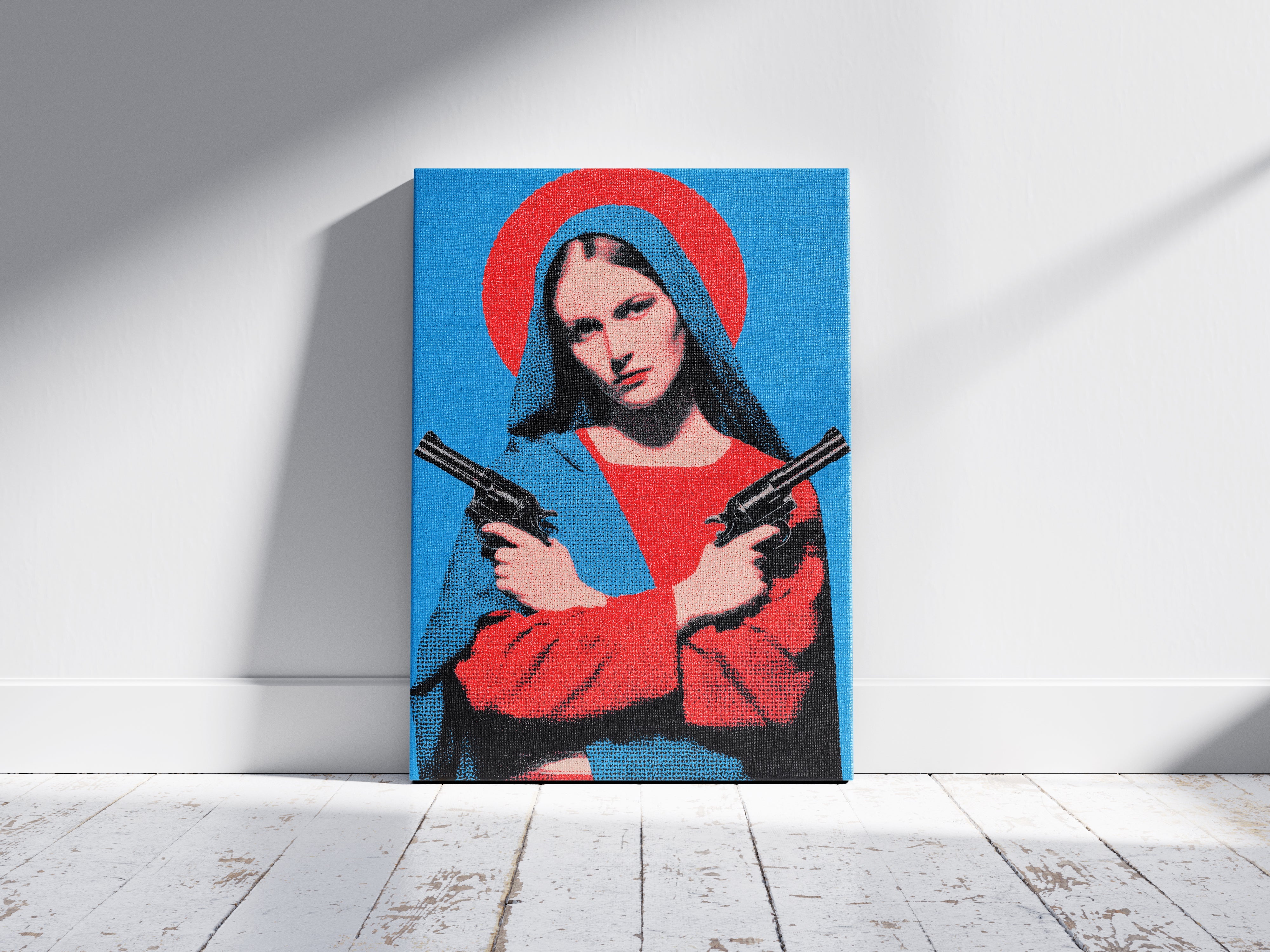 “Sacred Rebellion” blends classical iconography with bold pop-art expression, creating a striking contrast between serenity and defiance. The figure, depicted in vibrant blues and reds, stands framed by a radiant halo while holding crossed symbols of resistance. This juxtaposition challenges traditional narratives and invites viewers to explore themes of power, identity, and modern mythology.
