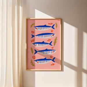 Repeating fish forms and hand-drawn details evoke seaside rhythms, sun-washed days, and the ease of Mediterranean living.
