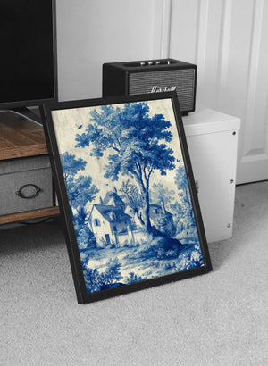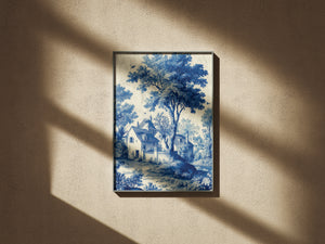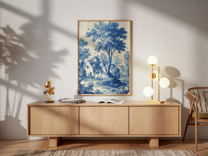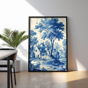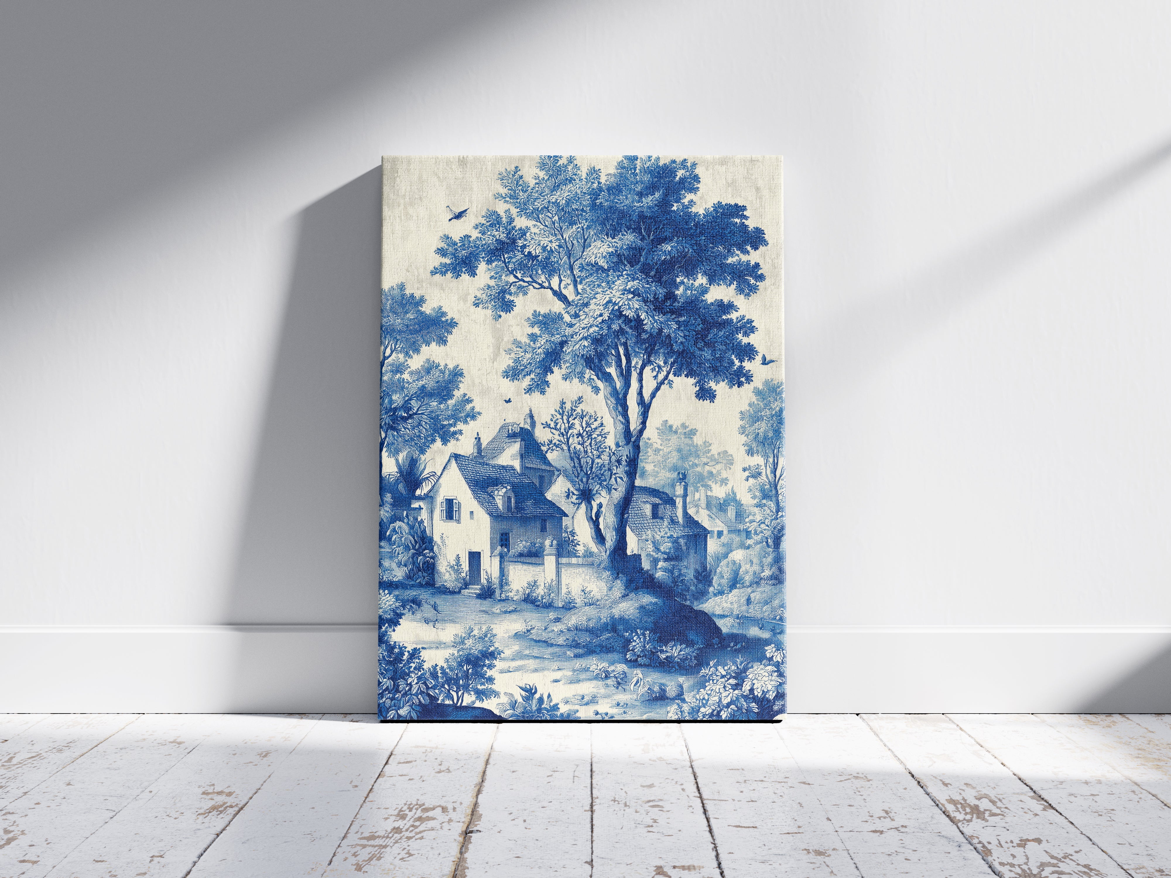 Serene Village in Blue brings the charm of classic French toile art into a modern setting. Featuring a peaceful countryside scene illustrated in rich blue tones, this artwork blends nostalgia, elegance, and fine detail. Perfect for adding a touch of European sophistication to living rooms, bedrooms, and cozy curated spaces.
