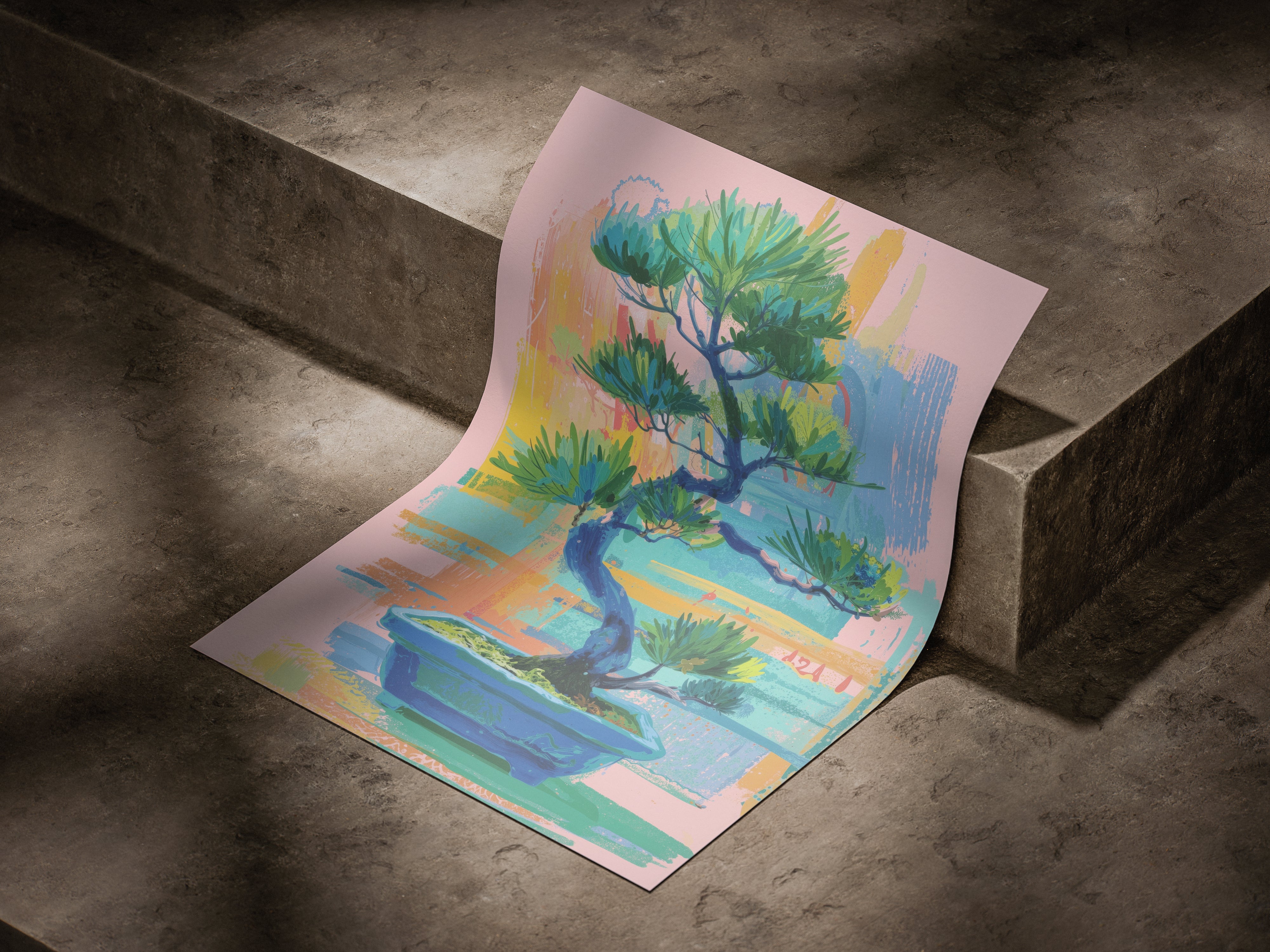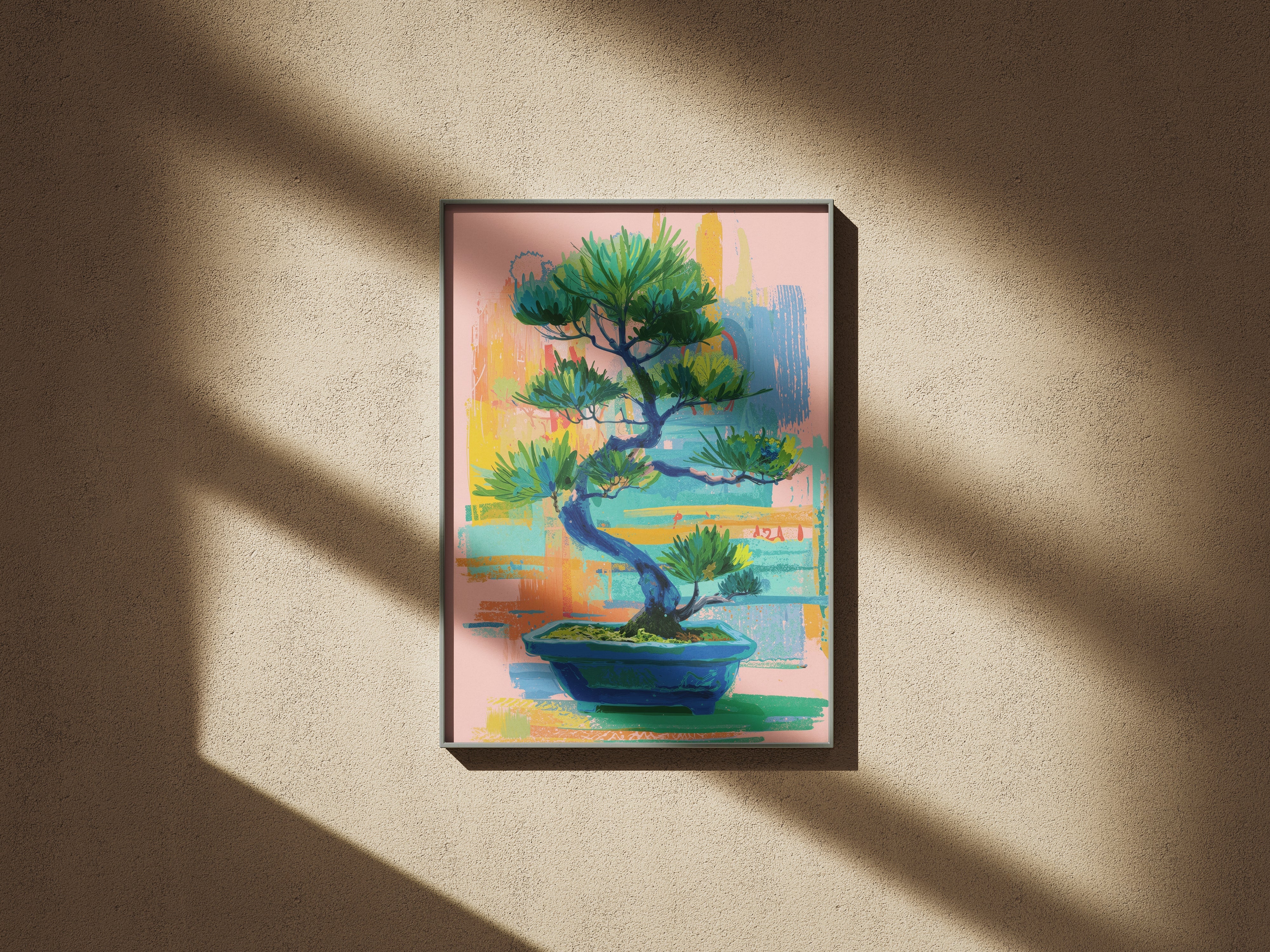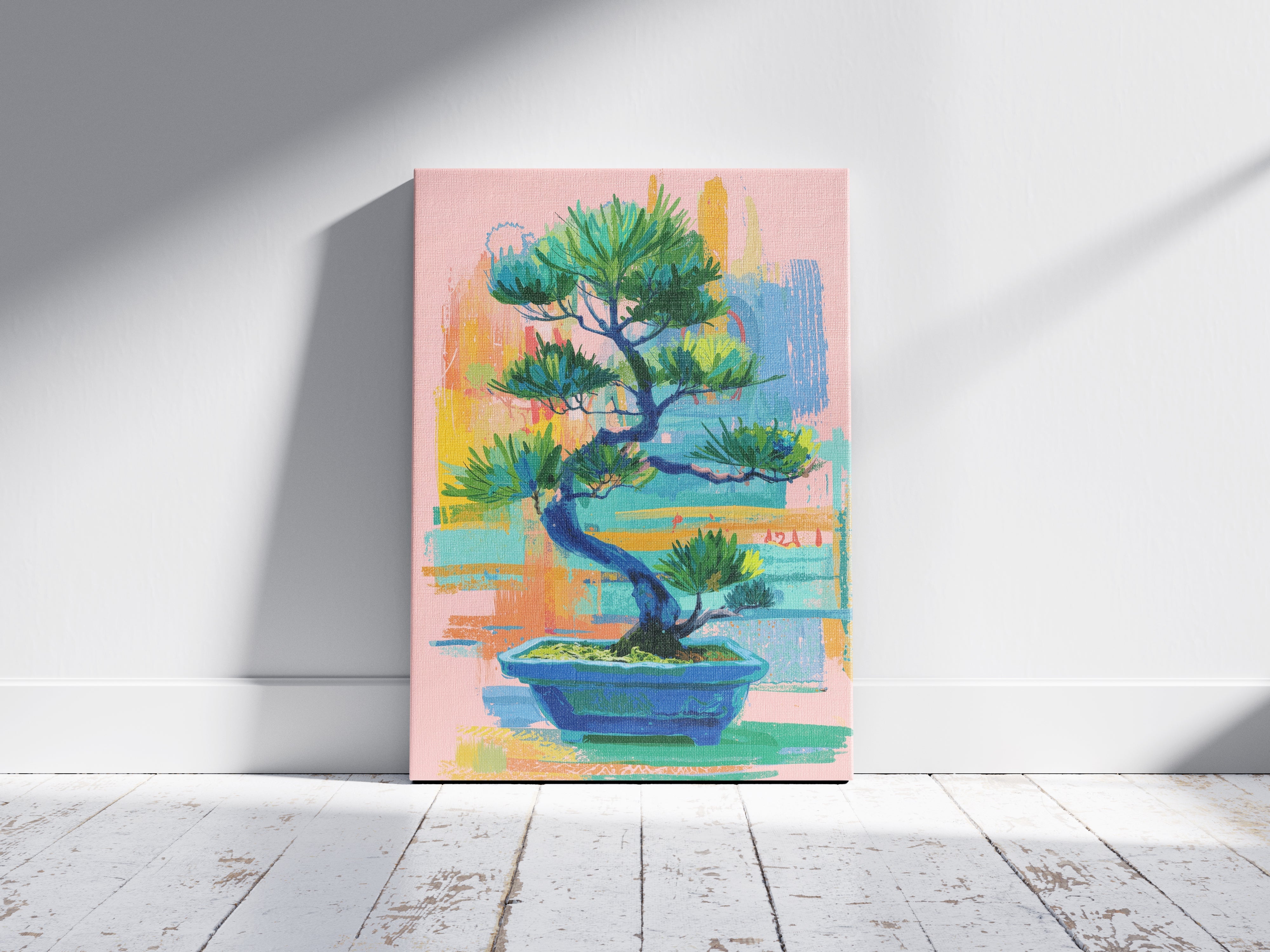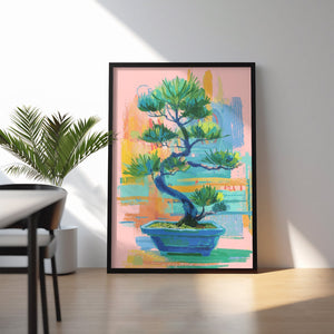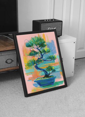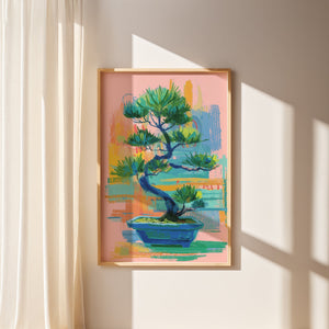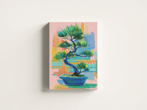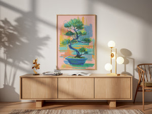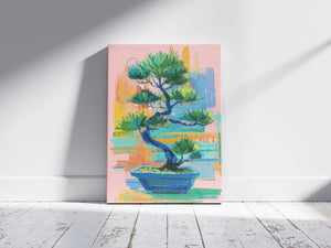 A vibrant contemporary interpretation of a bonsai tree, blending expressive brushstrokes with soothing pastel tones. The artwork balances calmness and energy, capturing the harmony between nature’s stillness and artistic spontaneity. Its layered textures and rich greens evoke renewal, focus, and inner peace, making it a perfect statement piece for modern interiors seeking both color and tranquility.