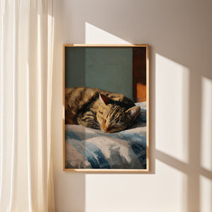 This piece celebrates the beauty of the everyday a tabby, a bed, a moment where nothing is asked, and nothing is missing.
