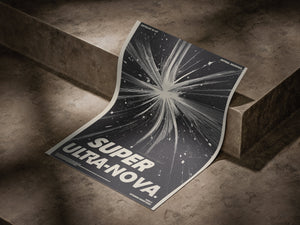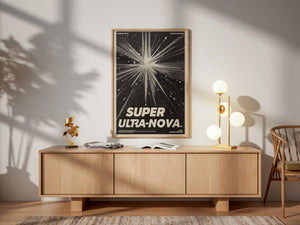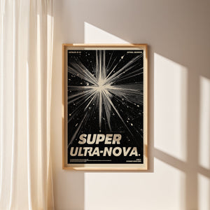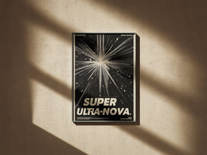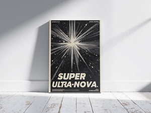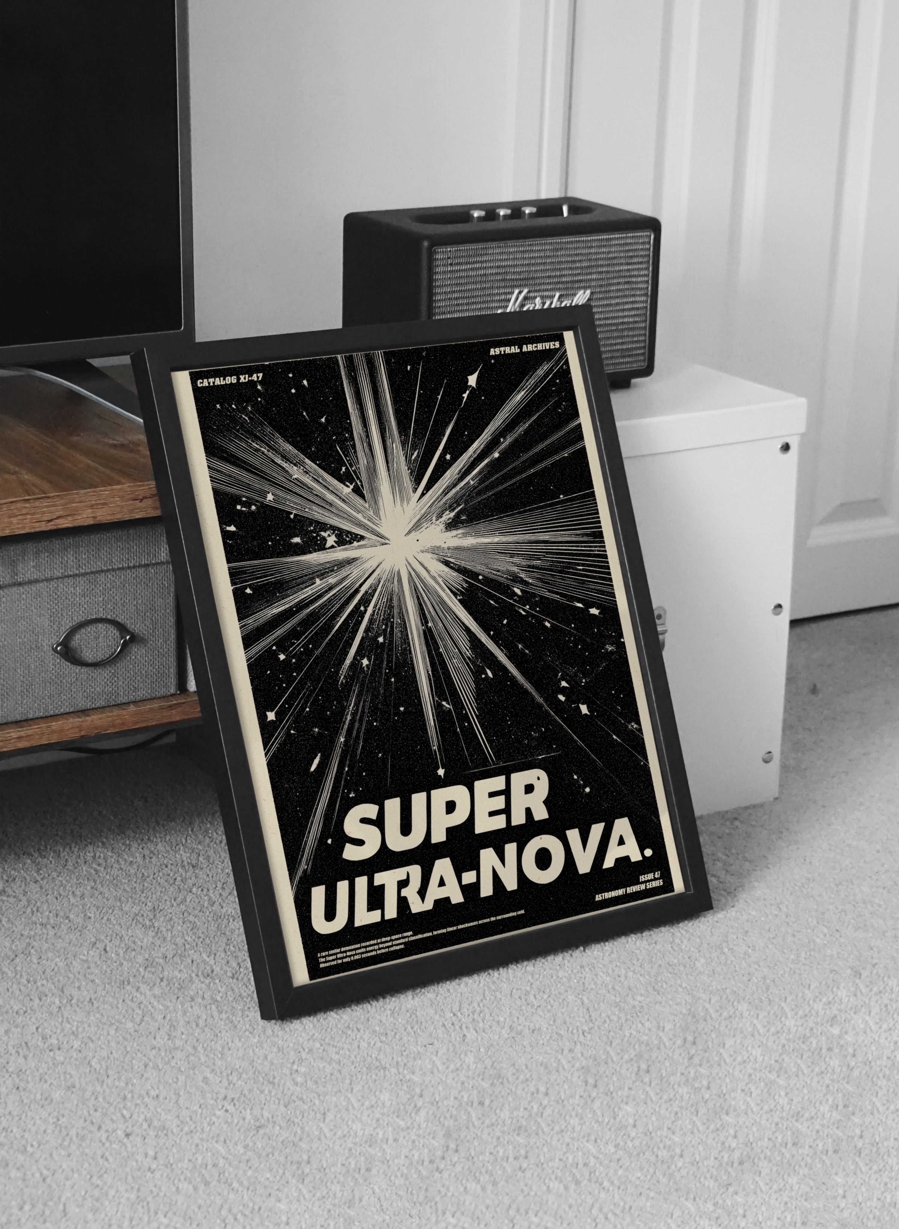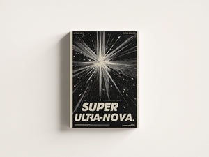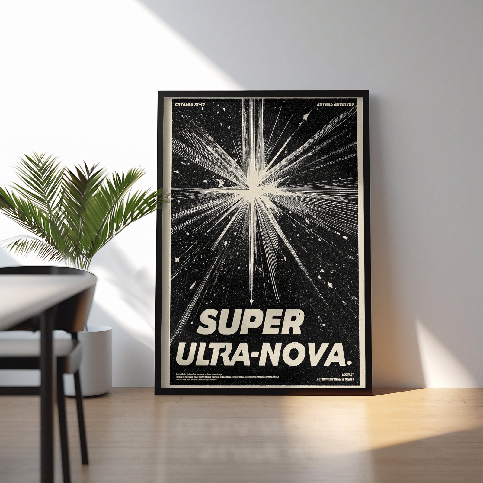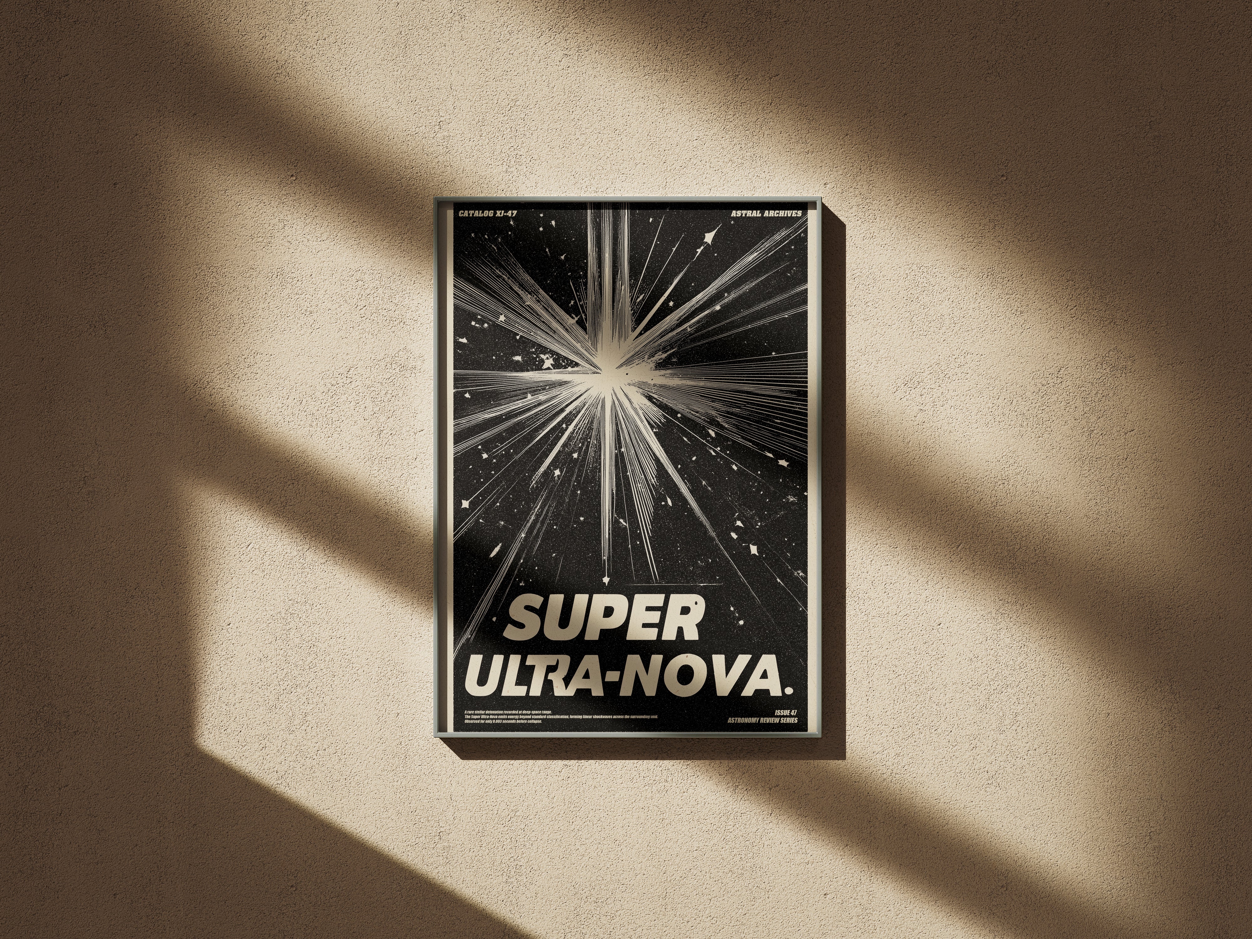 “Stellar Burst Archive” is designed in the style of a vintage astronomical magazine cover, capturing the explosive beauty of a massive cosmic event. Radiating lines, grainy textures, and retro typography combine to create a bold sci-fi aesthetic that feels both nostalgic and timeless. This artwork celebrates humanity’s fascination with deep space, supernovas, and the mysteries of the universe.
