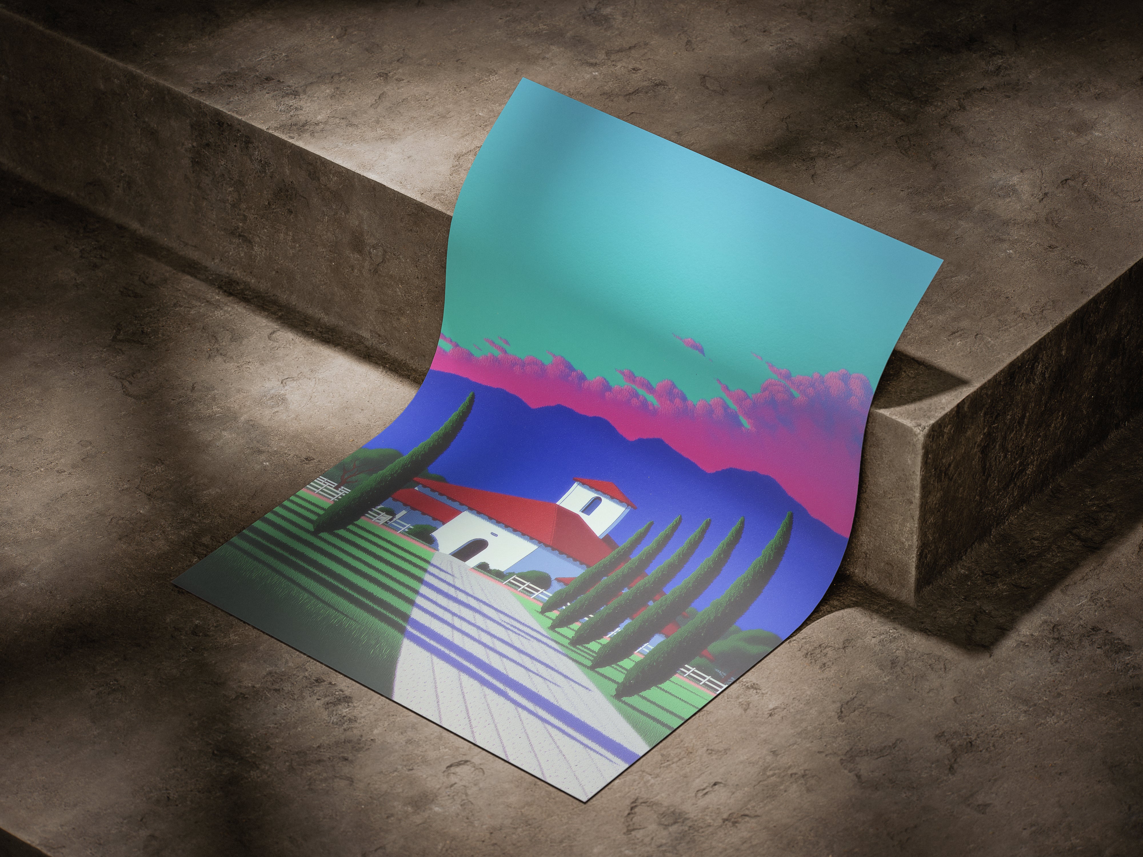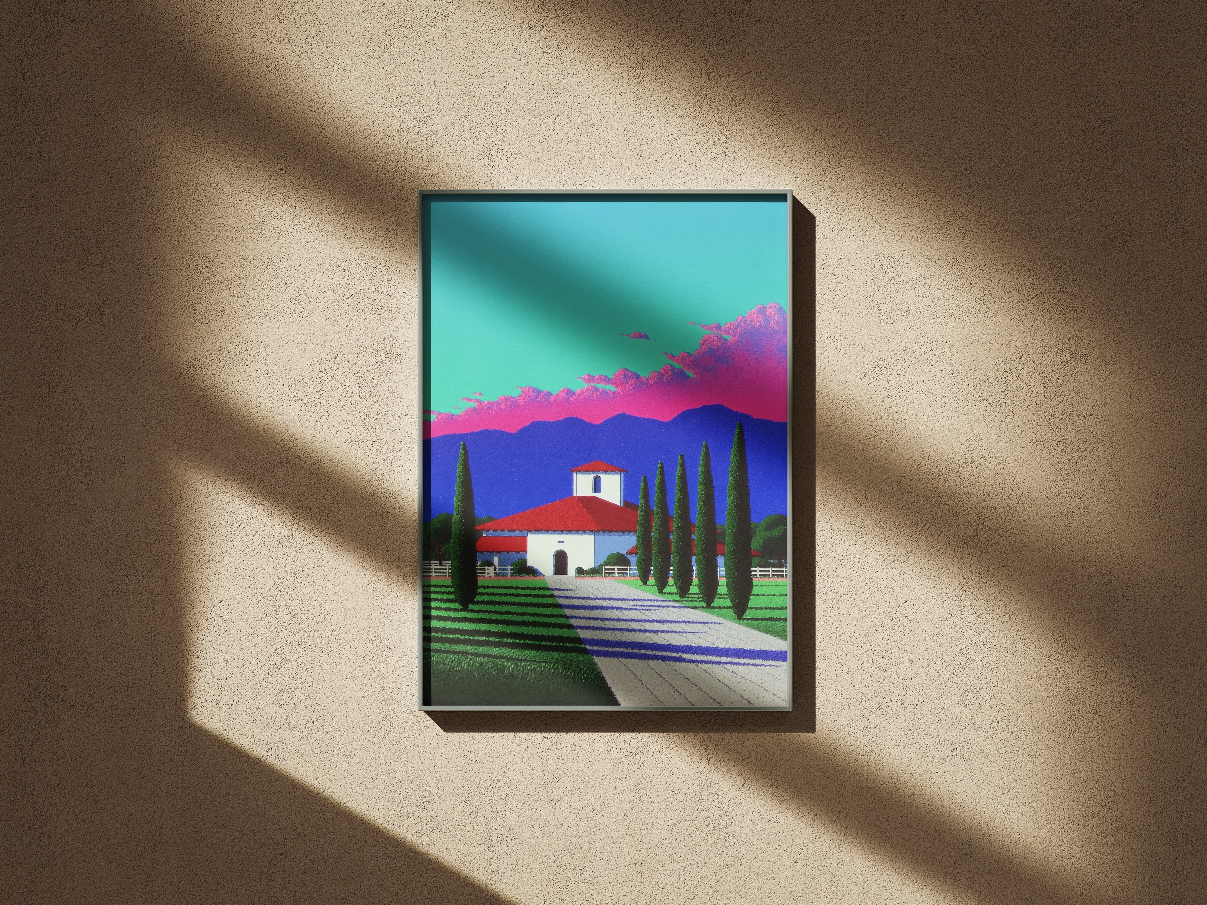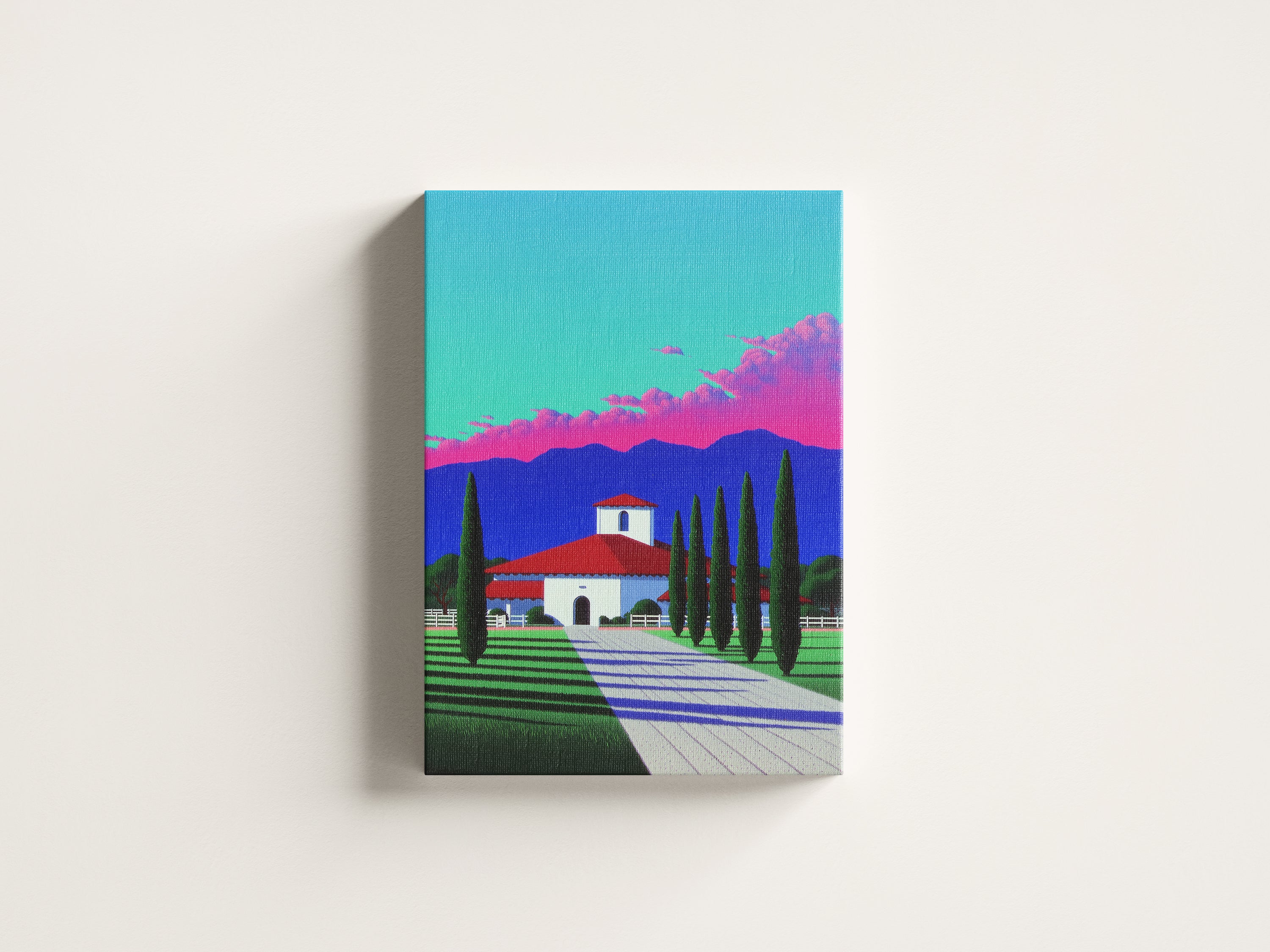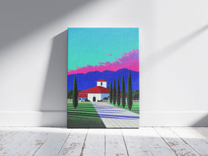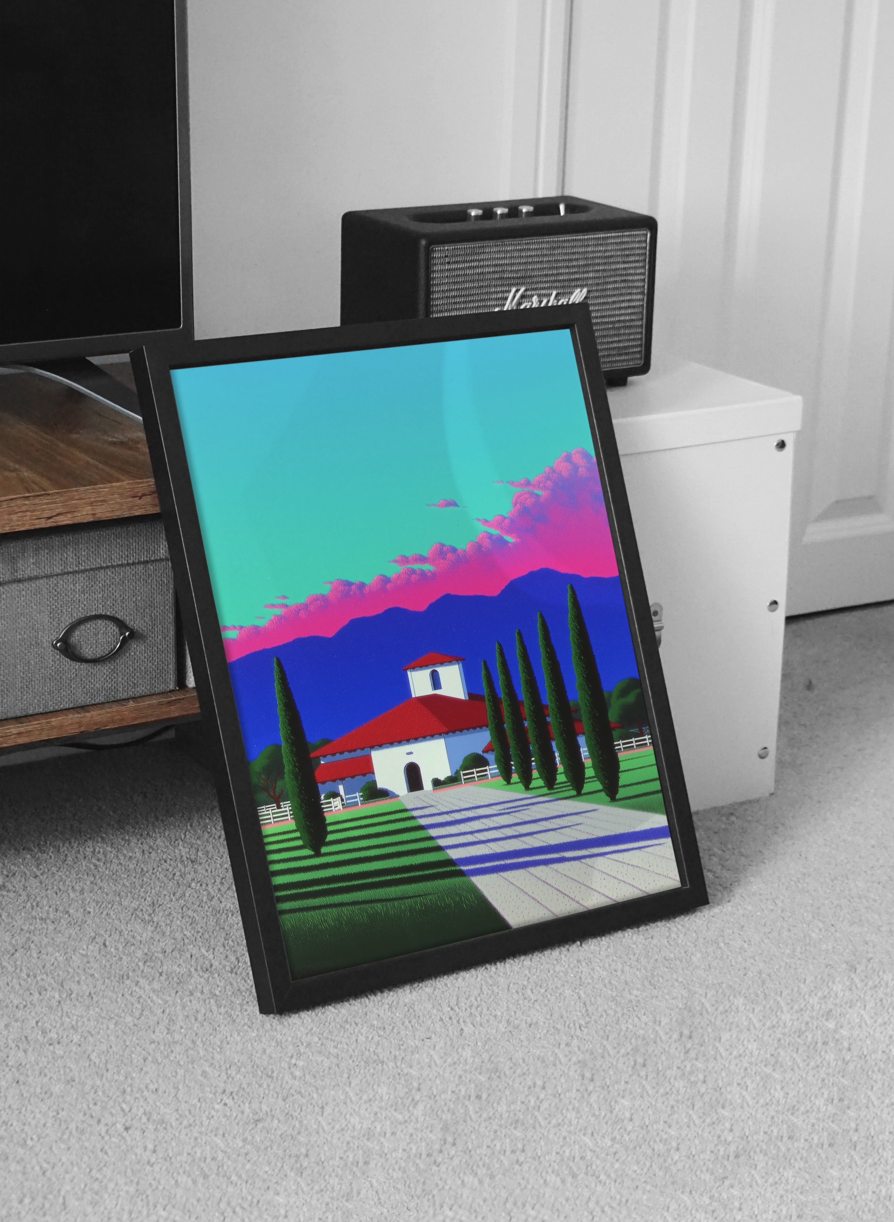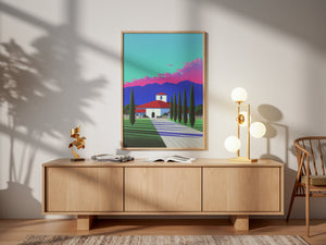 A serene neo-retro landscape featuring a sunlit estate framed by tall cypress trees and distant blue mountains. The vivid gradient sky, shifting from turquoise to electric pink, brings a nostalgic 80s dreamscape energy, while the clean architectural lines evoke calm, order, and Mediterranean warmth. This artwork creates a perfect balance between escapism and elegance, making it ideal for interiors wanting color, tranquility, and a touch of cinematic nostalgia.