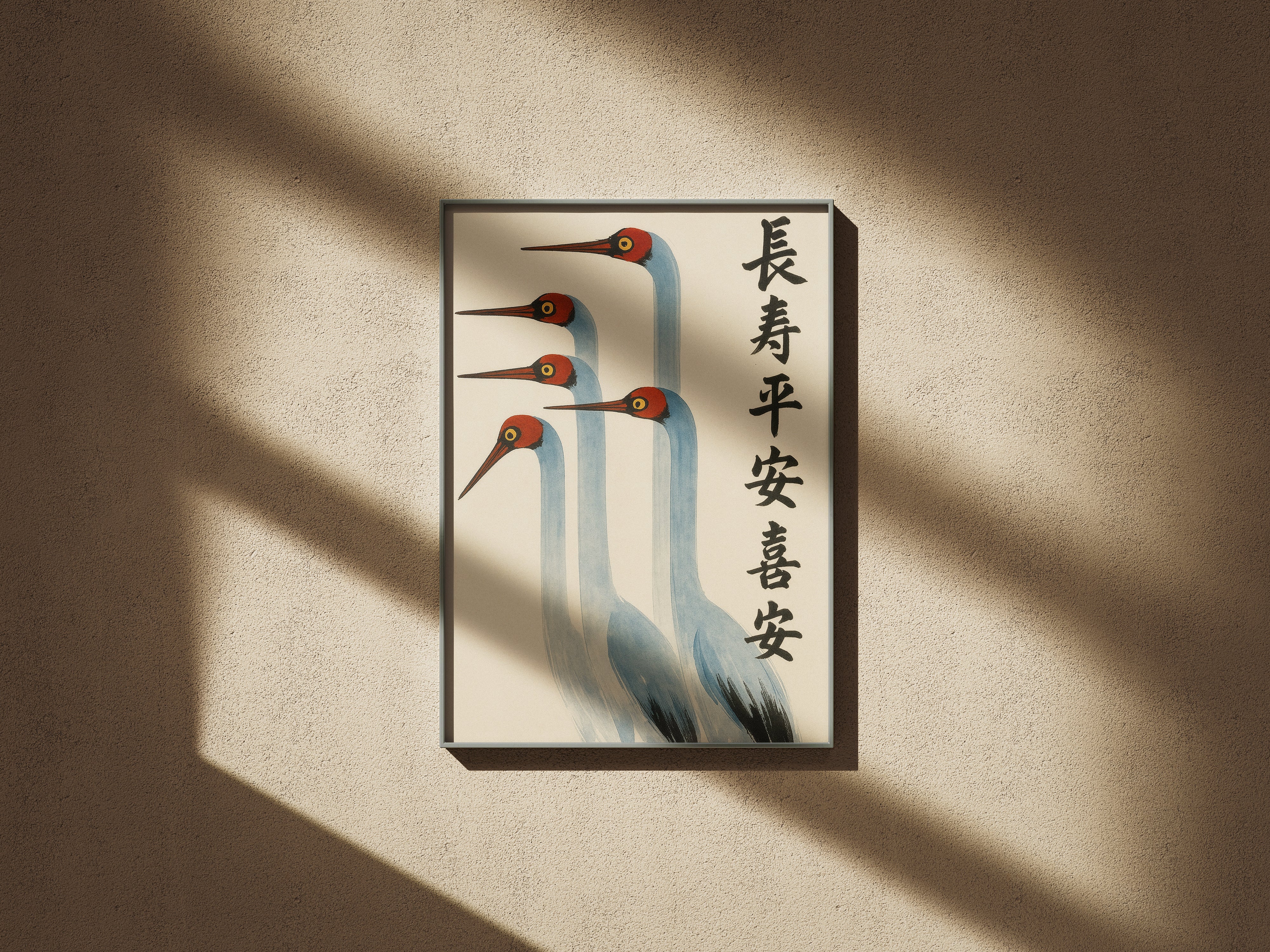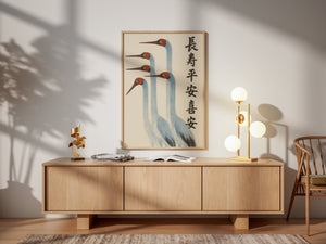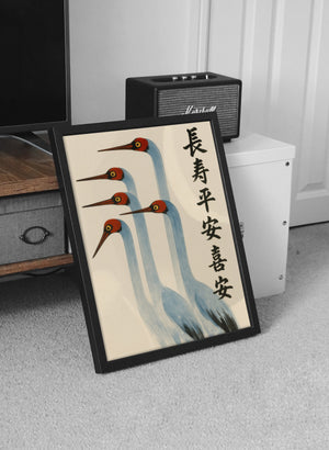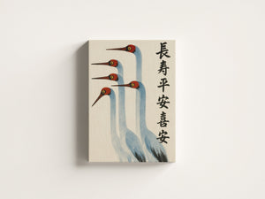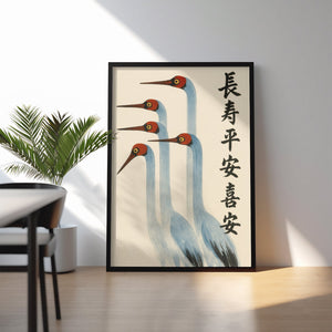 The artwork features four graceful red-crowned cranes - timeless symbols of longevity, good fortune, purity, and harmony in East Asian tradition.