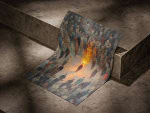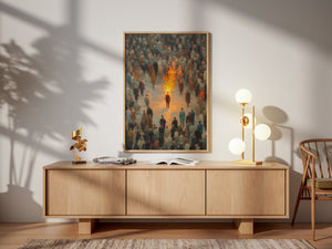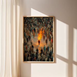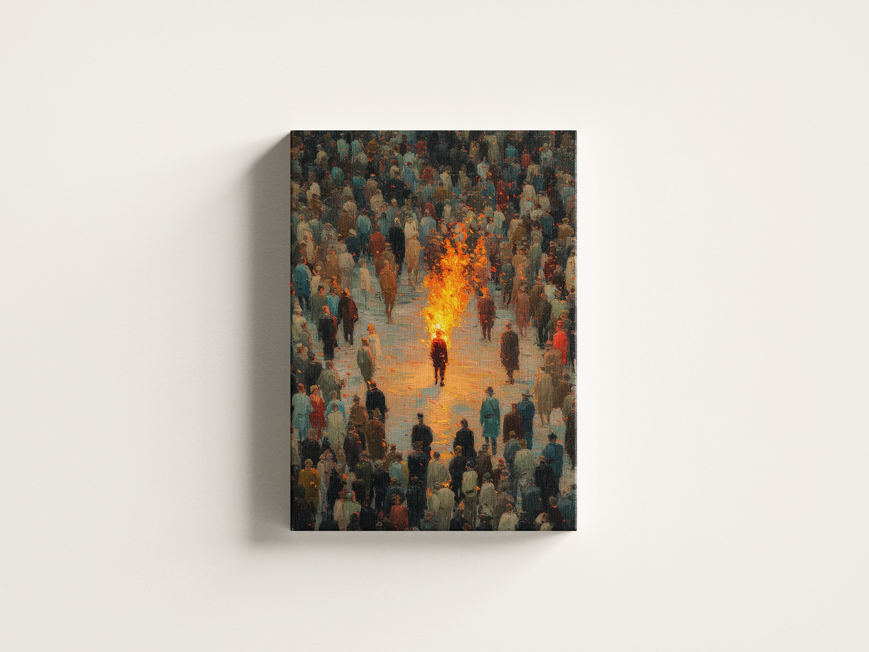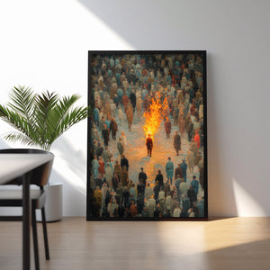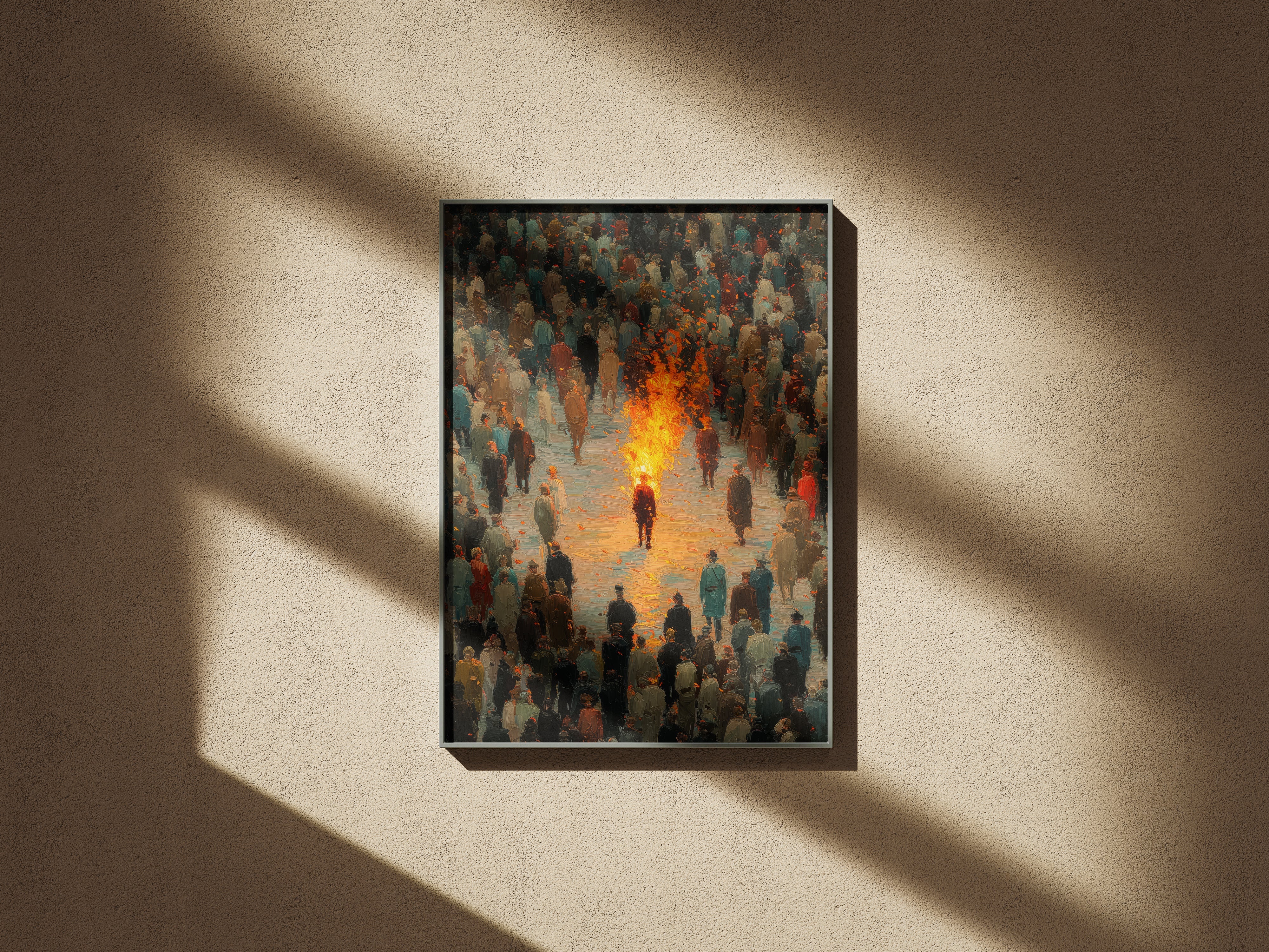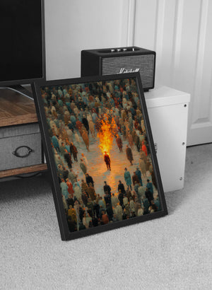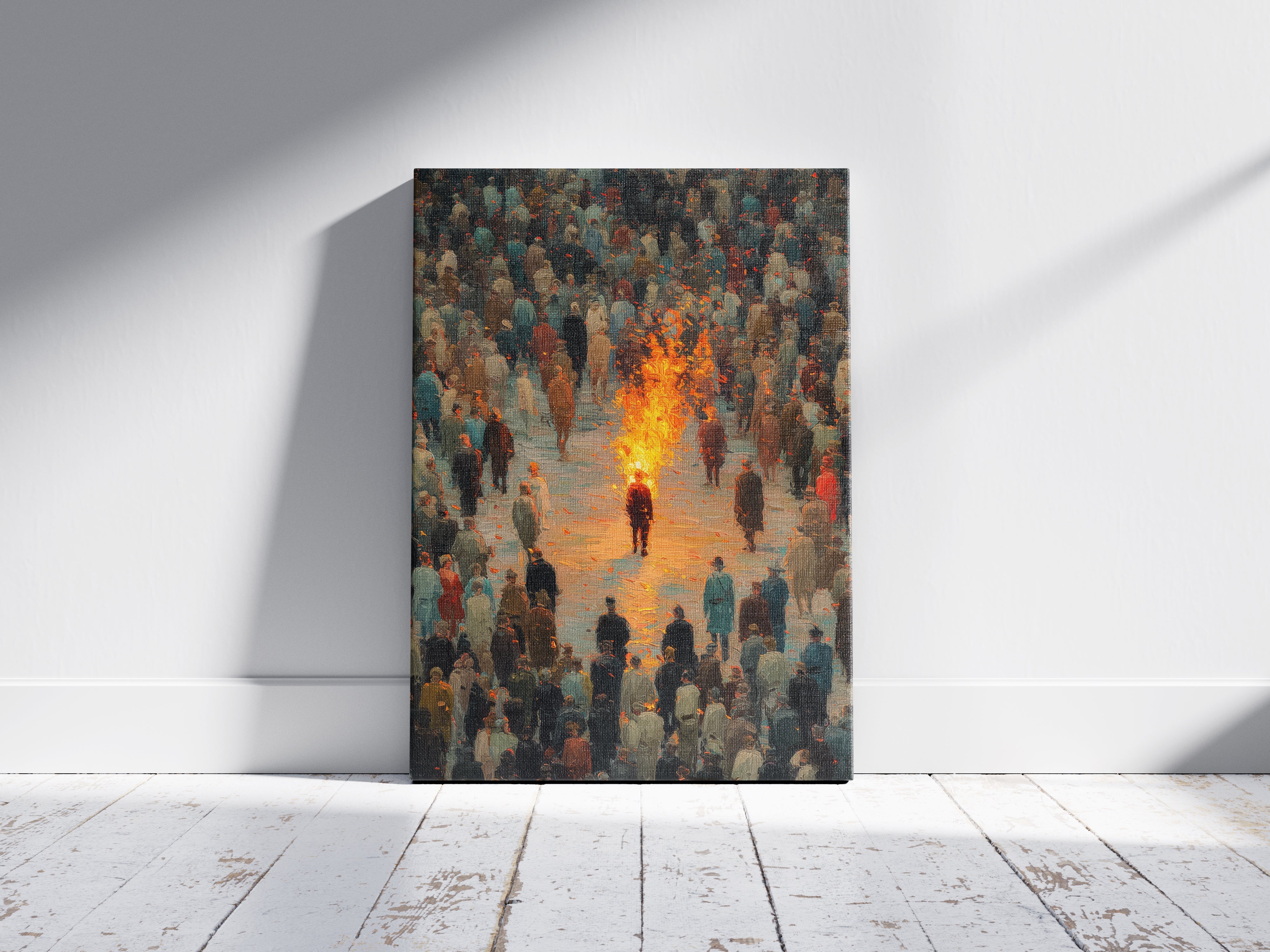 The One Who Burns depicts a lone figure moving against the flow of a silent crowd, carrying a flame that cannot be ignored. Surrounded by muted tones and anonymous forms, the fire becomes a symbol of conviction, resistance, and inner truth. This artwork explores the tension between individuality and conformity what it costs to stand apart, and what it means to carry light in a world content with shadows. A bold, unsettling piece that commands attention and reflection.