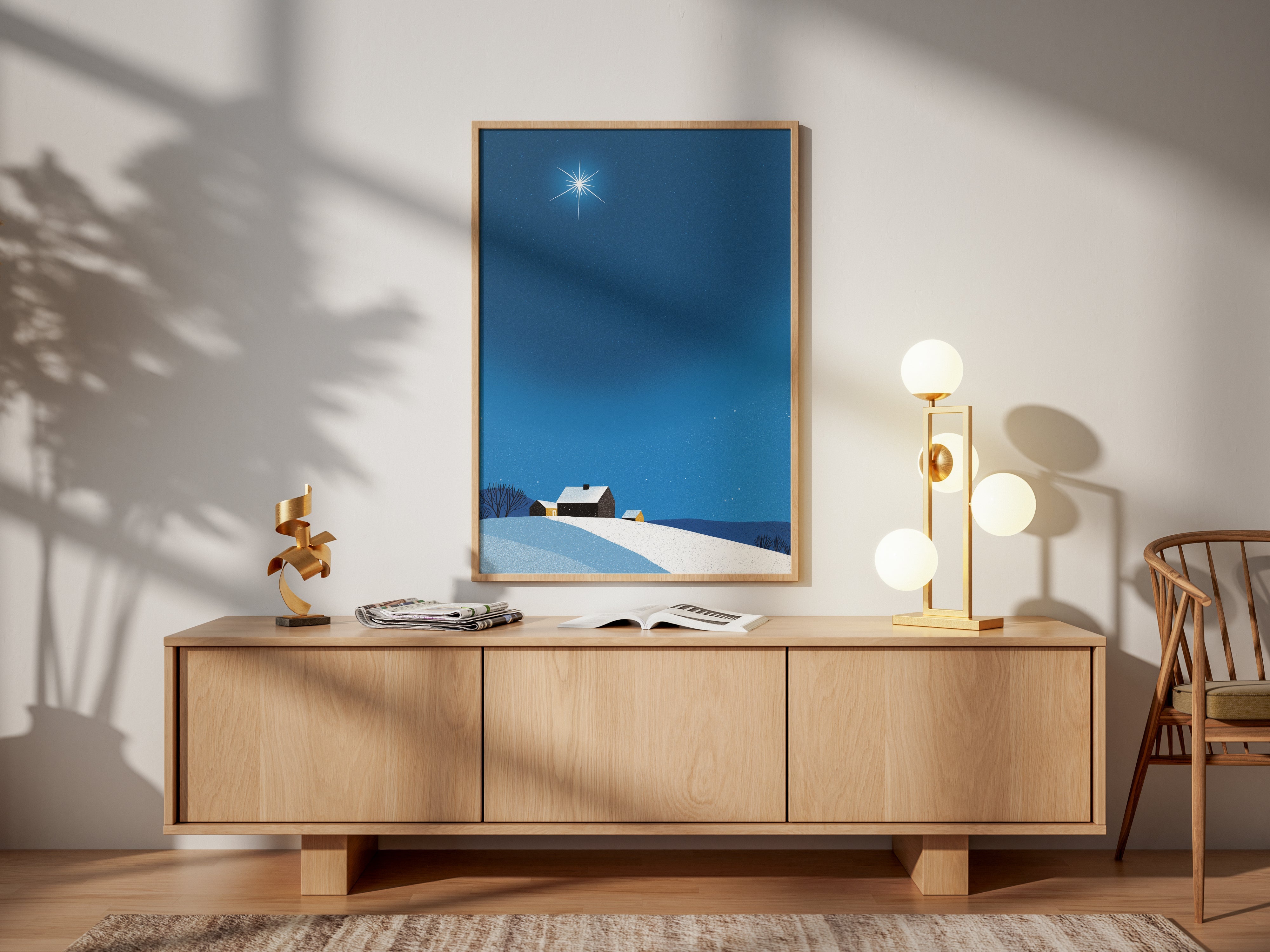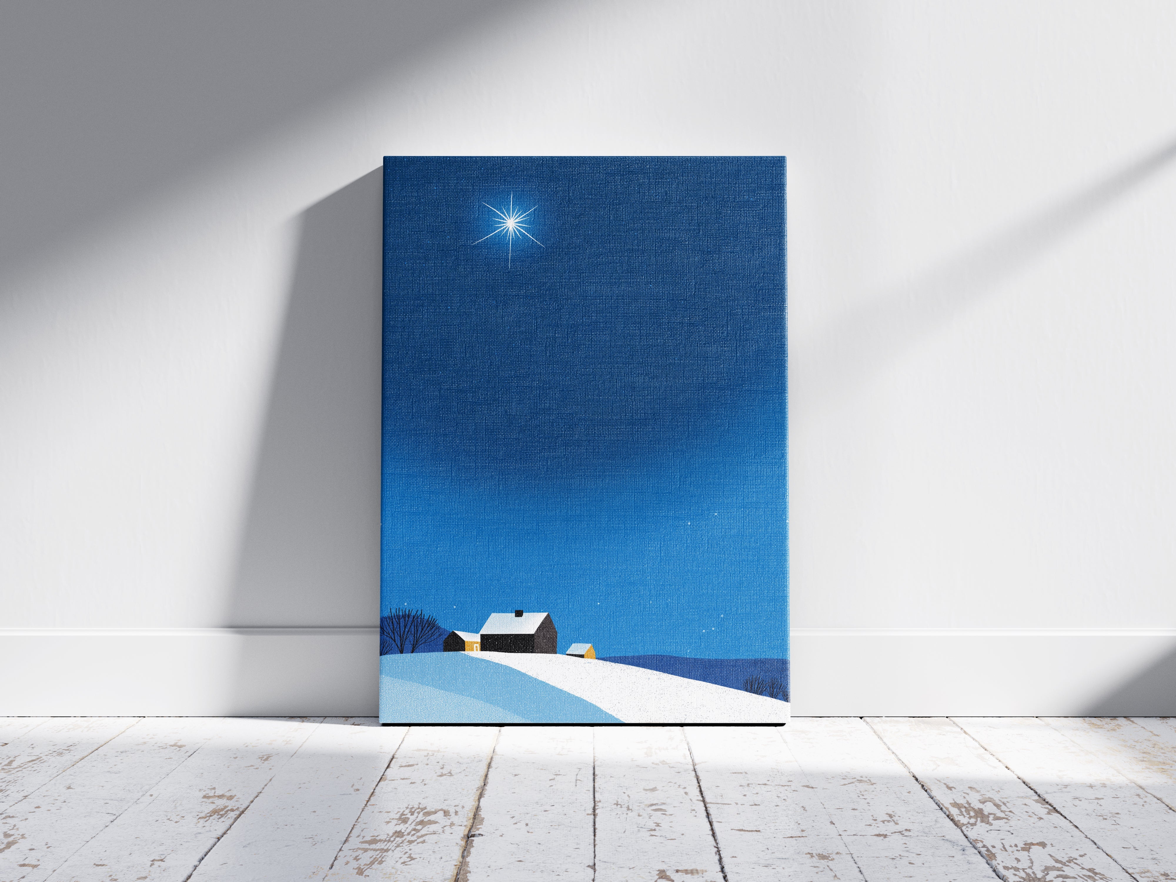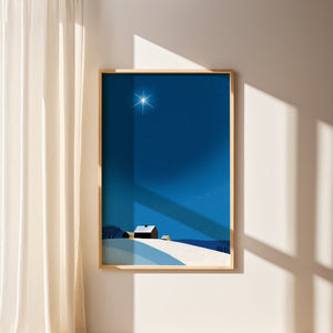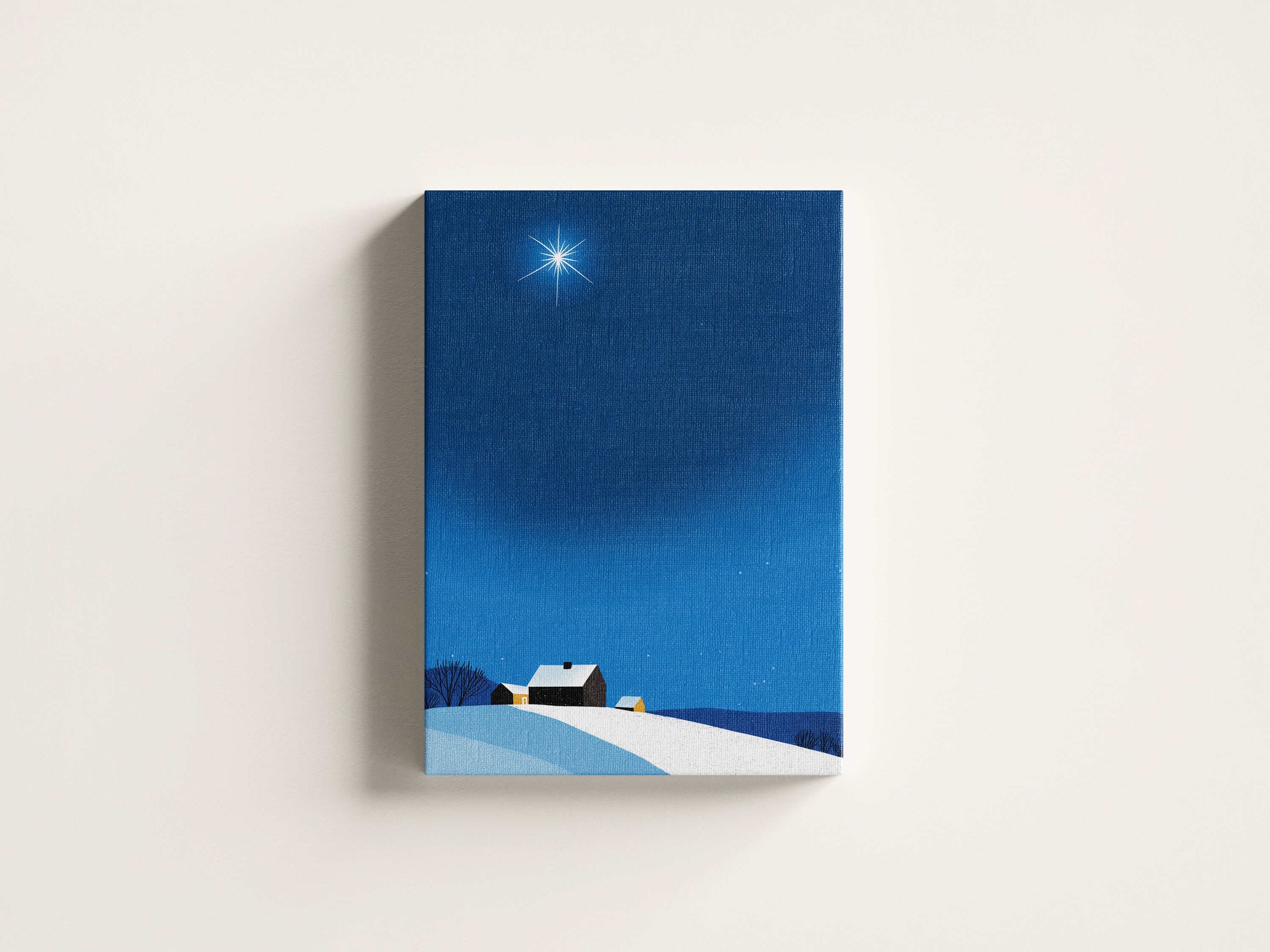 Beneath a vast winter sky, a single star holds the night in balance. Snow-covered hills soften the land, while a lone cottage rests in silence, warmed by a faint inner glow. Nothing moves, yet everything feels present. The Quiet Star is a meditation on stillness and hope a moment where light does not dominate the darkness, but gently coexists with it, guiding without sound.