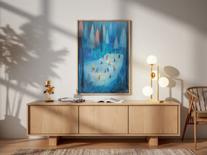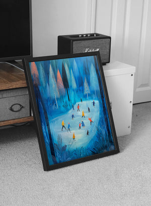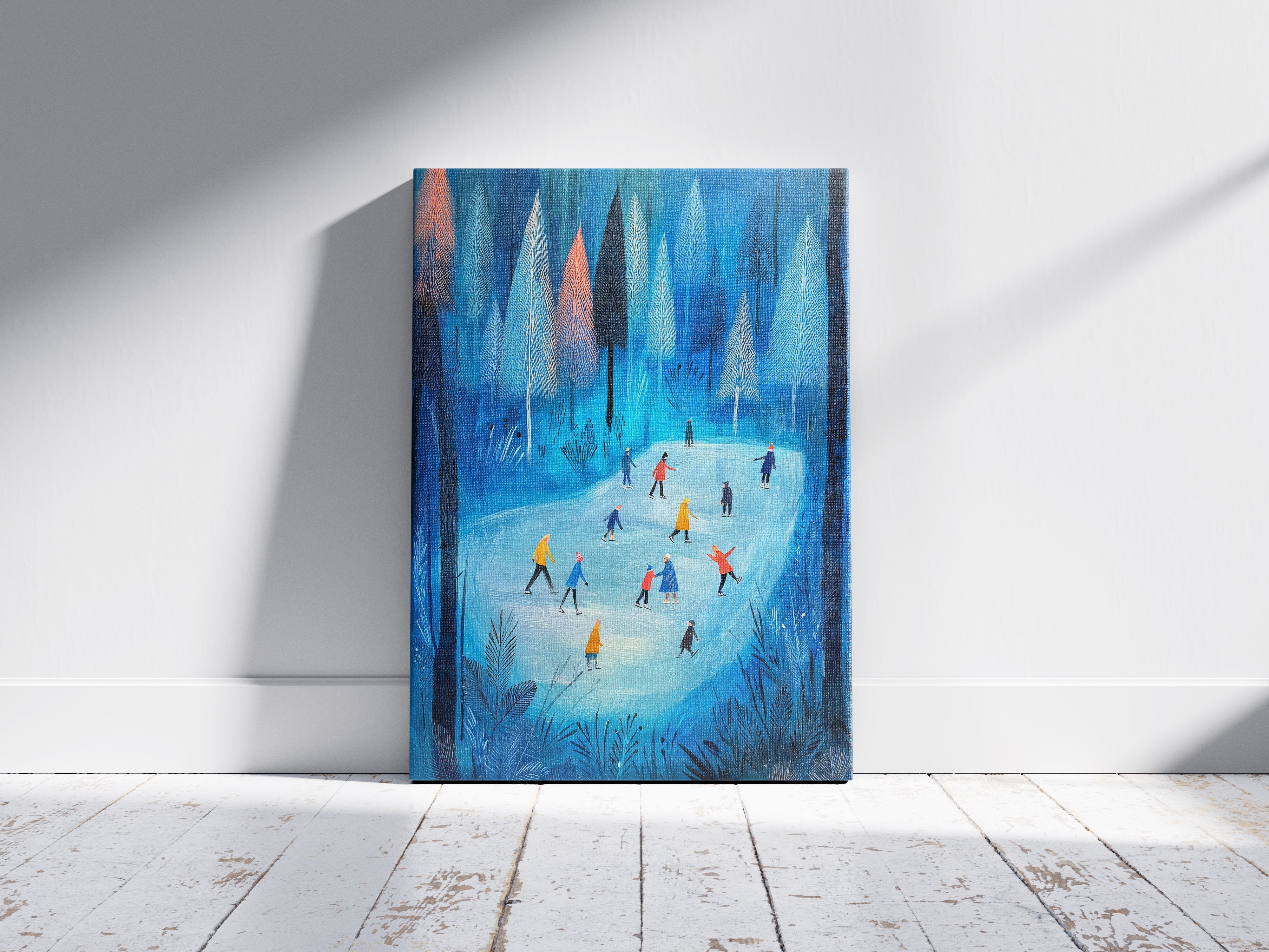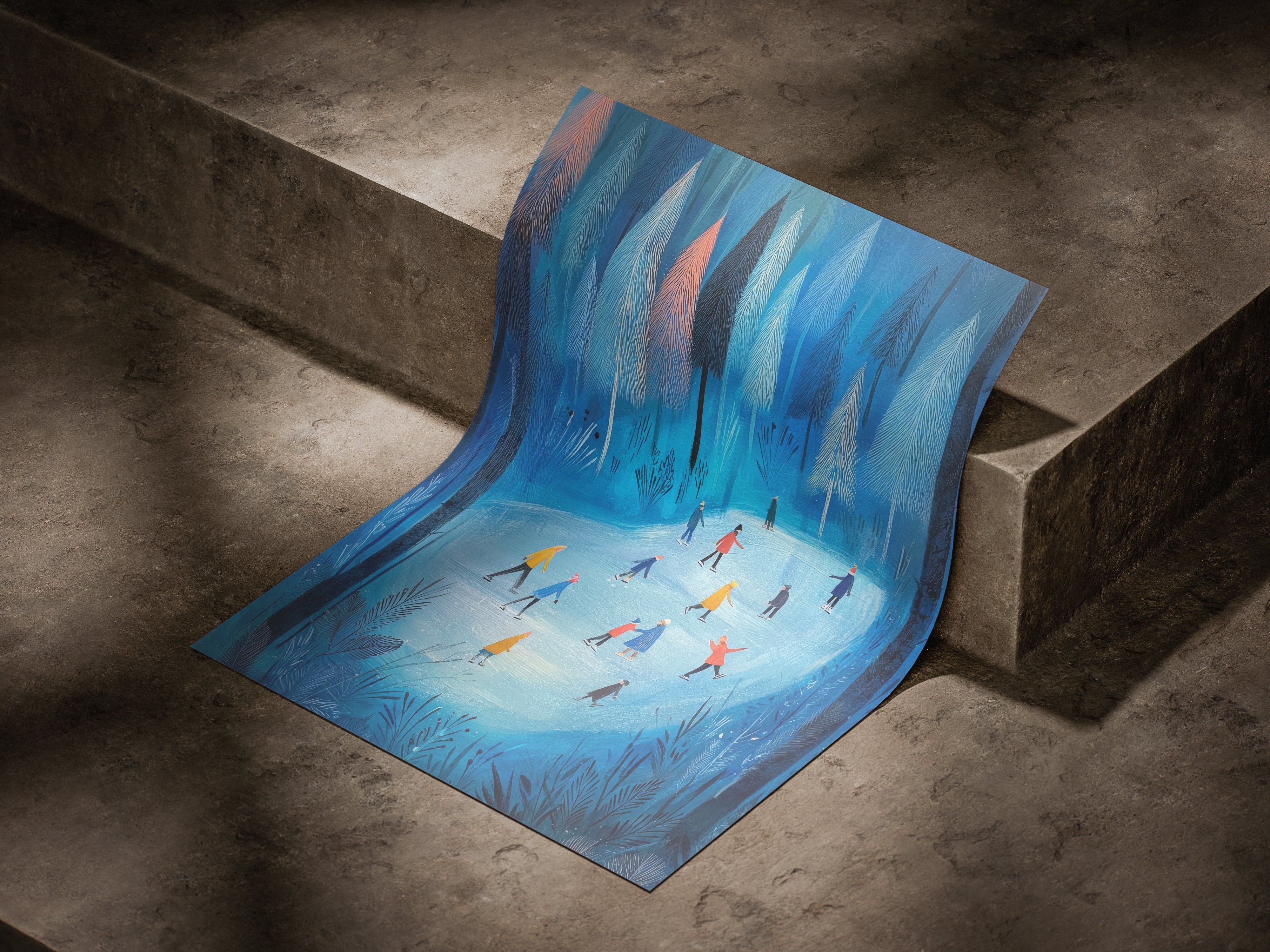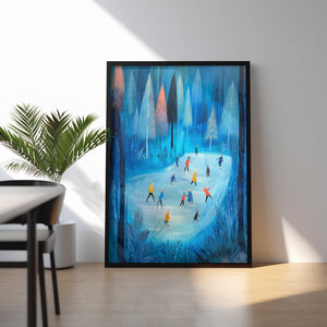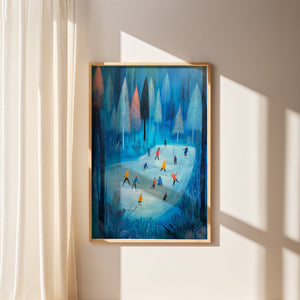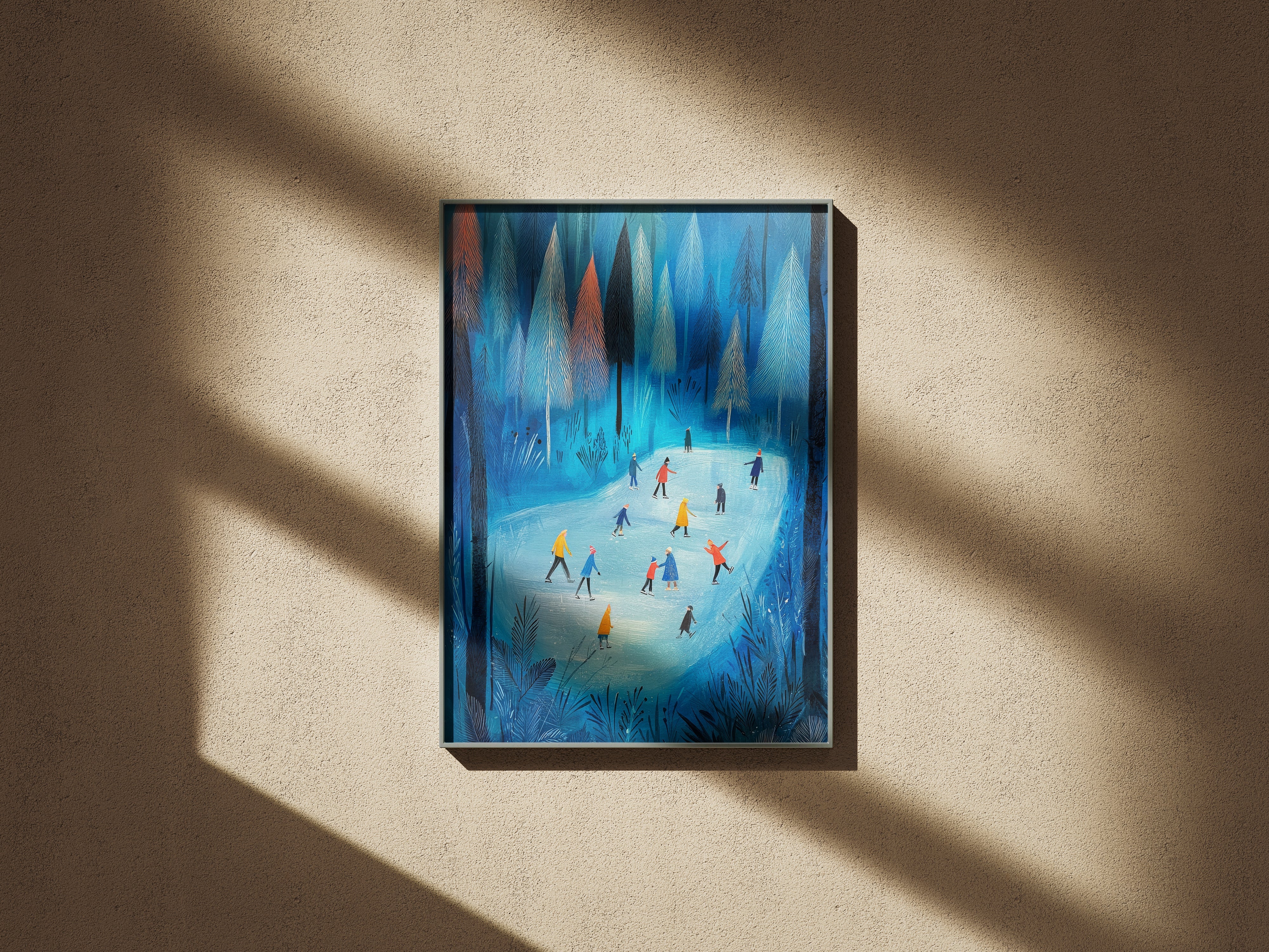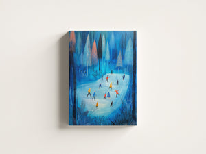 “Together in Winter” captures the warmth of shared moments in a peaceful, snow-covered forest. Colorful skaters glide across a frozen pond, surrounded by soft winter trees that glow with gentle, dreamy tones. The artwork blends cozy storytelling with a touch of nostalgia—celebrating togetherness, joy, and the simple magic of winter days.