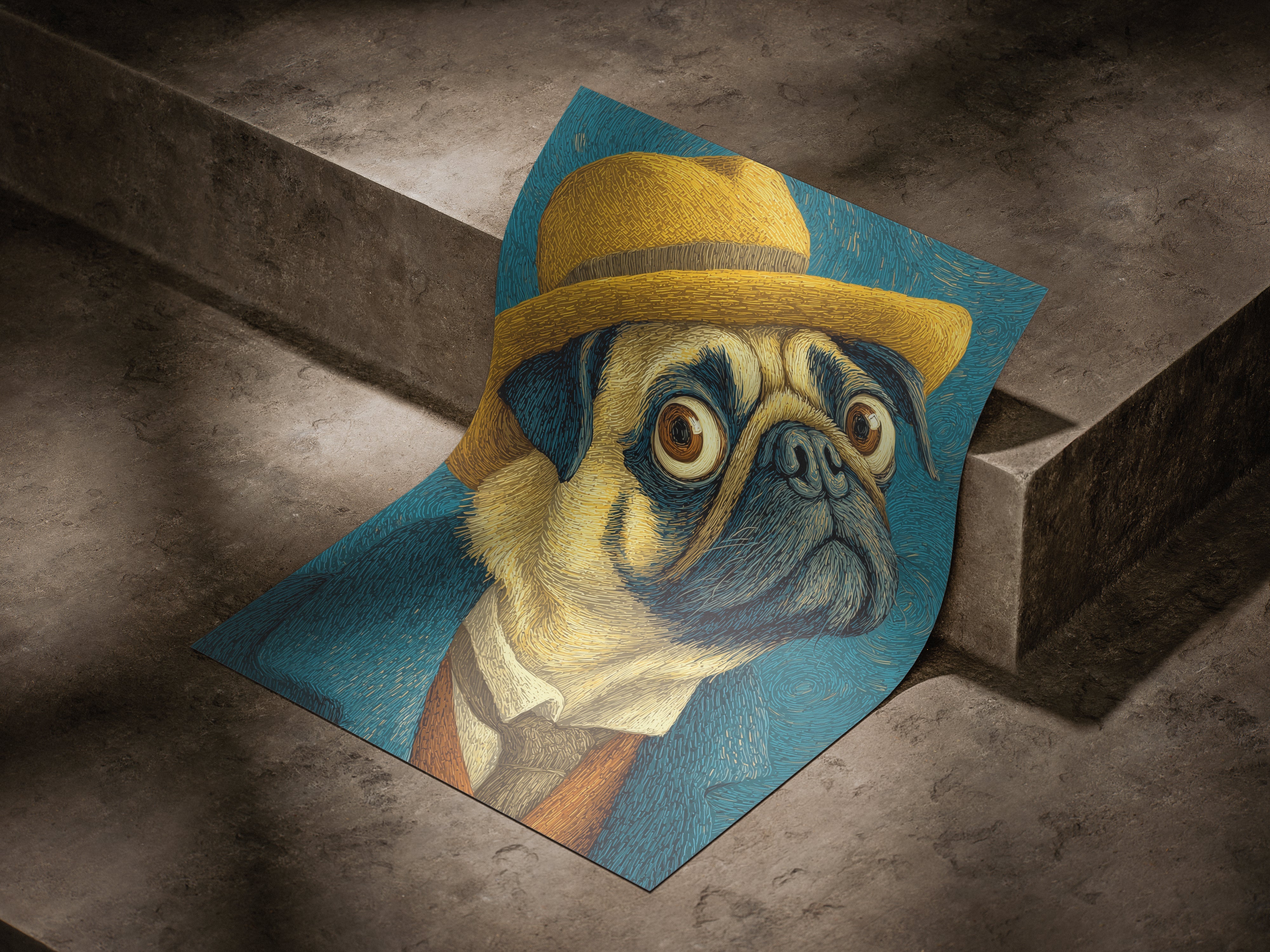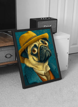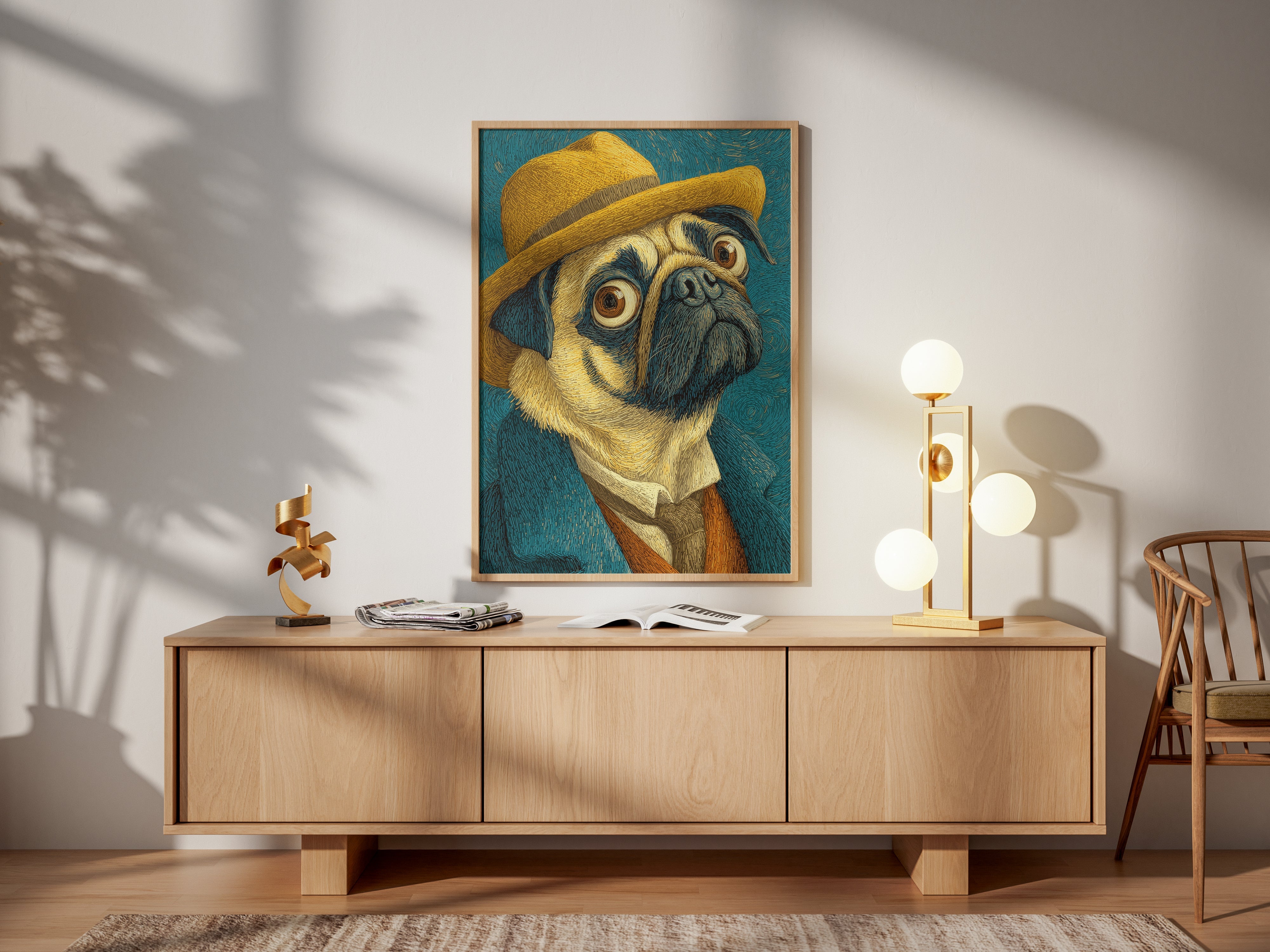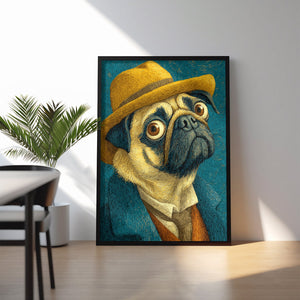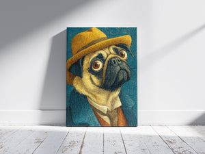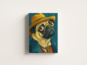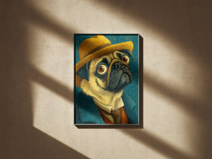 “Van Pug” blends the playful charm of a pug with the expressive, swirling texture of a Van Gogh–inspired art style. Rich brush strokes, deep teal tones, and the character’s iconic mustard hat create a portrait that feels both humorous and artistically striking. This unique fusion of whimsy and fine art makes “Van Pug” a standout piece that instantly warms any room.