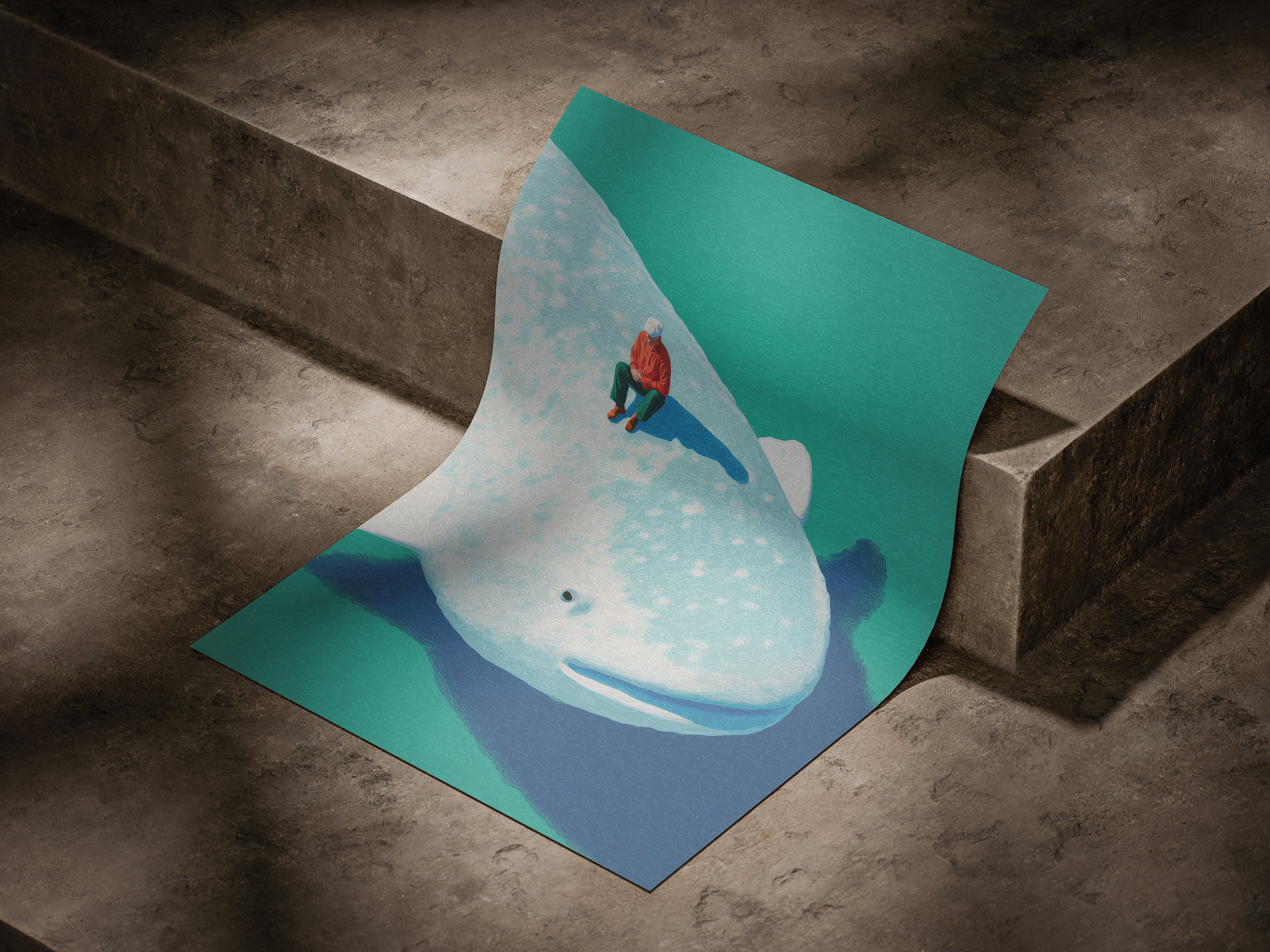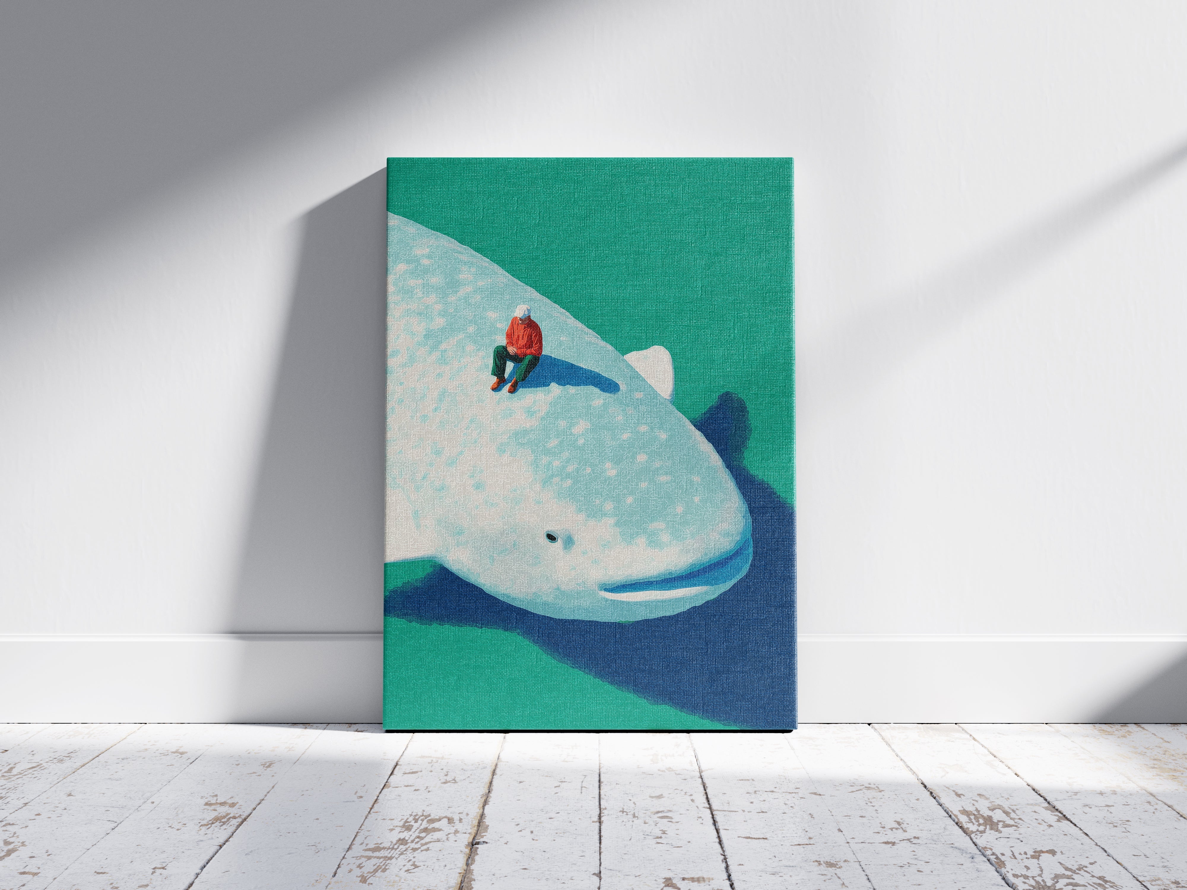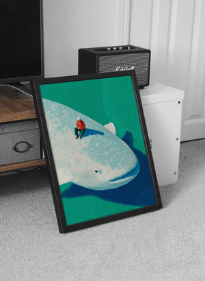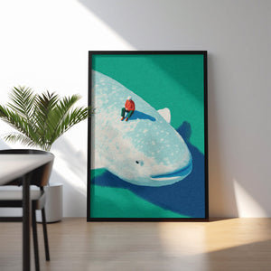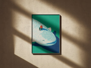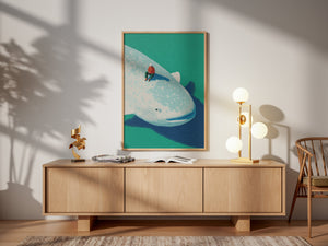 Drifting between reality and imagination, Whale Daydream captures a serene moment atop a gentle giant of the ocean. Soft colors, dreamy light, and a sense of quiet wonder make this artwork a perfect statement piece for any modern space. Ideal for those who love minimal aesthetics, surreal storytelling, and ocean-inspired art.