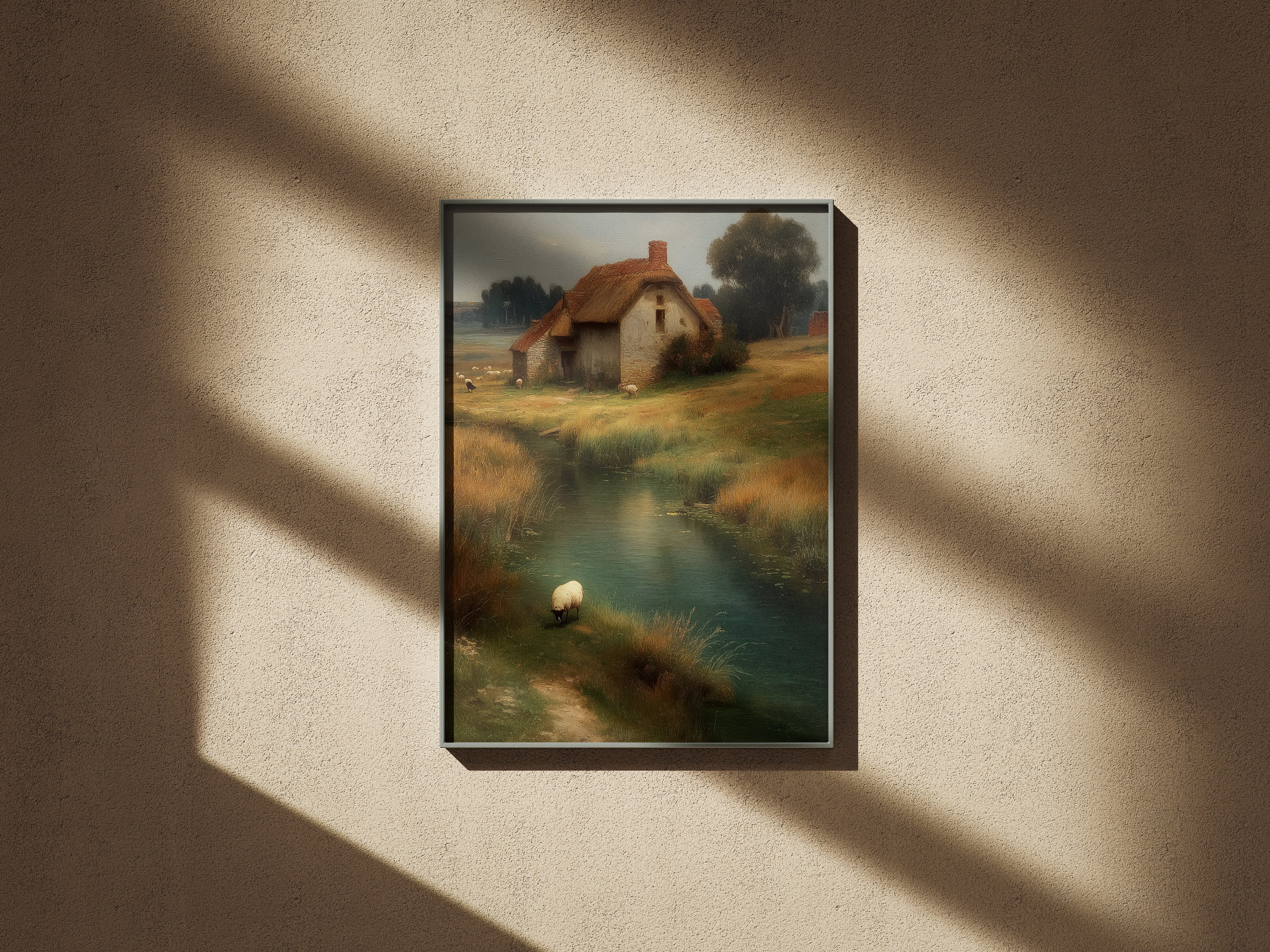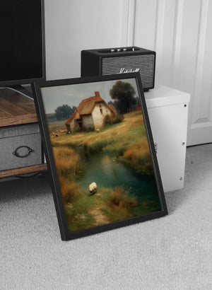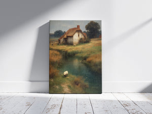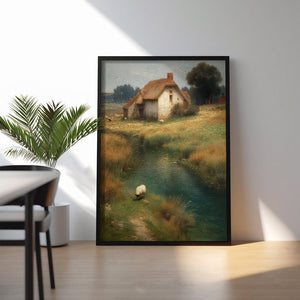 “Whispers of the Countryside” captures the quiet poetry of rural life — a sunlit cottage by a gentle stream, golden fields swaying in the wind, and a lone sheep peacefully wandering along the water’s edge.