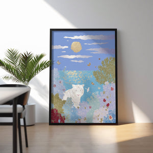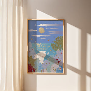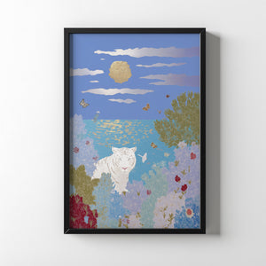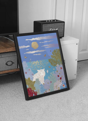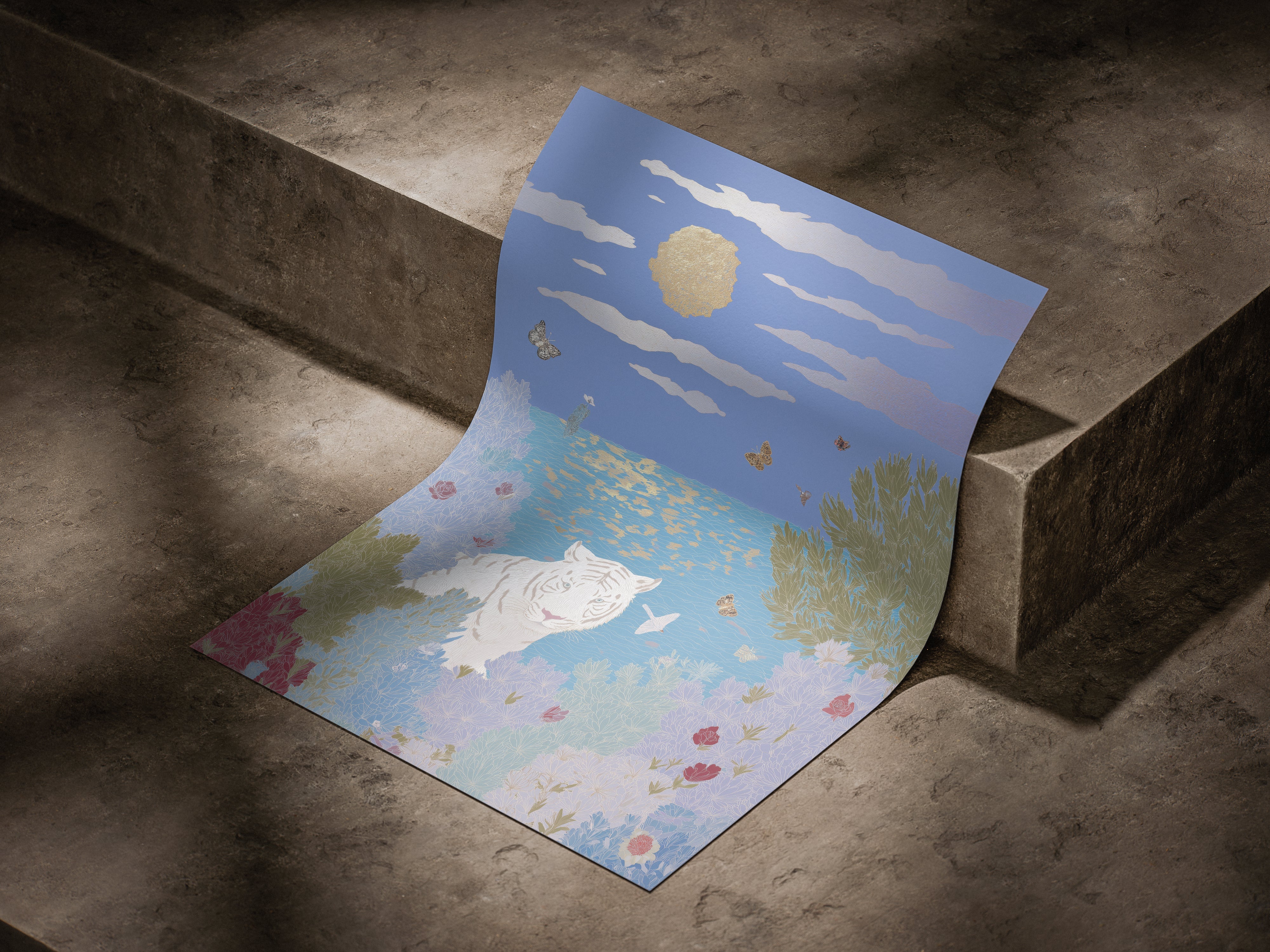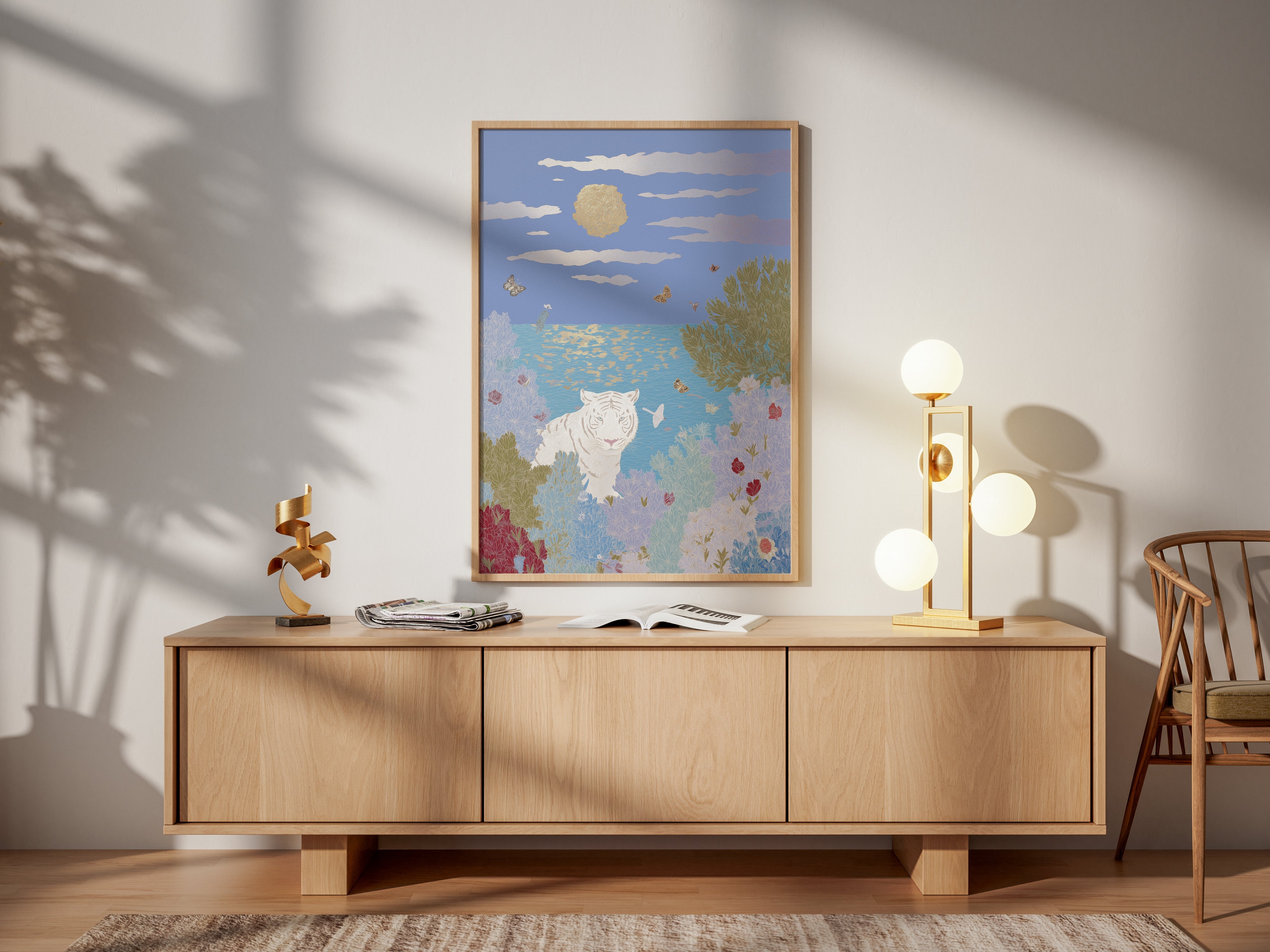Set beneath a quiet golden sun, a white tiger emerges calmly from a dreamlike landscape of water, flowers, and drifting wings. Delicate textures and soft hues blur the line between reality and myth, creating a sense of balance between strength and serenity. White Silence speaks of inner power held gently an atmosphere where nature, spirit, and stillness exist in perfect harmony.