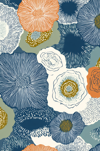 Yüzey boyunca açılan, koyu mavi ve sıcak tonlardaki katmanlı çiçek motifleri, sürekli ve nazik bir hareket halindeki doğanın sakin ve modern bir yorumunu çağrıştırıyor.