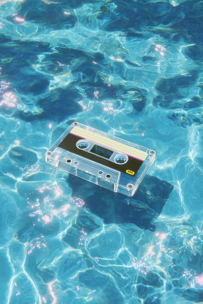 Mavi Anı, nostalji ve dinginlik arasında askıda kalmış sessiz bir anı yakalıyor. Şeffaf bir kaset, sanki sesin, yazın ve zamanın parçalarını taşıyormuş gibi, parıldayan mavi suyun üzerinde nazikçe süzülüyor.