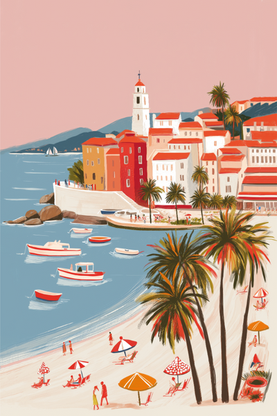 Güneşin aydınlattığı binalar, küçük teknelerin tembelce süzüldüğü ve palmiye ağaçlarının kıyı şeridini çerçevelediği denizin hafif kıvrımının üzerinde yükseliyor. Aşağıda, çizgili şemsiyelerin altında sessiz plaj manzaraları açılıyor ve Akdeniz öğleden sonralarının zahmetsiz ritmini yakalıyor. Sıcaklığın, rengin ve zamanın yavaş akışının basit lüksünün bir kutlaması.