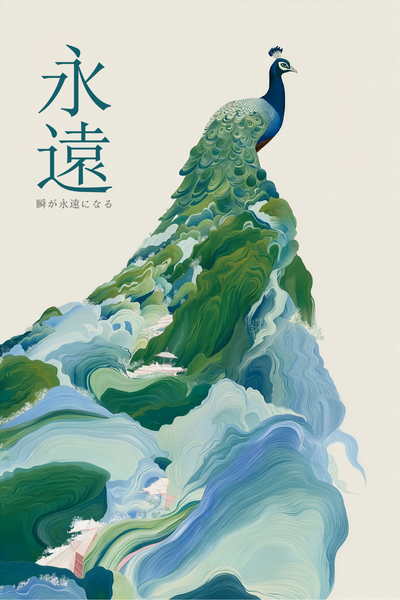 Canlı bir dağ gibi yükselen tavus kuşu, zamanın bekçisi olarak duruyor; akıcı formu, sabır ve süreklilikle şekillenen manzaraları yankılıyor.