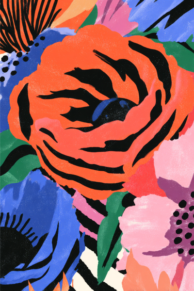Cesur renkler ve etkileyici biçimler, ısı ve hareketle yükselen, tavizsiz bir şekilde canlı olan bir çiçeği yansıtıyor.