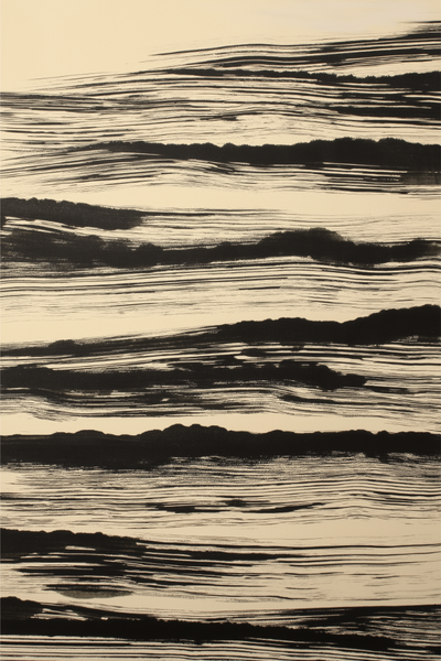 Yumuşak, yatay mürekkep fırça darbeleri, soluk, toprak tonlarındaki bir yüzey üzerinde yayılıyor ve sakin bir tekrar duygusu yaratıyor. Eser, hareketin acele olmadan var olduğu ve sessizliğin kendi derinliğini taşıdığı, kısıtlamanın güzelliğini yansıtıyor. Her mekana denge ve sessiz bir güç getiren, düşünmeye sevk eden bir çalışma.