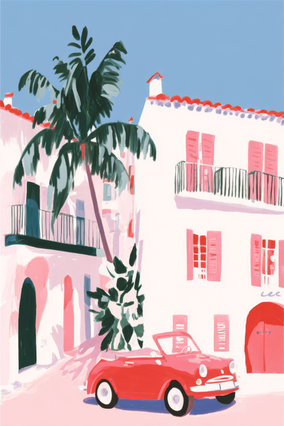 Pastel tonlardaki mimari ve yemyeşil bitki örtüsünün arasında, güneş ışığıyla aydınlanmış bir sokakta klasik bir araba duruyor. Kompozisyon, neşeli ama aynı zamanda zarif bir havayı yansıtarak, telaşsız günlerin, ılık esintilerin ve rahat bir tempoda yaşanan hayatın keyfini kutluyor.