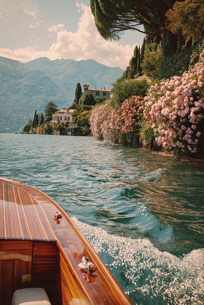 Özel Yaz, zümrüt yeşili sular üzerinde süzülen, pembe çiçeklerle bezenmiş ve güneşten ısınmış villalarla çevrili kıyı şeridinde hafif dalgalar oluşturan cilalı ahşap bir teknenin samimi bir kaçamağını yakalıyor. Uzakta sessizce yükselen dağlar, el değmemiş ve kişisel hissettiren bir dünyayı koruyor.
