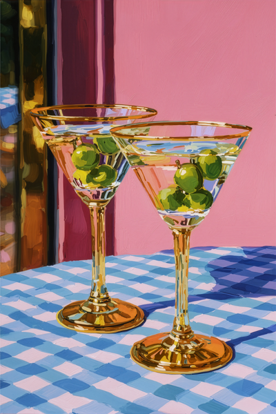 Kareli bir masanın üzerinde, bardaklar sabırla, dolu ama dokunulmamış halde bekliyor. Odada yumuşak bir sessizlik hakim; bu sessizlik, hikayelere, anılara ve birlikte olmanın basit zevkine yönelik sessiz bir kadeh kaldırma anının yakında yaşanacağını düşündürüyor.