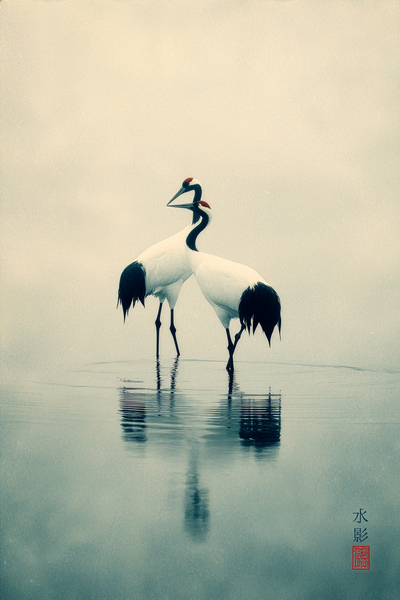 Sakin suda birbirinin aynısı iki figür duruyor, varlıkları nazik ve doğal.