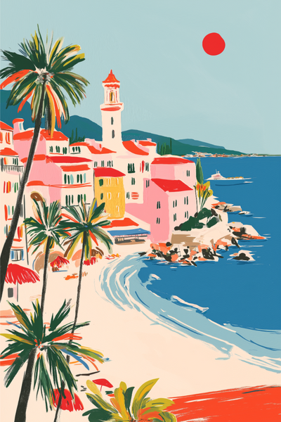 Sıcak bir ışıkla yıkanmış, parlayan güneşin altında bir sahil kasabası gözlerinizin önüne seriliyor. Palmiye ağaçları pastel renkli cephelerin üzerinde nazikçe sallanırken, deniz kıyı boyunca yumuşakça kıvrılıyor. Bu sanat eseri, günlerin yavaşça aktığı ve rengin bir yaşam biçimi haline geldiği Akdeniz'in rahat ve zarif atmosferini yakalıyor.